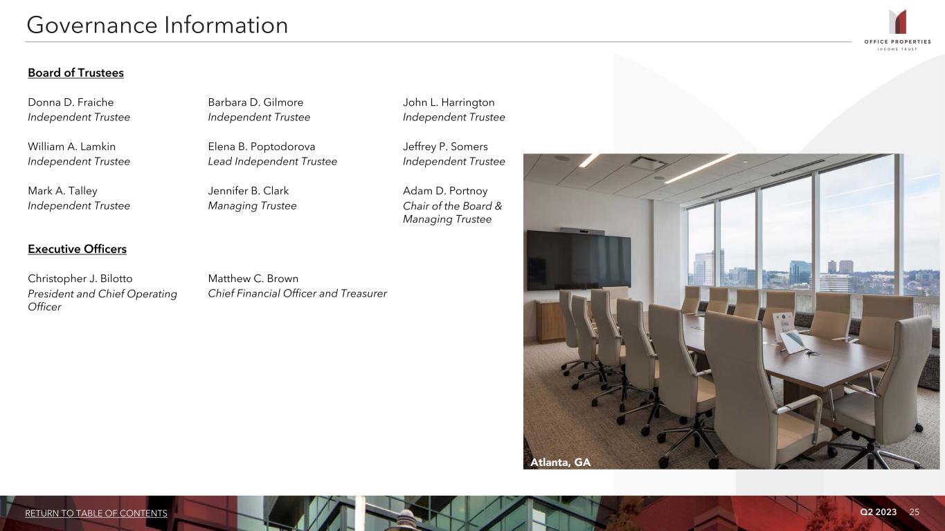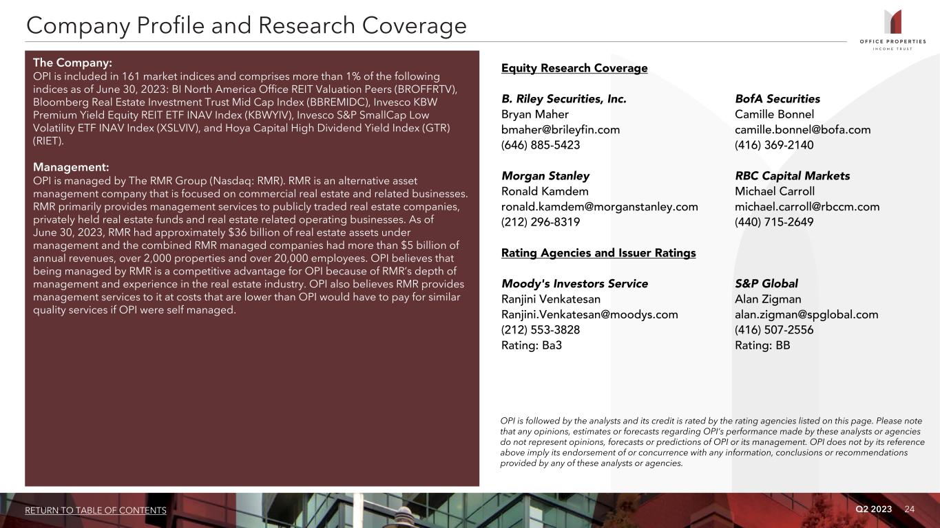 Q2 2023 24RETURN TO TABLE OF CONTENTS The Company: OPI is included in 161 market indices and comprises more than 1% of the following indices as of June 30, 2023: BI North America Office REIT Valuation Peers (BROFFRTV), Bloomberg Real Estate Investment Trust Mid Cap Index (BBREMIDC), Invesco KBW Premium Yield Equity REIT ETF INAV Index (KBWYIV), Invesco S&P SmallCap Low Volatility ETF INAV Index (XSLVIV), and Hoya Capital High Dividend Yield Index (GTR) (RIET). Management: OPI is managed by The RMR Group (Nasdaq: RMR). RMR is an alternative asset management company that is focused on commercial real estate and related businesses. RMR primarily provides management services to publicly traded real estate companies, privately held real estate funds and real estate related operating businesses. As of June 30, 2023, RMR had approximately $36 billion of real estate assets under management and the combined RMR managed companies had more than $5 billion of annual revenues, over 2,000 properties and over 20,000 employees. OPI believes that being managed by RMR is a competitive advantage for OPI because of RMR’s depth of management and experience in the real estate industry. OPI also believes RMR provides management services to it at costs that are lower than OPI would have to pay for similar quality services if OPI were self managed. Company Profile and Research Coverage Equity Research Coverage B. Riley Securities, Inc. BofA Securities Bryan Maher Camille Bonnel bmaher@brileyfin.com camille.bonnel@bofa.com (646) 885-5423 (416) 369-2140 Morgan Stanley RBC Capital Markets Ronald Kamdem Michael Carroll ronald.kamdem@morganstanley.com michael.carroll@rbccm.com (212) 296-8319 (440) 715-2649 Rating Agencies and Issuer Ratings Moody's Investors Service S&P Global Ranjini Venkatesan Alan Zigman Ranjini.Venkatesan@moodys.com alan.zigman@spglobal.com (212) 553-3828 (416) 507-2556 Rating: Ba3 Rating: BB OPI is followed by the analysts and its credit is rated by the rating agencies listed on this page. Please note that any opinions, estimates or forecasts regarding OPI’s performance made by these analysts or agencies do not represent opinions, forecasts or predictions of OPI or its management. OPI does not by its reference above imply its endorsement of or concurrence with any information, conclusions or recommendations provided by any of these analysts or agencies.