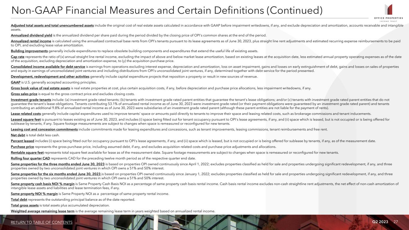 Q2 2023 26RETURN TO TABLE OF CONTENTS Non-GAAP Financial Measures OPI presents certain “non-GAAP financial measures” within the meaning of the applicable rules of the Securities and Exchange Commission (SEC), including NOI, Cash Basis NOI, Same Property NOI, Same Property Cash Basis NOI, EBITDA, EBITDAre, Adjusted EBITDAre, FFO, Normalized FFO and CAD. These measures do not represent cash generated by operating activities in accordance with GAAP and should not be considered alternatives to net income (loss) as indicators of OPI's operating performance or as measures of OPI's liquidity. These measures should be considered in conjunction with net income (loss) as presented in OPI's condensed consolidated statements of income (loss). OPI considers these non-GAAP measures to be appropriate supplemental measures of operating performance for a REIT, along with net income (loss). OPI believes these measures provide useful information to investors because by excluding the effects of certain historical amounts, such as depreciation and amortization expense, they may facilitate a comparison of OPI's operating performance between periods and with other REITs and, in the case of NOI, Cash Basis NOI, Same Property NOI and Same Property Cash Basis NOI reflecting only those income and expense items that are generated and incurred at the property level may help both investors and management to understand the operations of OPI's properties. NOI and Cash Basis NOI The calculations of net operating income, or NOI, and Cash Basis NOI exclude certain components of net income (loss) in order to provide results that are more closely related to OPI's property level results of operations. OPI calculates NOI and Cash Basis NOI as shown on page 28 and Same Property NOI and Same Property Cash Basis NOI as shown on page 29. OPI defines NOI as income from OPI's rental of real estate less OPI's property operating expenses. NOI excludes amortization of capitalized tenant improvement costs and leasing commissions that OPI records as depreciation and amortization expense. OPI defines Cash Basis NOI as NOI excluding non-cash straight line rent adjustments, lease value amortization, lease termination fees, if any, and non-cash amortization included in other operating expenses. OPI calculates Same Property NOI and Same Property Cash Basis NOI in the same manner that OPI calculates the corresponding NOI and Cash Basis NOI amounts, except that OPI only includes same properties in calculating Same Property NOI and Same Property Cash Basis NOI. OPI uses NOI, Cash Basis NOI, Same Property NOI and Same Property Cash Basis NOI to evaluate individual and company-wide property level performance. Other real estate companies and REITs may calculate NOI, Cash Basis NOI, Same Property NOI and Same Property Cash Basis NOI differently than OPI does. EBITDA, EBITDAre and Adjusted EBITDAre OPI calculates earnings before interest, taxes, depreciation and amortization, or EBITDA, EBITDA for real estate, or EBITDAre, and Adjusted EBITDAre as shown on page 30. EBITDAre is calculated on the basis defined by The National Association of Real Estate Investment Trusts, or Nareit, which is EBITDA, excluding gains and losses on the sale of real estate, loss on impairment of real estate assets and adjustments to reflect OPI's share of EBITDAre of its unconsolidated joint ventures. In calculating Adjusted EBITDAre, OPI adjusts for the items shown on page 30 and include business management incentive fees, if any, only in the fourth quarter versus the quarter when they are recognized as expense in accordance with GAAP due to their quarterly volatility not necessarily being indicative of OPI's core operating performance and the uncertainty as to whether any such business management incentive fees will be payable when all contingencies for determining such fees are known at the end of the calendar year. Other real estate companies and REITs may calculate EBITDA, EBITDAre and Adjusted EBITDAre differently than OPI does. FFO and Normalized FFO OPI calculates funds from operations, or FFO, and Normalized FFO as shown on page 31. FFO is calculated on the basis defined by Nareit, which is net income (loss), calculated in accordance with GAAP, plus real estate depreciation and amortization of consolidated properties and OPI's proportionate share of the real estate depreciation and amortization of unconsolidated joint venture properties, but excluding impairment charges on real estate assets and any gain or loss on sale of real estate, as well as certain other adjustments currently not applicable to us. In calculating Normalized FFO, OPI adjusts for the other items shown on page 31 and includes business management incentive fees, if any, only in the fourth quarter versus the quarter when they are recognized as an expense in accordance with GAAP due to their quarterly volatility not necessarily being indicative of OPI's core operating performance and the uncertainty as to whether any such business management incentive fees will be payable when all contingencies for determining such fees are known at the end of the calendar year. FFO and Normalized FFO are among the factors considered by OPI's Board of Trustees when determining the amount of distributions to OPI's shareholders. Other factors include, but are not limited to, requirements to maintain OPI's qualification for taxation as a REIT, limitations in OPI's credit agreement and public debt covenants, the availability to OPI of debt and equity capital, OPI's expectation of its future capital requirements and operating performance and OPI's expected needs for and availability of cash to pay its obligations. Other real estate companies and REITs may calculate FFO and Normalized FFO differently than OPI does. Cash Available for Distribution OPI calculates cash available for distribution, or CAD, as shown on page 31. OPI defines CAD as Normalized FFO minus recurring real estate related capital expenditures and a