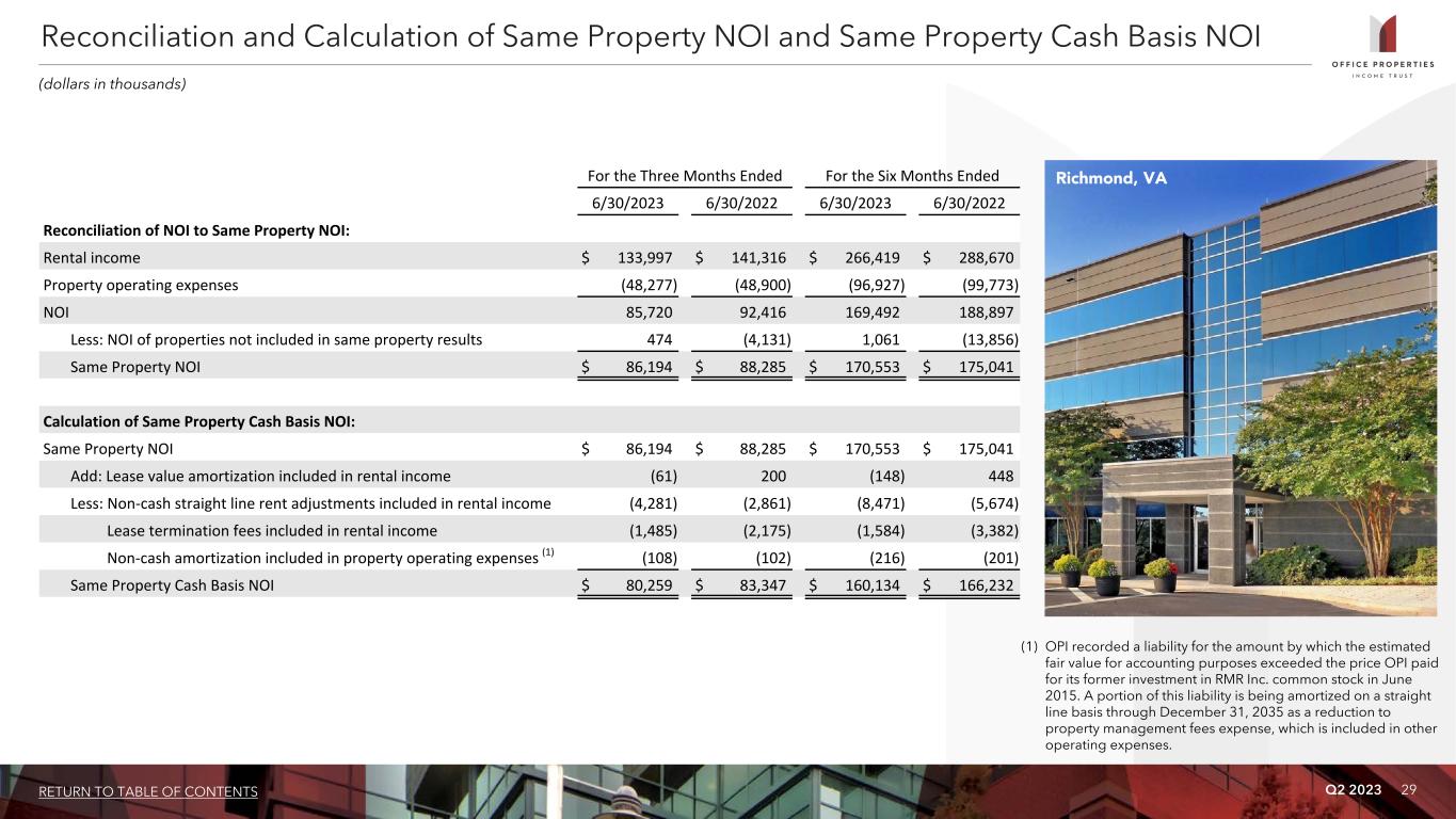 Q2 2023 28RETURN TO TABLE OF CONTENTS For the Three Months Ended For the Six Months Ended 6/30/2023 3/31/2023 12/31/2022 9/30/2022 6/30/2022 6/30/2023 6/30/2022 Calculation of NOI and Cash Basis NOI: Rental income $ 133,997 $ 132,422 $ 127,922 $ 137,683 $ 141,316 $ 266,419 $ 288,670 Property operating expenses (48,277) (48,650) (43,305) (52,137) (48,900) (96,927) (99,773) NOI 85,720 83,772 84,617 85,546 92,416 169,492 188,897 Non-cash straight line rent adjustments included in rental income (4,256) (4,173) (3,604) (1,765) (2,775) (8,429) (5,461) Lease value amortization included in rental income (61) (79) 195 204 233 (140) 576 Lease termination fees included in rental income (1,485) (99) (176) (83) (2,175) (1,584) (7,117) Non-cash amortization included in property operating expenses (1) (121) (121) (121) (121) (121) (242) (242) Cash Basis NOI $ 79,797 $ 79,300 $ 80,911 $ 83,781 $ 87,578 $ 159,097 $ 176,653 Reconciliation of Net Income (Loss) to NOI and Cash Basis NOI: Net income (loss) $ (12,242) $ (446) $ 6,390 $ 16,964 $ (16,056) $ (12,688) $ (29,463) Equity in net losses of investees 691 834 878 952 833 1,525 1,679 Income tax expense (benefit) 211 30 (161) 90 (190) 241 341 Income (loss) before income tax expense (benefit) and equity in net losses of investees (11,340) 418 7,107 18,006 (15,413) (10,922) (27,443) (Gain) loss on early extinguishment of debt — — (759) — 77 — 77 Interest expense 26,525 25,231 24,557 24,969 26,515 51,756 53,954 Interest and other income (337) (164) (144) (56) (16) (501) (17) (Gain) loss on sale of real estate 2,305 (2,548) (3,564) (16,925) 11,637 (243) 9,488 General and administrative 5,785 5,925 5,781 6,564 7,083 11,710 12,789 Acquisition and transaction related costs 11,181 3,218 68 — 224 14,399 224 Loss on impairment of real estate — — — — 4,773 — 21,820 Depreciation and amortization 51,601 51,692 51,571 52,988 57,536 103,293 118,005 NOI 85,720 83,772 84,617 85,546 92,416 169,492 188,897 Non-cash amortization included in property operating expenses (1) (121) (121) (121) (121) (121) (242) (242) Lease termination fees included in rental income (1,485) (99) (176) (83) (2,175) (1,584) (7,117) Lease value amortization included in rental income (61) (79) 195 204 233 (140) 576 Non-cash straight line rent adjustments included in rental income (4,256) (4,173) (3,604) (1,765) (2,775) (8,429) (5,461) Cash Basis NOI $ 79,797 $ 79,300 $ 80,911 $ 83,781 $ 87,578 $ 159,097 $ 176,653 (1) OPI recorded a liability for the amount by which the estimated fair value for accounting purposes exceeded the price OPI paid for its former investment in RMR Inc. common stock in June 2015. A portion of this liability is being amortized on a straight line basis through December 31, 2035 as a reduction to property management fees expense, which is included in property operating expenses. Calculation and Reconciliation of NOI and Cash Basis NOI (dollars in thousands)