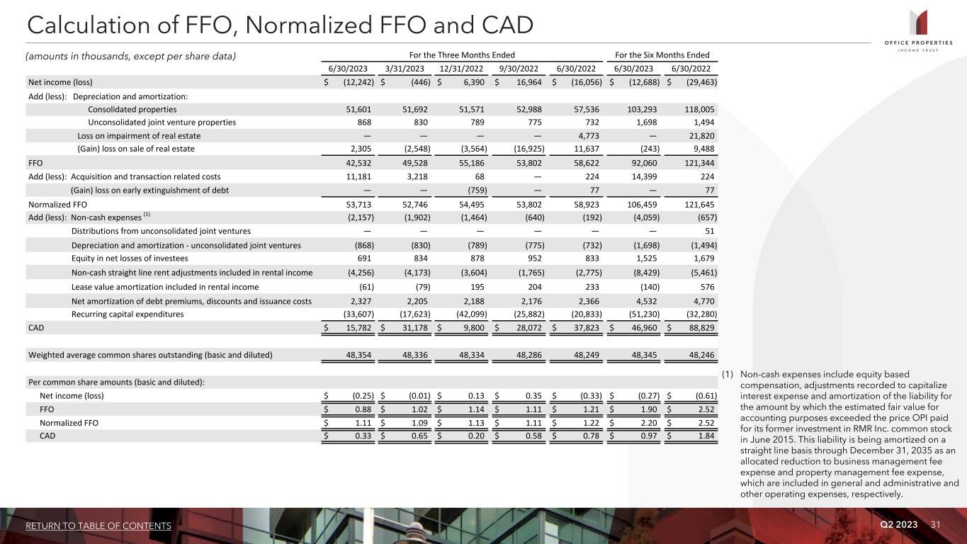 Q2 2023 30RETURN TO TABLE OF CONTENTS For the Three Months Ended For the Six Months Ended 6/30/2023 3/31/2023 12/31/2022 9/30/2022 6/30/2022 6/30/2023 6/30/2022 Net income (loss) $ (12,242) $ (446) $ 6,390 $ 16,964 $ (16,056) $ (12,688) $ (29,463) Add (less): Interest expense 26,525 25,231 24,557 24,969 26,515 51,756 53,954 Income tax expense (benefit) 211 30 (161) 90 (190) 241 341 Depreciation and amortization 51,601 51,692 51,571 52,988 57,536 103,293 118,005 EBITDA 66,095 76,507 82,357 95,011 67,805 142,602 142,837 Add (less): Loss on impairment of real estate — — — — 4,773 — 21,820 (Gain) loss on sale of real estate 2,305 (2,548) (3,564) (16,925) 11,637 (243) 9,488 Distributions received from unconsolidated joint ventures — — — — — — 51 Equity in losses of unconsolidated joint ventures 691 834 878 952 833 1,525 1,679 EBITDAre 69,091 74,793 79,671 79,038 85,048 143,884 175,875 Add (less): Acquisition and transaction related costs 11,181 3,218 68 — 224 14,399 224 General and administrative expense paid in common shares (1) 741 476 499 919 1,073 1,217 1,487 (Gain) loss on early extinguishment of debt — — (759) — 77 — 77 Adjusted EBITDAre $ 81,013 $ 78,487 $ 79,479 $ 79,957 $ 86,422 $ 159,500 $ 177,663 Calculation of EBITDA, EBITDAre and Adjusted EBITDAre (dollars in thousands) (1) Amounts represent equity based compensation to OPI's Trustees, OPI's officers and certain other employees of RMR.