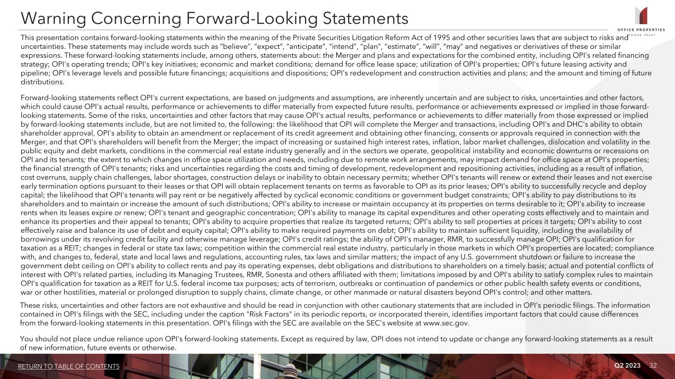 Q2 2023 32RETURN TO TABLE OF CONTENTS Warning Concerning Forward-Looking Statements This presentation contains forward-looking statements within the meaning of the Private Securities Litigation Reform Act of 1995 and other securities laws that are subject to risks and uncertainties. These statements may include words such as “believe”, “expect”, “anticipate”, “intend”, “plan”, “estimate”, “will”, “may” and negatives or derivatives of these or similar expressions. These forward-looking statements include, among others, statements about: the Merger and plans and expectations for the combined entity, including OPI's related financing strategy; OPI's operating trends; OPI's key initiatives; economic and market conditions; demand for office lease space; utilization of OPI's properties; OPI's future leasing activity and pipeline; OPI's leverage levels and possible future financings; acquisitions and dispositions; OPI's redevelopment and construction activities and plans; and the amount and timing of future distributions. Forward-looking statements reflect OPI's current expectations, are based on judgments and assumptions, are inherently uncertain and are subject to risks, uncertainties and other factors, which could cause OPI's actual results, performance or achievements to differ materially from expected future results, performance or achievements expressed or implied in those forward- looking statements. Some of the risks, uncertainties and other factors that may cause OPI's actual results, performance or achievements to differ materially from those expressed or implied by forward-looking statements include, but are not limited to, the following: the likelihood that OPI will complete the Merger and transactions, including OPI's and DHC's ability to obtain shareholder approval, OPI's ability to obtain an amendment or replacement of its credit agreement and obtaining other financing, consents or approvals required in connection with the Merger, and that OPI's shareholders will benefit from the Merger; the impact of increasing or sustained high interest rates, inflation, labor market challenges, dislocation and volatility in the public equity and debt markets, conditions in the commercial real estate industry generally and in the sectors we operate, geopolitical instability and economic downturns or recessions on OPI and its tenants; the extent to which changes in office space utilization and needs, including due to remote work arrangements, may impact demand for office space at OPI's properties; the financial strength of OPI's tenants; risks and uncertainties regarding the costs and timing of development, redevelopment and repositioning activities, including as a result of inflation, cost overruns, supply chain challenges, labor shortages, construction delays or inability to obtain necessary permits; whether OPI's tenants will renew or extend their leases and not exercise early termination options pursuant to their leases or that OPI will obtain replacement tenants on terms as favorable to OPI as its prior leases; OPI's ability to successfully recycle and deploy capital; the likelihood that OPI's tenants will pay rent or be negatively affected by cyclical economic conditions or government budget constraints; OPI's ability to pay distributions to its shareholders and to maintain or increase the amount of such distributions; OPI's ability to increase or maintain occupancy at its properties on terms desirable to it; OPI's ability to increase rents when its leases expire or renew; OPI's tenant and geographic concentration; OPI's ability to manage its capital expenditures and other operating costs effectively and to maintain and enhance its properties and their appeal to tenants; OPI's ability to acquire properties that realize its targeted returns; OPI's ability to sell properties at prices it targets; OPI's ability to cost effectively raise and balance its use of debt and equity capital; OPI's ability to make required payments on debt; OPI's ability to maintain sufficient liquidity, including the availability of borrowings under its revolving credit facility and otherwise manage leverage; OPI's credit ratings; the ability of OPI's manager, RMR, to successfully manage OPI; OPI's qualification for taxation as a REIT; changes in federal or state tax laws; competition within the commercial real estate industry, particularly in those markets in which OPI's properties are located; compliance with, and changes to, federal, state and local laws and regulations, accounting rules, tax laws and similar matters; the impact of any U.S. government shutdown or failure to increase the government debt ceiling on OPI's ability to collect rents and pay its operating expenses, debt obligations and distributions to shareholders on a timely basis; actual and potential conflicts of interest with OPI's related parties, including its Managing Trustees, RMR, Sonesta and others affiliated with them; limitations imposed by and OPI's ability to satisfy complex rules to maintain OPI's qualification for taxation as a REIT for U.S. federal income tax purposes; acts of terrorism, outbreaks or continuation of pandemics or other public health safety events or conditions, war or other hostilities, material or prolonged disruption to supply chains, climate change, or other manmade or natural disasters beyond OPI's control; and other matters. These risks, uncertainties and other factors are not exhaustive and should be read in conjunction with other cautionary statements that are included in OPI's periodic filings. The information contained in OPI's filings with the SEC, including under the caption "Risk Factors" in its periodic reports, or incorporated therein, identifies important factors that could cause differences from the forward-looking statements in this presentation. OPI's filings with the SEC are available on the SEC's website at www.sec.gov. You should not place undue reliance upon OPI's for