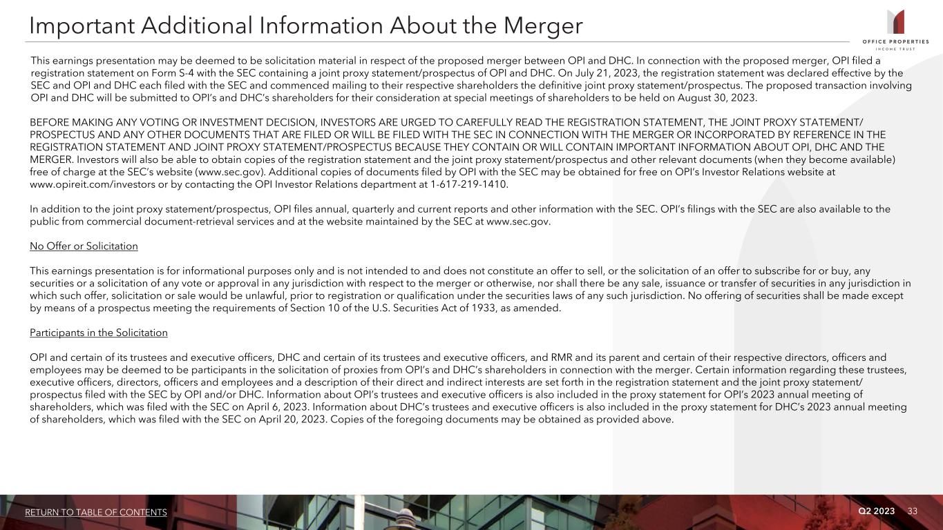 Q2 2023 32RETURN TO TABLE OF CONTENTS Warning Concerning Forward-Looking Statements This presentation contains forward-looking statements within the meaning of the Private Securities Litigation Reform Act of 1995 and other securities laws that are subject to risks and uncertainties. These statements may include words such as “believe”, “expect”, “anticipate”, “intend”, “plan”, “estimate”, “will”, “may” and negatives or derivatives of these or similar expressions. These forward-looking statements include, among others, statements about: the Merger and plans and expectations for the combined entity, including OPI's related financing strategy; OPI's operating trends; OPI's key initiatives; economic and market conditions; demand for office lease space; utilization of OPI's properties; OPI's future leasing activity and pipeline; OPI's leverage levels and possible future financings; acquisitions and dispositions; OPI's redevelopment and construction activities and plans; and the amount and timing of future distributions. Forward-looking statements reflect OPI's current expectations, are based on judgments and assumptions, are inherently uncertain and are subject to risks, uncertainties and other factors, which could cause OPI's actual results, performance or achievements to differ materially from expected future results, performance or achievements expressed or implied in those forward- looking statements. Some of the risks, uncertainties and other factors that may cause OPI's actual results, performance or achievements to differ materially from those expressed or implied by forward-looking statements include, but are not limited to, the following: the likelihood that OPI will complete the Merger and transactions, including OPI's and DHC's ability to obtain shareholder approval, OPI's ability to obtain an amendment or replacement of its credit agreement and obtaining other financing, consents or approvals required in connection with the Merger, and that OPI's shareholders will benefit from the Merger; the impact of increasing or sustained high interest rates, inflation, labor market challenges, dislocation and volatility in the public equity and debt markets, conditions in the commercial real estate industry generally and in the sectors we operate, geopolitical instability and economic downturns or recessions on OPI and its tenants; the extent to which changes in office space utilization and needs, including due to remote work arrangements, may impact demand for office space at OPI's properties; the financial strength of OPI's tenants; risks and uncertainties regarding the costs and timing of development, redevelopment and repositioning activities, including as a result of inflation, cost overruns, supply chain challenges, labor shortages, construction delays or inability to obtain necessary permits; whether OPI's tenants will renew or extend their leases and not exercise early termination options pursuant to their leases or that OPI will obtain replacement tenants on terms as favorable to OPI as its prior leases; OPI's ability to successfully recycle and deploy capital; the likelihood that OPI's tenants will pay rent or be negatively affected by cyclical economic conditions or government budget constraints; OPI's ability to pay distributions to its shareholders and to maintain or increase the amount of such distributions; OPI's ability to increase or maintain occupancy at its properties on terms desirable to it; OPI's ability to increase rents when its leases expire or renew; OPI's tenant and geographic concentration; OPI's ability to manage its capital expenditures and other operating costs effectively and to maintain and enhance its properties and their appeal to tenants; OPI's ability to acquire properties that realize its targeted returns; OPI's ability to sell properties at prices it targets; OPI's ability to cost effectively raise and balance its use of debt and equity capital; OPI's ability to make required payments on debt; OPI's ability to maintain sufficient liquidity, including the availability of borrowings under its revolving credit facility and otherwise manage leverage; OPI's credit ratings; the ability of OPI's manager, RMR, to successfully manage OPI; OPI's qualification for taxation as a REIT; changes in federal or state tax laws; competition within the commercial real estate industry, particularly in those markets in which OPI's properties are located; compliance with, and changes to, federal, state and local laws and regulations, accounting rules, tax laws and similar matters; the impact of any U.S. government shutdown or failure to increase the government debt ceiling on OPI's ability to collect rents and pay its operating expenses, debt obligations and distributions to shareholders on a timely basis; actual and potential conflicts of interest with OPI's related parties, including its Managing Trustees, RMR, Sonesta and others affiliated with them; limitations imposed by and OPI's ability to satisfy complex rules to maintain OPI's qualification for taxation as a REIT for U.S. federal income tax purposes; acts of terrorism, outbreaks or continuation of pandemics or other public health safety events or conditions, war or other hostilities, material or prolonged disruption to supply chains, climate change, or other manmade or natural disasters beyond OPI's control; and other matters. These risks, uncertainties and other factors are not exhaustive and should be read in conjunction with other cautionary statements that are included in OPI's periodic filings. The information contained in OPI's filings with the SEC, including under the caption "Risk Factors" in its periodic reports, or incorporated therein, identifies important factors that could cause differences from the forward-looking statements in this presentation. OPI's filings with the SEC are available on the SEC's website at www.sec.gov. You should not place undue reliance upon OPI's for