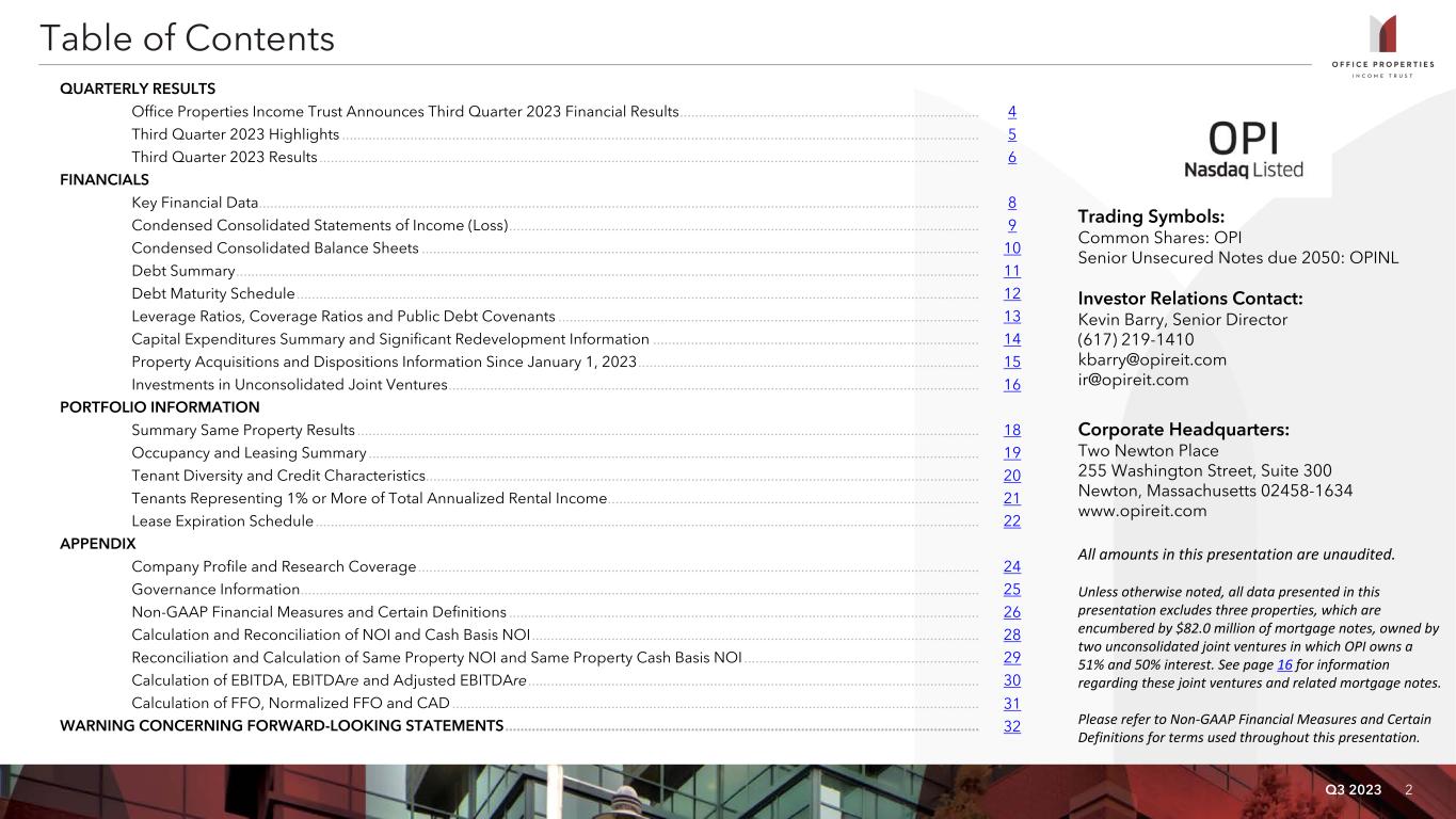 Q3 2023 2 Table of Contents QUARTERLY RESULTS Office Properties Income Trust Announces Third Quarter 2023 Financial Results ............................................................................... 4 Third Quarter 2023 Highlights ........................................................................................................................................................................ 5 Third Quarter 2023 Results .............................................................................................................................................................................. 6 FINANCIALS Key Financial Data.............................................................................................................................................................................................. 8 Condensed Consolidated Statements of Income (Loss) ............................................................................................................................ 9 Condensed Consolidated Balance Sheets ................................................................................................................................................... 10 Debt Summary .................................................................................................................................................................................................... 11 Debt Maturity Schedule .................................................................................................................................................................................... 12 Leverage Ratios, Coverage Ratios and Public Debt Covenants ............................................................................................................... 13 Capital Expenditures Summary and Significant Redevelopment Information ...................................................................................... 14 Property Acquisitions and Dispositions Information Since January 1, 2023 .......................................................................................... 15 Investments in Unconsolidated Joint Ventures ............................................................................................................................................ 16 PORTFOLIO INFORMATION Summary Same Property Results .................................................................................................................................................................... 18 Occupancy and Leasing Summary ................................................................................................................................................................. 19 Tenant Diversity and Credit Characteristics.................................................................................................................................................. 20 Tenants Representing 1% or More of Total Annualized Rental Income .................................................................................................. 21 Lease Expiration Schedule ............................................................................................................................................................................... 22 APPENDIX Company Profile and Research Coverage .................................................................................................................................................... 24 Governance Information ................................................................................................................................................................................... 25 Non-GAAP Financial Measures and Certain Definitions ............................................................................................................................ 26 Calculation and Reconciliation of NOI and Cash Basis NOI ...................................................................................................................... 28 Reconciliation and Calculation of Same Property NOI and Same Property Cash Basis NOI .............................................................. 29 Calculation of EBITDA, EBITDAre and Adjusted EBITDAre ....................................................................................................................... 30 Calculation of FFO, Normalized FFO and CAD ........................................................................................................................................... 31 WARNING CONCERNING FORWARD-LOOKING STATEMENTS ............................................................................................................................. 32 Trading Symbols: Common Shares: OPI Senior Unsecured Notes due 2050: OPINL Investor Relations Contact: Kevin Barry, Senior Director (617) 219-1410 kbarry@opireit.com ir@opireit.com Corporate Headquarters: Two Newton Place 255 Washington Street, Suite 300 Newton, Massachusetts 02458-1634 www.opireit.com All amounts in this presentation are unaudited. Unless otherwise noted, all data presented in this presentation excludes three properties, which are encumbered by $82.0 million of mortgage notes, owned by two unconsolidated joint ventures in which OPI owns a 51% and 50% interest. See page 16 for information regarding these joint ventures and related mortgage notes. Please refer to Non-GAAP Financial Measures and Certain Definitions for terms used throughout this presentation.