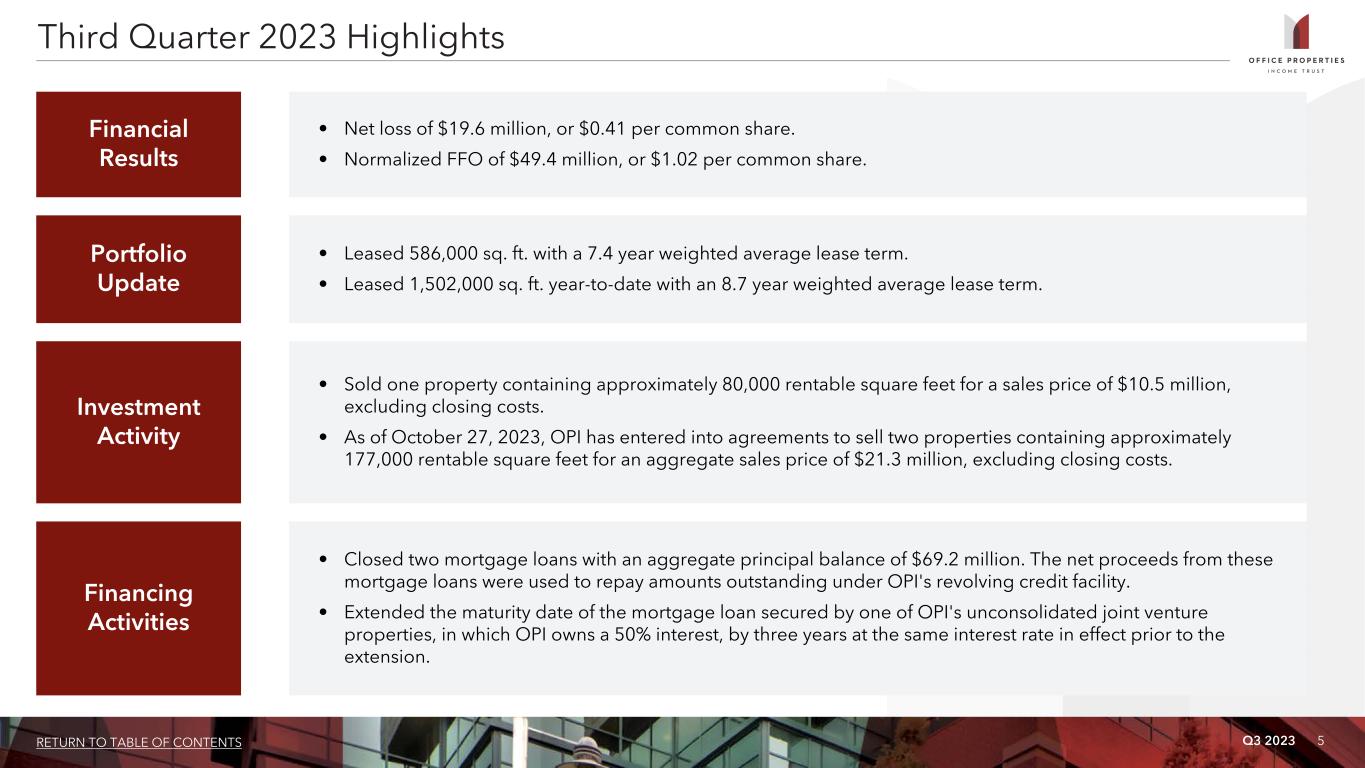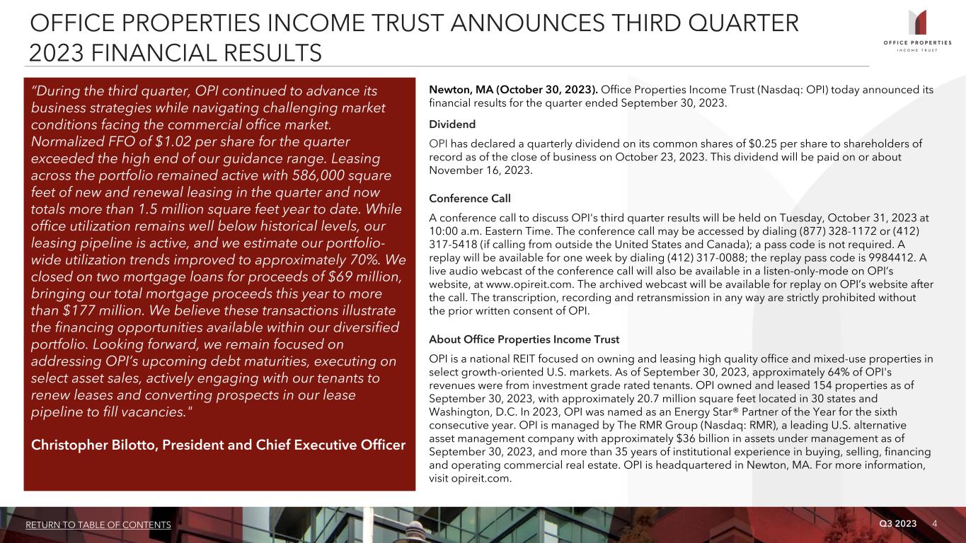 Q3 2023 4RETURN TO TABLE OF CONTENTS OFFICE PROPERTIES INCOME TRUST ANNOUNCES THIRD QUARTER 2023 FINANCIAL RESULTS “During the third quarter, OPI continued to advance its business strategies while navigating challenging market conditions facing the commercial office market. Normalized FFO of $1.02 per share for the quarter exceeded the high end of our guidance range. Leasing across the portfolio remained active with 586,000 square feet of new and renewal leasing in the quarter and now totals more than 1.5 million square feet year to date. While office utilization remains well below historical levels, our leasing pipeline is active, and we estimate our portfolio- wide utilization trends improved to approximately 70%. We closed on two mortgage loans for proceeds of $69 million, bringing our total mortgage proceeds this year to more than $177 million. We believe these transactions illustrate the financing opportunities available within our diversified portfolio. Looking forward, we remain focused on addressing OPI’s upcoming debt maturities, executing on select asset sales, actively engaging with our tenants to renew leases and converting prospects in our lease pipeline to fill vacancies." Christopher Bilotto, President and Chief Executive Officer Newton, MA (October 30, 2023). Office Properties Income Trust (Nasdaq: OPI) today announced its financial results for the quarter ended September 30, 2023. Dividend OPI has declared a quarterly dividend on its common shares of $0.25 per share to shareholders of record as of the close of business on October 23, 2023. This dividend will be paid on or about November 16, 2023. Conference Call A conference call to discuss OPI's third quarter results will be held on Tuesday, October 31, 2023 at 10:00 a.m. Eastern Time. The conference call may be accessed by dialing (877) 328-1172 or (412) 317-5418 (if calling from outside the United States and Canada); a pass code is not required. A replay will be available for one week by dialing (412) 317-0088; the replay pass code is 9984412. A live audio webcast of the conference call will also be available in a listen-only-mode on OPI’s website, at www.opireit.com. The archived webcast will be available for replay on OPI’s website after the call. The transcription, recording and retransmission in any way are strictly prohibited without the prior written consent of OPI. About Office Properties Income Trust OPI is a national REIT focused on owning and leasing high quality office and mixed-use properties in select growth-oriented U.S. markets. As of September 30, 2023, approximately 64% of OPI's revenues were from investment grade rated tenants. OPI owned and leased 154 properties as of September 30, 2023, with approximately 20.7 million square feet located in 30 states and Washington, D.C. In 2023, OPI was named as an Energy Star® Partner of the Year for the sixth consecutive year. OPI is managed by The RMR Group (Nasdaq: RMR), a leading U.S. alternative asset management company with approximately $36 billion in assets under management as of September 30, 2023, and more than 35 years of institutional experience in buying, selling, financing and operating commercial real estate. OPI is headquartered in Newton, MA. For more information, visit opireit.com.