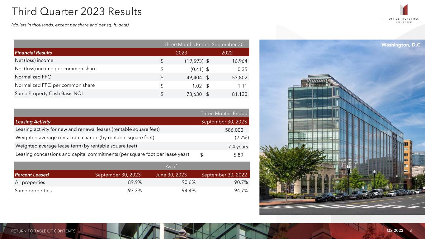Q3 2023 5RETURN TO TABLE OF CONTENTS Third Quarter 2023 Highlights Financial Results • Net loss of $19.6 million, or $0.41 per common share. • Normalized FFO of $49.4 million, or $1.02 per common share. Portfolio Update • Leased 586,000 sq. ft. with a 7.4 year weighted average lease term. • Leased 1,502,000 sq. ft. year-to-date with an 8.7 year weighted average lease term. Investment Activity • Sold one property containing approximately 80,000 rentable square feet for a sales price of $10.5 million, excluding closing costs. • As of October 27, 2023, OPI has entered into agreements to sell two properties containing approximately 177,000 rentable square feet for an aggregate sales price of $21.3 million, excluding closing costs. Financing Activities • Closed two mortgage loans with an aggregate principal balance of $69.2 million. The net proceeds from these mortgage loans were used to repay amounts outstanding under OPI's revolving credit facility. • Extended the maturity date of the mortgage loan secured by one of OPI's unconsolidated joint venture properties, in which OPI owns a 50% interest, by three years at the same interest rate in effect prior to the extension.