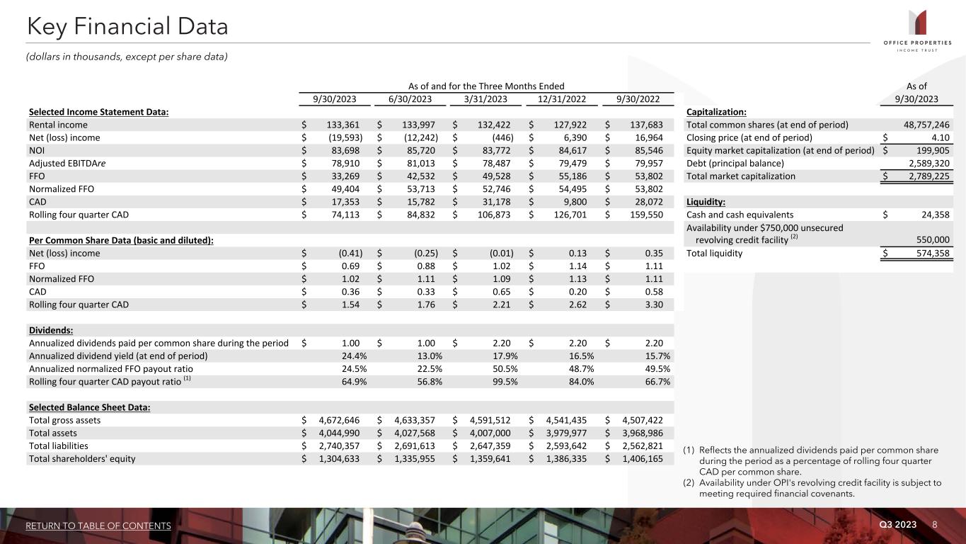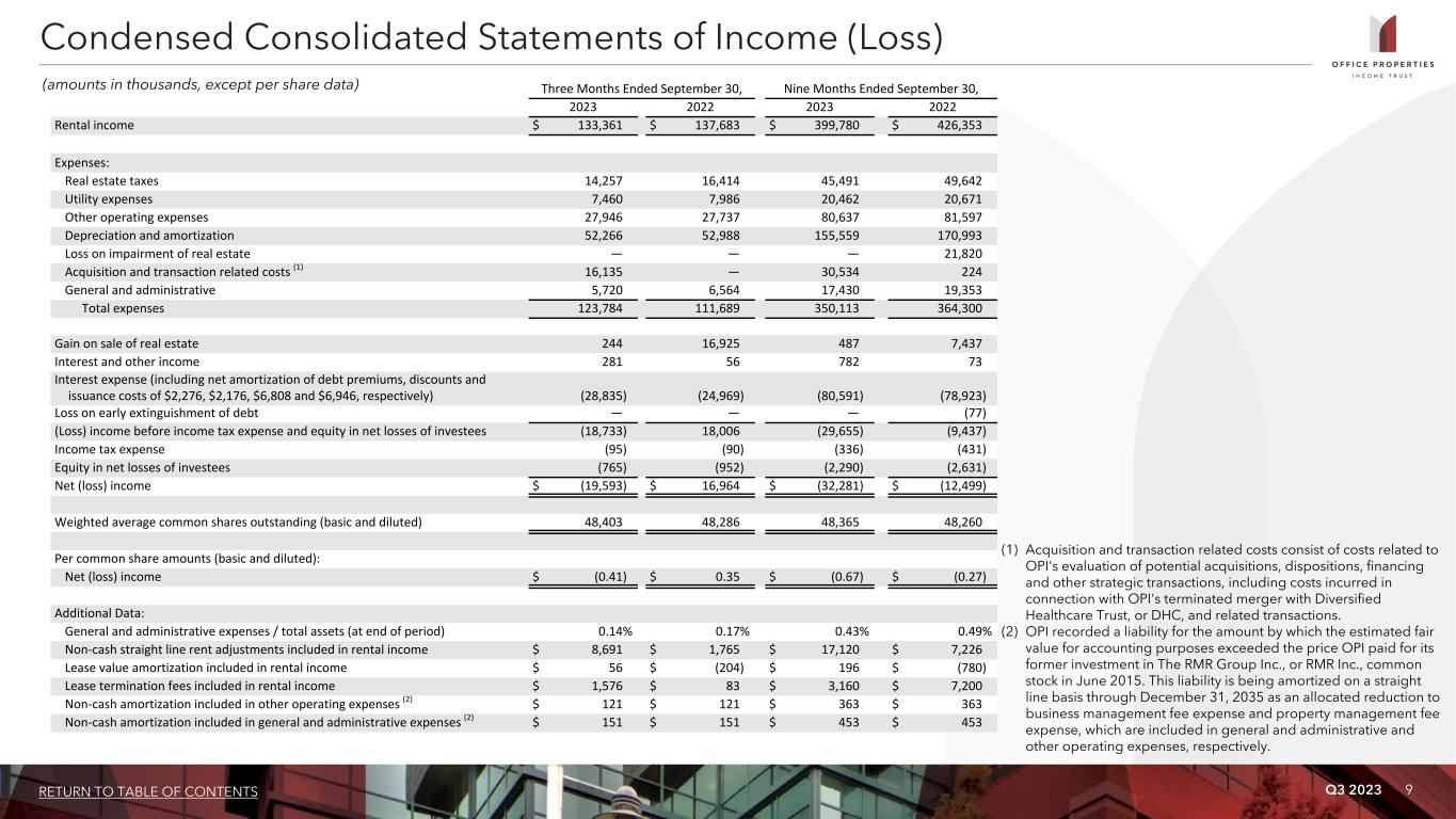 Q3 2023 8RETURN TO TABLE OF CONTENTS As of and for the Three Months Ended As of 9/30/2023 6/30/2023 3/31/2023 12/31/2022 9/30/2022 9/30/2023 Selected Income Statement Data: Capitalization: Rental income $ 133,361 $ 133,997 $ 132,422 $ 127,922 $ 137,683 Total common shares (at end of period) 48,757,246 Net (loss) income $ (19,593) $ (12,242) $ (446) $ 6,390 $ 16,964 Closing price (at end of period) $ 4.10 NOI $ 83,698 $ 85,720 $ 83,772 $ 84,617 $ 85,546 Equity market capitalization (at end of period) $ 199,905 Adjusted EBITDAre $ 78,910 $ 81,013 $ 78,487 $ 79,479 $ 79,957 Debt (principal balance) 2,589,320 FFO $ 33,269 $ 42,532 $ 49,528 $ 55,186 $ 53,802 Total market capitalization $ 2,789,225 Normalized FFO $ 49,404 $ 53,713 $ 52,746 $ 54,495 $ 53,802 CAD $ 17,353 $ 15,782 $ 31,178 $ 9,800 $ 28,072 Liquidity: Rolling four quarter CAD $ 74,113 $ 84,832 $ 106,873 $ 126,701 $ 159,550 Cash and cash equivalents $ 24,358 Availability under $750,000 unsecured revolving credit facility (2) 550,000 Per Common Share Data (basic and diluted): Net (loss) income $ (0.41) $ (0.25) $ (0.01) $ 0.13 $ 0.35 Total liquidity $ 574,358 FFO $ 0.69 $ 0.88 $ 1.02 $ 1.14 $ 1.11 Normalized FFO $ 1.02 $ 1.11 $ 1.09 $ 1.13 $ 1.11 CAD $ 0.36 $ 0.33 $ 0.65 $ 0.20 $ 0.58 Rolling four quarter CAD $ 1.54 $ 1.76 $ 2.21 $ 2.62 $ 3.30 Dividends: Annualized dividends paid per common share during the period $ 1.00 $ 1.00 $ 2.20 $ 2.20 $ 2.20 Annualized dividend yield (at end of period) 24.4% 13.0% 17.9% 16.5% 15.7% Annualized normalized FFO payout ratio 24.5% 22.5% 50.5% 48.7% 49.5% Rolling four quarter CAD payout ratio (1) 64.9% 56.8% 99.5% 84.0% 66.7% Selected Balance Sheet Data: Total gross assets $ 4,672,646 $ 4,633,357 $ 4,591,512 $ 4,541,435 $ 4,507,422 Total assets $ 4,044,990 $ 4,027,568 $ 4,007,000 $ 3,979,977 $ 3,968,986 Total liabilities $ 2,740,357 $ 2,691,613 $ 2,647,359 $ 2,593,642 $ 2,562,821 Total shareholders' equity $ 1,304,633 $ 1,335,955 $ 1,359,641 $ 1,386,335 $ 1,406,165 (dollars in thousands, except per share data) Key Financial Data (1) Reflects the annualized dividends paid per common share during the period as a percentage of rolling four quarter CAD per common share. (2) Availability under OPI's revolving credit facility is subject to meeting required financial covenants.