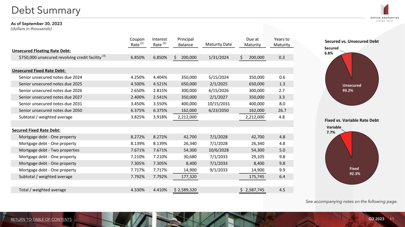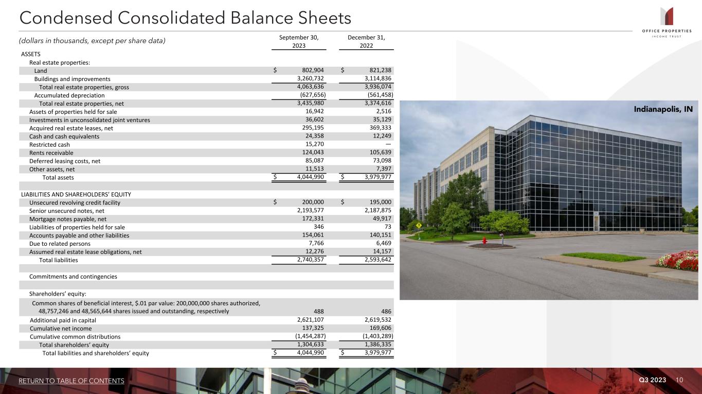 Q3 2023 9RETURN TO TABLE OF CONTENTS Three Months Ended September 30, Nine Months Ended September 30, 2023 2022 2023 2022 Rental income $ 133,361 $ 137,683 $ 399,780 $ 426,353 Expenses: Real estate taxes 14,257 16,414 45,491 49,642 Utility expenses 7,460 7,986 20,462 20,671 Other operating expenses 27,946 27,737 80,637 81,597 Depreciation and amortization 52,266 52,988 155,559 170,993 Loss on impairment of real estate — — — 21,820 Acquisition and transaction related costs (1) 16,135 — 30,534 224 General and administrative 5,720 6,564 17,430 19,353 Total expenses 123,784 111,689 350,113 364,300 Gain on sale of real estate 244 16,925 487 7,437 Interest and other income 281 56 782 73 Interest expense (including net amortization of debt premiums, discounts and issuance costs of $2,276, $2,176, $6,808 and $6,946, respectively) (28,835) (24,969) (80,591) (78,923) Loss on early extinguishment of debt — — — (77) (Loss) income before income tax expense and equity in net losses of investees (18,733) 18,006 (29,655) (9,437) Income tax expense (95) (90) (336) (431) Equity in net losses of investees (765) (952) (2,290) (2,631) Net (loss) income $ (19,593) $ 16,964 $ (32,281) $ (12,499) Weighted average common shares outstanding (basic and diluted) 48,403 48,286 48,365 48,260 Per common share amounts (basic and diluted): Net (loss) income $ (0.41) $ 0.35 $ (0.67) $ (0.27) Additional Data: General and administrative expenses / total assets (at end of period) 0.14% 0.17% 0.43% 0.49% Non-cash straight line rent adjustments included in rental income $ 8,691 $ 1,765 $ 17,120 $ 7,226 Lease value amortization included in rental income $ 56 $ (204) $ 196 $ (780) Lease termination fees included in rental income $ 1,576 $ 83 $ 3,160 $ 7,200 Non-cash amortization included in other operating expenses (2) $ 121 $ 121 $ 363 $ 363 Non-cash amortization included in general and administrative expenses (2) $ 151 $ 151 $ 453 $ 453 (amounts in thousands, except per share data) (1) Acquisition and transaction related costs consist of costs related to OPI's evaluation of potential acquisitions, dispositions, financing and other strategic transactions, including costs incurred in connection with OPI's terminated merger with Diversified Healthcare Trust, or DHC, and related transactions. (2) OPI recorded a liability for the amount by which the estimated fair value for accounting purposes exceeded the price OPI paid for its former investment in The RMR Group Inc., or RMR Inc., common stock in June 2015. This liability is being amortized on a straight line basis through December 31, 2035 as an allocated reduction to business management fee expense and property management fee expense, which are included in general and administrative and other operating expenses, respectively. Condensed Consolidated Statements of Income (Loss)