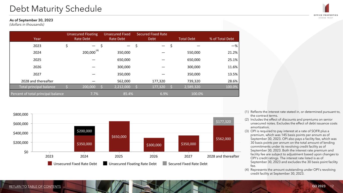 Q3 2023 11RETURN TO TABLE OF CONTENTS Fixed vs. Variable Rate Debt Fixed 92.3% Variable 7.7% Coupon Rate (1) Interest Rate (2) Principal Balance Maturity Date Due at Maturity Years to Maturity Unsecured Floating Rate Debt: $750,000 unsecured revolving credit facility (3) 6.850% 6.850% $ 200,000 1/31/2024 $ 200,000 0.3 Unsecured Fixed Rate Debt: Senior unsecured notes due 2024 4.250% 4.404% 350,000 5/15/2024 350,000 0.6 Senior unsecured notes due 2025 4.500% 4.521% 650,000 2/1/2025 650,000 1.3 Senior unsecured notes due 2026 2.650% 2.815% 300,000 6/15/2026 300,000 2.7 Senior unsecured notes due 2027 2.400% 2.541% 350,000 2/1/2027 350,000 3.3 Senior unsecured notes due 2031 3.450% 3.550% 400,000 10/15/2031 400,000 8.0 Senior unsecured notes due 2050 6.375% 6.375% 162,000 6/23/2050 162,000 26.7 Subtotal / weighted average 3.825% 3.918% 2,212,000 2,212,000 4.8 Secured Fixed Rate Debt: Mortgage debt - One property 8.272% 8.272% 42,700 7/1/2028 42,700 4.8 Mortgage debt - One property 8.139% 8.139% 26,340 7/1/2028 26,340 4.8 Mortgage debt - Two properties 7.671% 7.671% 54,300 10/6/2028 54,300 5.0 Mortgage debt - One property 7.210% 7.210% 30,680 7/1/2033 29,105 9.8 Mortgage debt - One property 7.305% 7.305% 8,400 7/1/2033 8,400 9.8 Mortgage debt - One property 7.717% 7.717% 14,900 9/1/2033 14,900 9.9 Subtotal / weighted average 7.792% 7.792% 177,320 175,745 6.4 Total / weighted average 4.330% 4.410% $ 2,589,320 $ 2,587,745 4.5 See accompanying notes on the following page. Secured vs. Unsecured Debt Unsecured 93.2% Secured 6.8% Debt Summary As of September 30, 2023 (dollars in thousands)