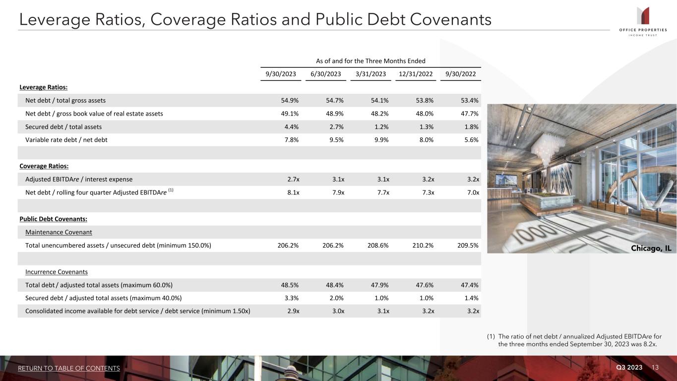 Q3 2023 12RETURN TO TABLE OF CONTENTS $— $350,000 $650,000 $300,000 $350,000 $562,000 $200,000 $177,320 Unsecured Fixed Rate Debt Unsecured Floating Rate Debt Secured Fixed Rate Debt 2023 2024 2025 2026 2027 2028 and thereafter $0 $200,000 $400,000 $600,000 $800,000 Year Unsecured Floating Rate Debt Unsecured Fixed Rate Debt Secured Fixed Rate Debt Total Debt % of Total Debt 2023 $ — $ — $ — $ — —% 2024 200,000 350,000 — 550,000 21.2% 2025 — 650,000 — 650,000 25.1% 2026 — 300,000 — 300,000 11.6% 2027 — 350,000 — 350,000 13.5% 2028 and thereafter — 562,000 177,320 739,320 28.6% Total principal balance $ 200,000 $ 2,212,000 $ 177,320 $ 2,589,320 100.0% Percent of total principal balance 7.7% 85.4% 6.9% 100.0% Debt Maturity Schedule As of September 30, 2023 (dollars in thousands) (1) Reflects the interest rate stated in, or determined pursuant to, the contract terms. (2) Includes the effect of discounts and premiums on senior unsecured notes. Excludes the effect of debt issuance costs amortization. (3) OPI is required to pay interest at a rate of SOFR plus a premium, which was 145 basis points per annum as of September 30, 2023. OPI also pays a facility fee, which was 30 basis points per annum on the total amount of lending commitments under its revolving credit facility as of September 30, 2023. Both the interest rate premium and facility fee are subject to adjustment based upon changes to OPI's credit ratings. The interest rate listed is as of September 30, 2023 and excludes the 30 basis point facility fee. (4) Represents the amount outstanding under OPI's revolving credit facility at September 30, 2023. (4)