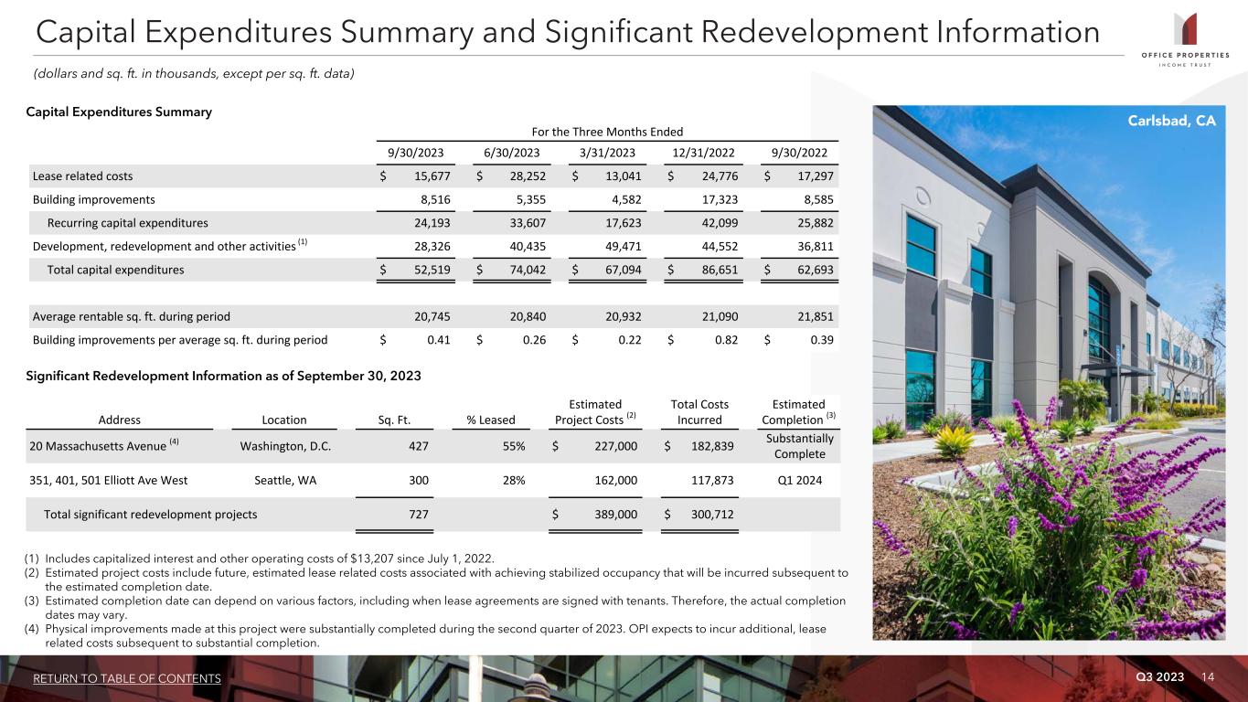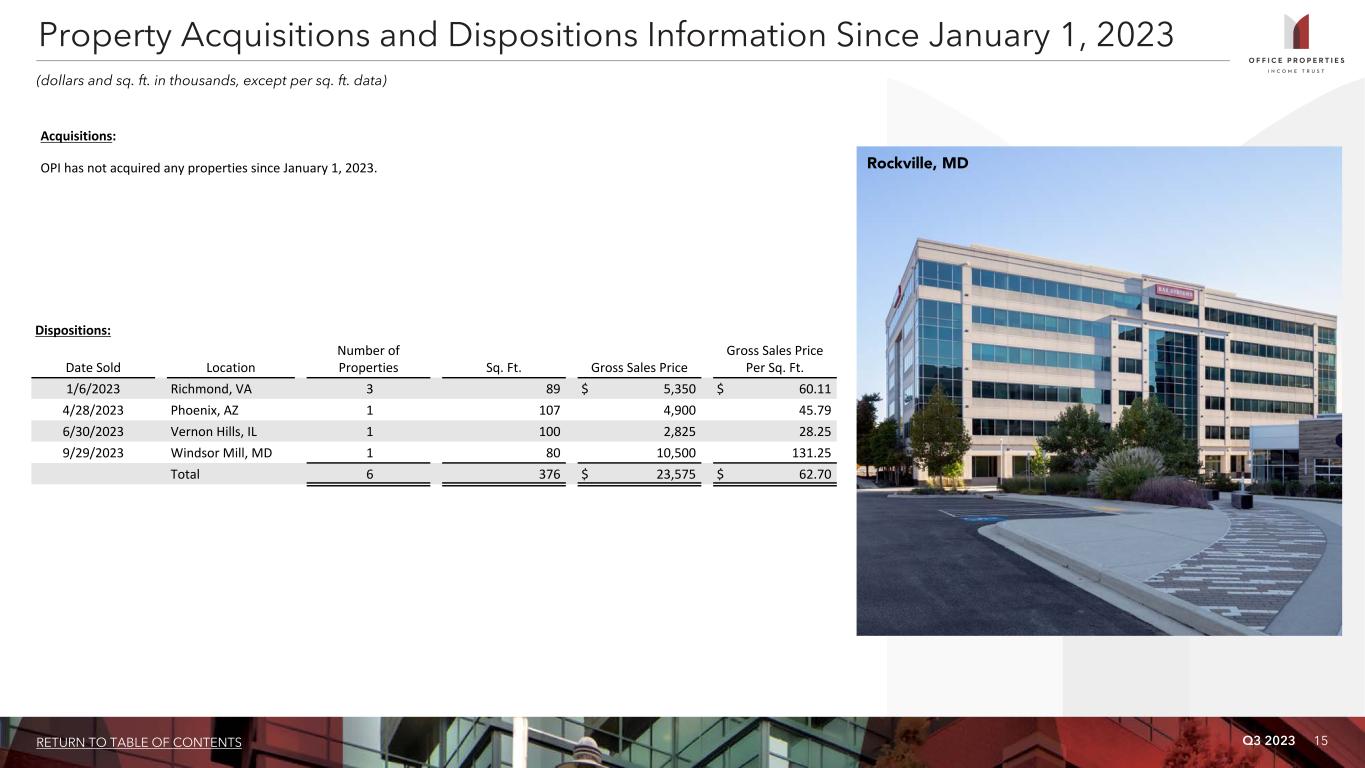 Q3 2023 14RETURN TO TABLE OF CONTENTS For the Three Months Ended 9/30/2023 6/30/2023 3/31/2023 12/31/2022 9/30/2022 Lease related costs $ 15,677 $ 28,252 $ 13,041 $ 24,776 $ 17,297 Building improvements 8,516 5,355 4,582 17,323 8,585 Recurring capital expenditures 24,193 33,607 17,623 42,099 25,882 Development, redevelopment and other activities (1) 28,326 40,435 49,471 44,552 36,811 Total capital expenditures $ 52,519 $ 74,042 $ 67,094 $ 86,651 $ 62,693 Average rentable sq. ft. during period 20,745 20,840 20,932 21,090 21,851 Building improvements per average sq. ft. during period $ 0.41 $ 0.26 $ 0.22 $ 0.82 $ 0.39 Capital Expenditures Summary and Significant Redevelopment Information (dollars and sq. ft. in thousands, except per sq. ft. data) Address Location Sq. Ft. % Leased Estimated Project Costs (2) Total Costs Incurred Estimated Completion (3) 20 Massachusetts Avenue (4) Washington, D.C. 427 55% $ 227,000 $ 182,839 Substantially Complete 351, 401, 501 Elliott Ave West Seattle, WA 300 28% 162,000 117,873 Q1 2024 Total significant redevelopment projects 727 $ 389,000 $ 300,712 Significant Redevelopment Information as of September 30, 2023 (1) Includes capitalized interest and other operating costs of $13,207 since July 1, 2022. (2) Estimated project costs include future, estimated lease related costs associated with achieving stabilized occupancy that will be incurred subsequent to the estimated completion date. (3) Estimated completion date can depend on various factors, including when lease agreements are signed with tenants. Therefore, the actual completion dates may vary. (4) Physical improvements made at this project were substantially completed during the second quarter of 2023. OPI expects to incur additional, lease related costs subsequent to substantial completion. Capital Expenditures Summary Carlsbad, CA