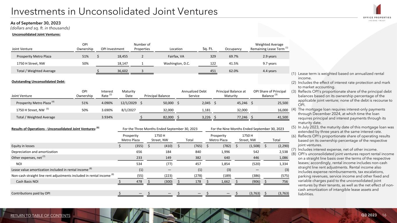 Q3 2023 15RETURN TO TABLE OF CONTENTS Acquisitions: OPI has not acquired any properties since January 1, 2023. Dispositions: Date Sold Location Number of Properties Sq. Ft. Gross Sales Price Gross Sales Price Per Sq. Ft. 1/6/2023 Richmond, VA 3 89 $ 5,350 $ 60.11 4/28/2023 Phoenix, AZ 1 107 4,900 45.79 6/30/2023 Vernon Hills, IL 1 100 2,825 28.25 9/29/2023 Windsor Mill, MD 1 80 10,500 131.25 Total 6 376 $ 23,575 $ 62.70 Property Acquisitions and Dispositions Information Since January 1, 2023 (dollars and sq. ft. in thousands, except per sq. ft. data) Rockville, MD