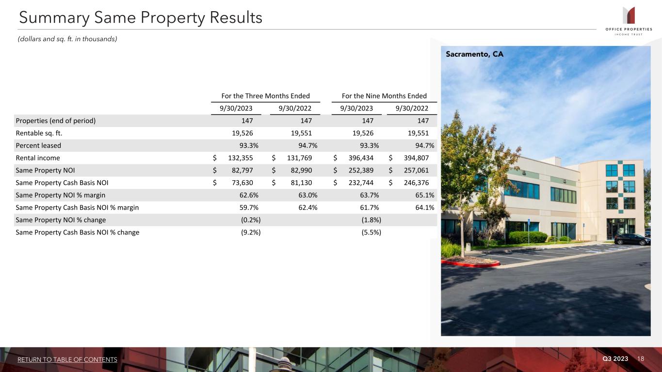 Q3 2023 16RETURN TO TABLE OF CONTENTS Unconsolidated Joint Ventures: Joint Venture OPI Ownership OPI Investment Number of Properties Location Sq. Ft. Occupancy Weighted Average Remaining Lease Term (1) Prosperity Metro Plaza 51% $ 18,455 2 Fairfax, VA 329 69.7% 2.9 years 1750 H Street, NW 50% 18,147 1 Washington, D.C. 122 41.5% 9.7 years Total / Weighted Average $ 36,602 3 451 62.0% 4.4 years (1) Lease term is weighted based on annualized rental income. (2) Includes the effect of interest rate protection and mark to market accounting. (3) Reflects OPI's proportionate share of the principal debt balances based on its ownership percentage of the applicable joint venture; none of the debt is recourse to OPI. (4) The mortgage loan requires interest-only payments through December 2024, at which time the loan requires principal and interest payments through its maturity date. (5) In July 2023, the maturity date of this mortgage loan was extended by three years at the same interest rate. (6) Reflects OPI's proportionate share of operating results based on its ownership percentage of the respective joint ventures. (7) Includes interest expense, net of other income. (8) OPI's unconsolidated joint ventures report rental income on a straight line basis over the terms of the respective leases; accordingly, rental income includes non-cash straight line rent adjustments. Rental income also includes expense reimbursements, tax escalations, parking revenues, service income and other fixed and variable charges paid to the unconsolidated joint ventures by their tenants, as well as the net effect of non- cash amortization of intangible lease assets and liabilities. Investments in Unconsolidated Joint Ventures As of September 30, 2023 (dollars and sq. ft. in thousands) Results of Operations - Unconsolidated Joint Ventures: (6) For the Three Months Ended September 30, 2023 For the Nine Months Ended September 30, 2023 Prosperity Metro Plaza 1750 H Street, NW Total Prosperity Metro Plaza 1750 H Street, NW Total Equity in losses $ (355) $ (410) $ (765) $ (782) $ (1,508) $ (2,290) Depreciation and amortization 656 184 840 1,996 542 2,538 Other expenses, net (7) 233 149 382 640 446 1,086 NOI 534 (77) 457 1,854 (520) 1,334 Lease value amortization included in rental income (8) (1) — (1) (3) — (3) Non-cash straight line rent adjustments included in rental income (8) (55) (223) (278) (189) (386) (575) Cash Basis NOI $ 478 $ (300) $ 178 $ 1,662 $ (906) $ 756 Contributions paid by OPI $ — $ — $ — $ — $ (3,763) $ (3,763) Outstanding Unconsolidated Debt: Joint Venture OPI Ownership Interest Rate (2) Maturity Date Principal Balance Annualized Debt Service Principal Balance at Maturity OPI Share of Principal Balance (3) Prosperity Metro Plaza (4) 51% 4.090% 12/1/2029 $ 50,000 $ 2,045 $ 45,246 $ 25,500 1750 H Street, NW (5) 50% 3.690% 8/1/2027 32,000 1,181 32,000 16,000 Total / Weighted Average 3.934% $ 82,000 $ 3,226 $ 77,246 $ 41,500