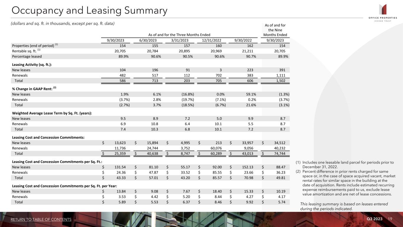 Q3 2023 18RETURN TO TABLE OF CONTENTS For the Three Months Ended For the Nine Months Ended 9/30/2023 9/30/2022 9/30/2023 9/30/2022 Properties (end of period) 147 147 147 147 Rentable sq. ft. 19,526 19,551 19,526 19,551 Percent leased 93.3% 94.7% 93.3% 94.7% Rental income $ 132,355 $ 131,769 $ 396,434 $ 394,807 Same Property NOI $ 82,797 $ 82,990 $ 252,389 $ 257,061 Same Property Cash Basis NOI $ 73,630 $ 81,130 $ 232,744 $ 246,376 Same Property NOI % margin 62.6% 63.0% 63.7% 65.1% Same Property Cash Basis NOI % margin 59.7% 62.4% 61.7% 64.1% Same Property NOI % change (0.2%) (1.8%) Same Property Cash Basis NOI % change (9.2%) (5.5%) Summary Same Property Results (dollars and sq. ft. in thousands) Sacramento, CA
