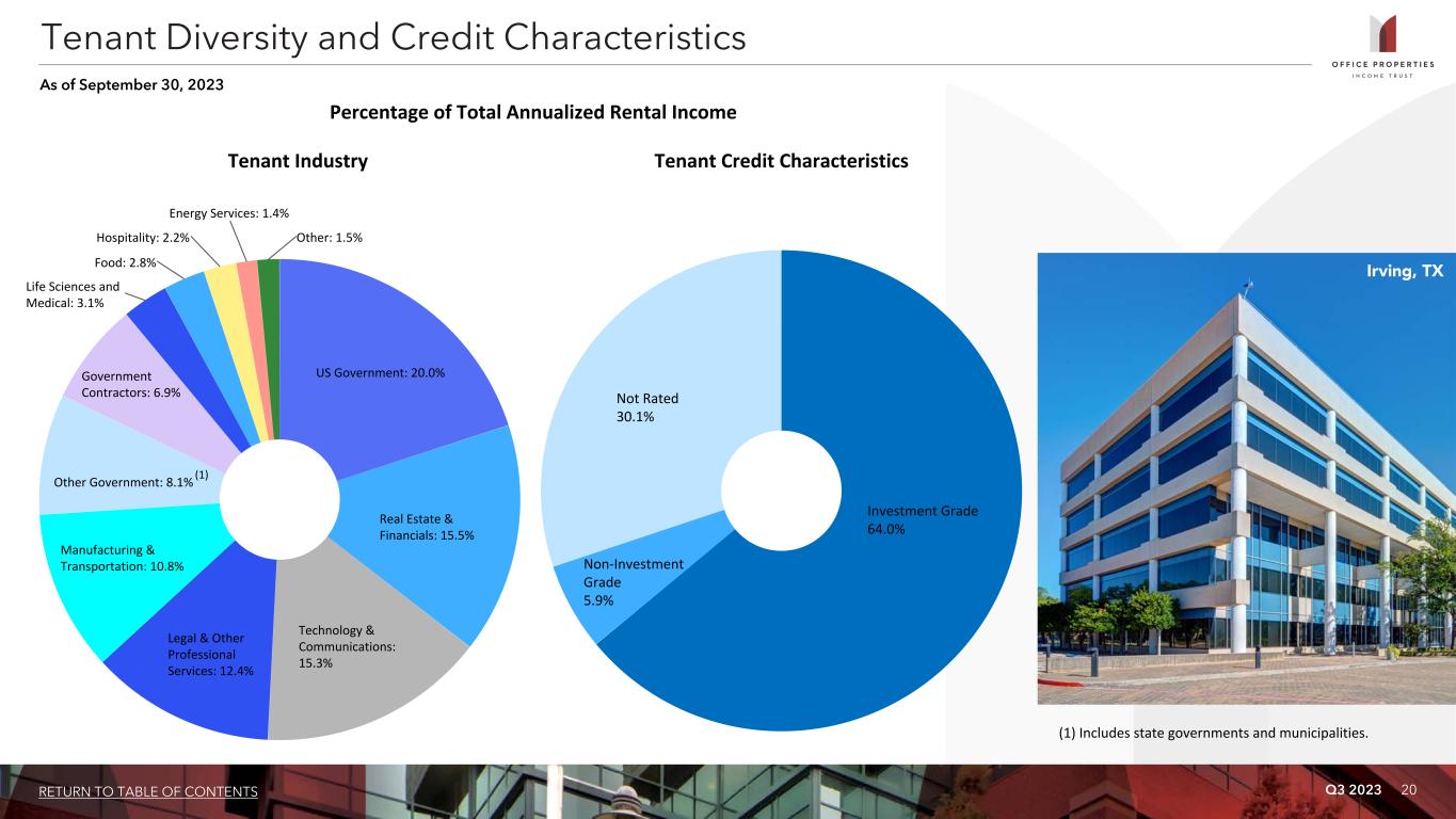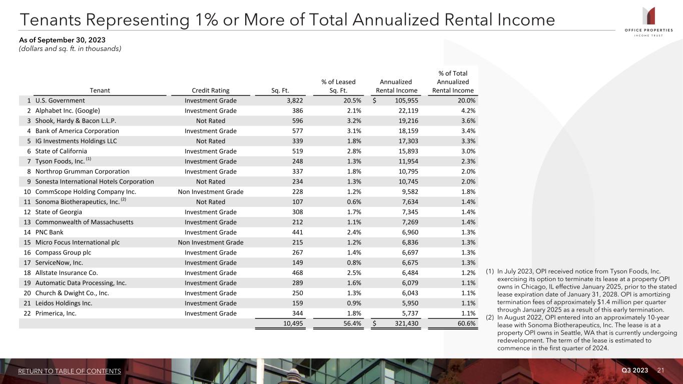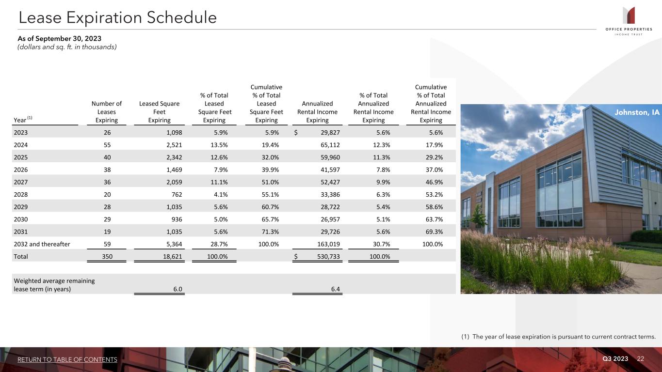 Q3 2023 21RETURN TO TABLE OF CONTENTS Tenant Credit Rating Sq. Ft. % of Leased Sq. Ft. Annualized Rental Income % of Total Annualized Rental Income 1 U.S. Government Investment Grade 3,822 20.5% $ 105,955 20.0% 2 Alphabet Inc. (Google) Investment Grade 386 2.1% 22,119 4.2% 3 Shook, Hardy & Bacon L.L.P. Not Rated 596 3.2% 19,216 3.6% 4 Bank of America Corporation Investment Grade 577 3.1% 18,159 3.4% 5 IG Investments Holdings LLC Not Rated 339 1.8% 17,303 3.3% 6 State of California Investment Grade 519 2.8% 15,893 3.0% 7 Tyson Foods, Inc. (1) Investment Grade 248 1.3% 11,954 2.3% 8 Northrop Grumman Corporation Investment Grade 337 1.8% 10,795 2.0% 9 Sonesta International Hotels Corporation Not Rated 234 1.3% 10,745 2.0% 10 CommScope Holding Company Inc. Non Investment Grade 228 1.2% 9,582 1.8% 11 Sonoma Biotherapeutics, Inc. (2) Not Rated 107 0.6% 7,634 1.4% 12 State of Georgia Investment Grade 308 1.7% 7,345 1.4% 13 Commonwealth of Massachusetts Investment Grade 212 1.1% 7,269 1.4% 14 PNC Bank Investment Grade 441 2.4% 6,960 1.3% 15 Micro Focus International plc Non Investment Grade 215 1.2% 6,836 1.3% 16 Compass Group plc Investment Grade 267 1.4% 6,697 1.3% 17 ServiceNow, Inc. Investment Grade 149 0.8% 6,675 1.3% 18 Allstate Insurance Co. Investment Grade 468 2.5% 6,484 1.2% 19 Automatic Data Processing, Inc. Investment Grade 289 1.6% 6,079 1.1% 20 Church & Dwight Co., Inc. Investment Grade 250 1.3% 6,043 1.1% 21 Leidos Holdings Inc. Investment Grade 159 0.9% 5,950 1.1% 22 Primerica, Inc. Investment Grade 344 1.8% 5,737 1.1% 10,495 56.4% $ 321,430 60.6% Tenants Representing 1% or More of Total Annualized Rental Income As of September 30, 2023 (dollars and sq. ft. in thousands) (1) In July 2023, OPI received notice from Tyson Foods, Inc. exercising its option to terminate its lease at a property OPI owns in Chicago, IL effective January 2025, prior to the stated lease expiration date of January 31, 2028. OPI is amortizing termination fees of approximately $1.4 million per quarter through January 2025 as a result of this early termination. (2) In August 2022, OPI entered into an approximately 10-year lease with Sonoma Biotherapeutics, Inc. The lease is at a property OPI owns in Seattle, WA that is currently undergoing redevelopment. The term of the lease is estimated to commence in the first quarter of 2024.
