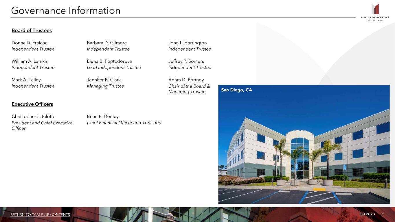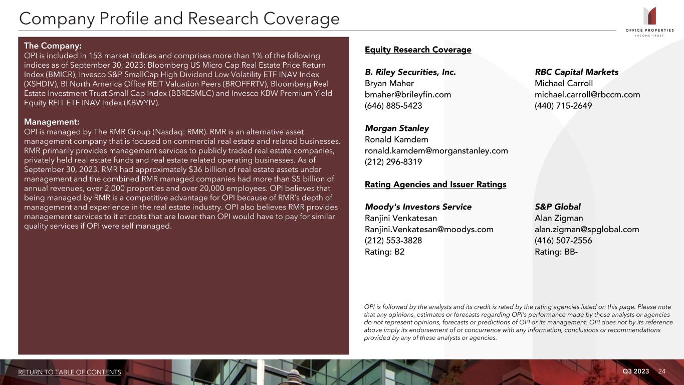 Q3 2023 24RETURN TO TABLE OF CONTENTS The Company: OPI is included in 153 market indices and comprises more than 1% of the following indices as of September 30, 2023: Bloomberg US Micro Cap Real Estate Price Return Index (BMICR), Invesco S&P SmallCap High Dividend Low Volatility ETF INAV Index (XSHDIV), BI North America Office REIT Valuation Peers (BROFFRTV), Bloomberg Real Estate Investment Trust Small Cap Index (BBRESMLC) and Invesco KBW Premium Yield Equity REIT ETF INAV Index (KBWYIV). Management: OPI is managed by The RMR Group (Nasdaq: RMR). RMR is an alternative asset management company that is focused on commercial real estate and related businesses. RMR primarily provides management services to publicly traded real estate companies, privately held real estate funds and real estate related operating businesses. As of September 30, 2023, RMR had approximately $36 billion of real estate assets under management and the combined RMR managed companies had more than $5 billion of annual revenues, over 2,000 properties and over 20,000 employees. OPI believes that being managed by RMR is a competitive advantage for OPI because of RMR’s depth of management and experience in the real estate industry. OPI also believes RMR provides management services to it at costs that are lower than OPI would have to pay for similar quality services if OPI were self managed. Company Profile and Research Coverage Equity Research Coverage B. Riley Securities, Inc. RBC Capital Markets Bryan Maher Michael Carroll bmaher@brileyfin.com michael.carroll@rbccm.com (646) 885-5423 (440) 715-2649 Morgan Stanley Ronald Kamdem ronald.kamdem@morganstanley.com (212) 296-8319 Rating Agencies and Issuer Ratings Moody's Investors Service S&P Global Ranjini Venkatesan Alan Zigman Ranjini.Venkatesan@moodys.com alan.zigman@spglobal.com (212) 553-3828 (416) 507-2556 Rating: B2 Rating: BB- OPI is followed by the analysts and its credit is rated by the rating agencies listed on this page. Please note that any opinions, estimates or forecasts regarding OPI’s performance made by these analysts or agencies do not represent opinions, forecasts or predictions of OPI or its management. OPI does not by its reference above imply its endorsement of or concurrence with any information, conclusions or recommendations provided by any of these analysts or agencies.