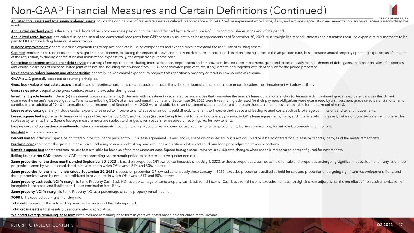 Q3 2023 26RETURN TO TABLE OF CONTENTS Non-GAAP Financial Measures OPI presents certain “non-GAAP financial measures” within the meaning of the applicable rules of the Securities and Exchange Commission, or the SEC, including NOI, Cash Basis NOI, Same Property NOI, Same Property Cash Basis NOI, EBITDA, EBITDAre, Adjusted EBITDAre, FFO, Normalized FFO and CAD. These measures do not represent cash generated by operating activities in accordance with GAAP and should not be considered alternatives to net (loss) income as indicators of OPI's operating performance or as measures of OPI's liquidity. These measures should be considered in conjunction with net (loss) income as presented in OPI's condensed consolidated statements of income (loss). OPI considers these non-GAAP measures to be appropriate supplemental measures of operating performance for a REIT, along with net (loss) income. OPI believes these measures provide useful information to investors because by excluding the effects of certain historical amounts, such as depreciation and amortization expense, they may facilitate a comparison of OPI's operating performance between periods and with other REITs and, in the case of NOI, Cash Basis NOI, Same Property NOI and Same Property Cash Basis NOI reflecting only those income and expense items that are generated and incurred at the property level may help both investors and management to understand the operations of OPI's properties. NOI and Cash Basis NOI The calculations of net operating income, or NOI, and Cash Basis NOI exclude certain components of net (loss) income in order to provide results that are more closely related to OPI's property level results of operations. OPI calculates NOI and Cash Basis NOI as shown on page 28 and Same Property NOI and Same Property Cash Basis NOI as shown on page 29. OPI defines NOI as income from OPI's rental of real estate less OPI's property operating expenses. NOI excludes amortization of capitalized tenant improvement costs and leasing commissions that OPI records as depreciation and amortization expense. OPI defines Cash Basis NOI as NOI excluding non-cash straight line rent adjustments, lease value amortization, lease termination fees, if any, and non-cash amortization included in other operating expenses. OPI calculates Same Property NOI and Same Property Cash Basis NOI in the same manner that OPI calculates the corresponding NOI and Cash Basis NOI amounts, except that OPI only includes same properties in calculating Same Property NOI and Same Property Cash Basis NOI. OPI uses NOI, Cash Basis NOI, Same Property NOI and Same Property Cash Basis NOI to evaluate individual and company-wide property level performance. Other real estate companies and REITs may calculate NOI, Cash Basis NOI, Same Property NOI and Same Property Cash Basis NOI differently than OPI does. EBITDA, EBITDAre and Adjusted EBITDAre OPI calculates earnings before interest, taxes, depreciation and amortization, or EBITDA, EBITDA for real estate, or EBITDAre, and Adjusted EBITDAre as shown on page 30. EBITDAre is calculated on the basis defined by The National Association of Real Estate Investment Trusts, or Nareit, which is EBITDA, excluding gains and losses on the sale of real estate, loss on impairment of real estate assets and adjustments to reflect OPI's share of EBITDAre of its unconsolidated joint ventures. In calculating Adjusted EBITDAre, OPI adjusts for the items shown on page 30 and include business management incentive fees, if any, only in the fourth quarter versus the quarter when they are recognized as expense in accordance with GAAP due to their quarterly volatility not necessarily being indicative of OPI's core operating performance and the uncertainty as to whether any such business management incentive fees will be payable when all contingencies for determining such fees are known at the end of the calendar year. Other real estate companies and REITs may calculate EBITDA, EBITDAre and Adjusted EBITDAre differently than OPI does. FFO and Normalized FFO OPI calculates funds from operations, or FFO, and Normalized FFO as shown on page 31. FFO is calculated on the basis defined by Nareit, which is net (loss) income, calculated in accordance with GAAP, plus real estate depreciation and amortization of consolidated properties and OPI's proportionate share of the real estate depreciation and amortization of unconsolidated joint venture properties, but excluding impairment charges on real estate assets and any gain or loss on sale of real estate, as well as certain other adjustments currently not applicable to us. In calculating Normalized FFO, OPI adjusts for the other items shown on page 31 and includes business management incentive fees, if any, only in the fourth quarter versus the quarter when they are recognized as an expense in accordance with GAAP due to their quarterly volatility not necessarily being indicative of OPI's core operating performance and the uncertainty as to whether any such business management incentive fees will be payable when all contingencies for determining such fees are known at the end of the calendar year. FFO and Normalized FFO are among the factors considered by OPI's Board of Trustees when determining the amount of distributions to OPI's shareholders. Other factors include, but are not limited to, requirements to maintain OPI's qualification for taxation as a REIT, limitations in OPI's credit agreement and public debt covenants, the availability to OPI of debt and equity capital, OPI's expectation of its future capital requirements and operating performance and OPI's expected needs for and availability of cash to pay its obligations. Other real estate companies and REITs may calculate FFO and Normalized FFO differently than OPI does. Cash Available for Distribution OPI calculates cash available for distribution, or CAD, as shown on page 31. OPI defines CAD as Normalized FFO minus recurring real estate related capital expenditures