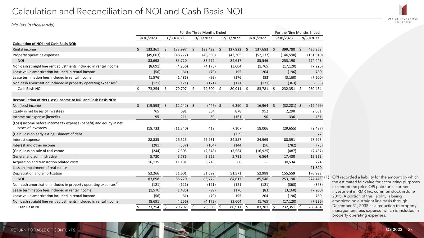 Q3 2023 27RETURN TO TABLE OF CONTENTS Adjusted total assets and total unencumbered assets include the original cost of real estate assets calculated in accordance with GAAP before impairment writedowns, if any, and exclude depreciation and amortization, accounts receivable and intangible assets. Annualized dividend yield is the annualized dividend per common share paid during the period divided by the closing price of OPI's common shares at the end of the period. Annualized rental income is calculated using the annualized contractual base rents from OPI's tenants pursuant to its lease agreements as of September 30, 2023, plus straight line rent adjustments and estimated recurring expense reimbursements to be paid to OPI, and excluding lease value amortization. Building improvements generally include expenditures to replace obsolete building components and expenditures that extend the useful life of existing assets. Cap rate represents the ratio of (x) annual straight line rental income, excluding the impact of above and below market lease amortization, based on existing leases at the acquisition date, less estimated annual property operating expenses as of the date of the acquisition, excluding depreciation and amortization expense, to (y) the acquisition purchase price. Consolidated income available for debt service is earnings from operations excluding interest expense, depreciation and amortization, loss on asset impairment, gains and losses on early extinguishment of debt, gains and losses on sales of properties and equity in earnings of unconsolidated joint ventures and including distributions from OPI's unconsolidated joint ventures, if any, determined together with debt service for the period presented. Development, redevelopment and other activities generally include capital expenditure projects that reposition a property or result in new sources of revenue. GAAP is U.S. generally accepted accounting principles. Gross book value of real estate assets is real estate properties at cost, plus certain acquisition costs, if any, before depreciation and purchase price allocations, less impairment writedowns, if any. Gross sales price is equal to the gross contract price and excludes closing costs. Investment grade tenants include: (a) investment grade rated tenants; (b) tenants with investment grade rated parent entities that guarantee the tenant's lease obligations; and/or (c) tenants with investment grade rated parent entities that do not guarantee the tenant's lease obligations. Tenants contributing 53.6% of annualized rental income as of September 30, 2023 were investment grade rated (or their payment obligations were guaranteed by an investment grade rated parent) and tenants contributing an additional 10.4% of annualized rental income as of September 30, 2023 were subsidiaries of an investment grade rated parent (although these parent entities are not liable for the payment of rents). Lease related costs generally include capital expenditures used to improve tenants' space or amounts paid directly to tenants to improve their space and leasing related costs, such as brokerage commissions and tenant inducements. Leased square feet is pursuant to leases existing as of September 30, 2023, and includes (i) space being fitted out for tenant occupancy pursuant to OPI's lease agreements, if any, and (ii) space which is leased, but is not occupied or is being offered for sublease by tenants, if any. Square footage measurements are subject to changes when space is remeasured or reconfigured for new tenants. Leasing cost and concession commitments include commitments made for leasing expenditures and concessions, such as tenant improvements, leasing commissions, tenant reimbursements and free rent. Net debt is total debt less cash. Percent leased includes (i) space being fitted out for occupancy pursuant to OPI's lease agreements, if any, and (ii) space which is leased, but is not occupied or is being offered for sublease by tenants, if any, as of the measurement date. Purchase price represents the gross purchase price, including assumed debt, if any, and excludes acquisition related costs and purchase price adjustments and allocations. Rentable square feet represents total square feet available for lease as of the measurement date. Square footage measurements are subject to changes when space is remeasured or reconfigured for new tenants. Rolling four quarter CAD represents CAD for the preceding twelve month period as of the respective quarter end date. Same properties for the three months ended September 30, 2023 is based on properties OPI owned continuously since July 1, 2022; excludes properties classified as held for sale and properties undergoing significant redevelopment, if any, and three properties owned by two unconsolidated joint ventures in which OPI owns a 51% and 50% interest. Same properties for the nine months ended September 30, 2023 is based on properties OPI owned continuously since January 1, 2022; excludes properties classified as held for sale and properties undergoing significant redevelopment, if any, and three properties owned by two unconsolidated joint ventures in which OPI owns a 51% and 50% interest. Same property cash basis NOI % margin is Same Property Cash Basis NOI as a percentage of same property cash basis rental income. Cash basis rental income excludes non-cash straightline rent adjustments, the net effect of non-cash amortization of intangible lease assets and liabilities and lease termination fees, if any. Same property NOI % margin is Same Property NOI as a percentage of same property rental income. SOFR is the secured overnight financing rate. Total debt represents the outstanding principal balance as of the date reported. Total gross assets is total assets plus accumulated depreciation. Weighted average remaining lease term is the average remaining lease term in years weighted based on annualized rental income. Non-GAAP Financial Measures 