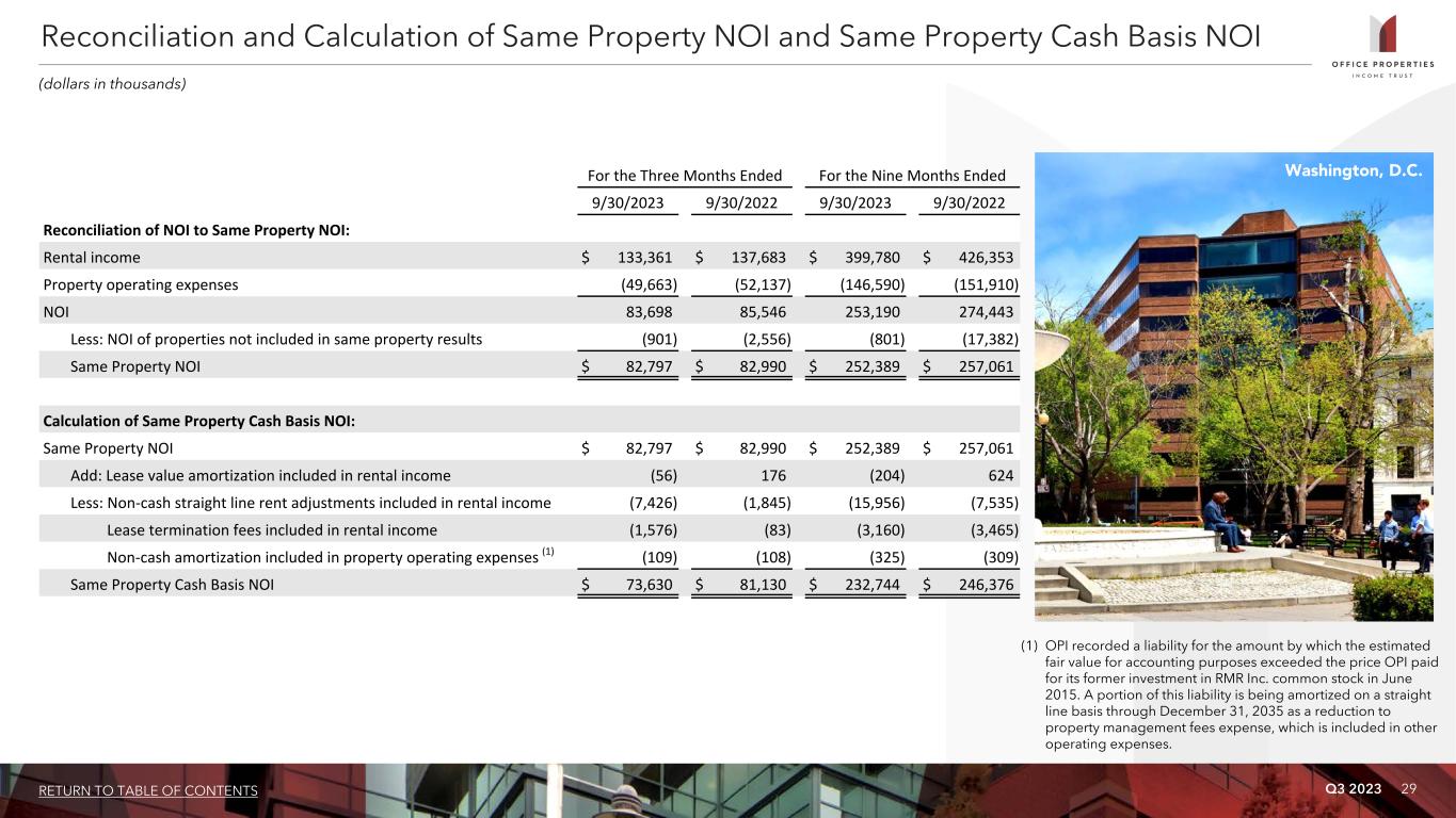 Q3 2023 28RETURN TO TABLE OF CONTENTS For the Three Months Ended For the Nine Months Ended 9/30/2023 6/30/2023 3/31/2023 12/31/2022 9/30/2022 9/30/2023 9/30/2022 Calculation of NOI and Cash Basis NOI: Rental income $ 133,361 $ 133,997 $ 132,422 $ 127,922 $ 137,683 $ 399,780 $ 426,353 Property operating expenses (49,663) (48,277) (48,650) (43,305) (52,137) (146,590) (151,910) NOI 83,698 85,720 83,772 84,617 85,546 253,190 274,443 Non-cash straight line rent adjustments included in rental income (8,691) (4,256) (4,173) (3,604) (1,765) (17,120) (7,226) Lease value amortization included in rental income (56) (61) (79) 195 204 (196) 780 Lease termination fees included in rental income (1,576) (1,485) (99) (176) (83) (3,160) (7,200) Non-cash amortization included in property operating expenses (1) (121) (121) (121) (121) (121) (363) (363) Cash Basis NOI $ 73,254 $ 79,797 $ 79,300 $ 80,911 $ 83,781 $ 232,351 $ 260,434 Reconciliation of Net (Loss) Income to NOI and Cash Basis NOI: Net (loss) income $ (19,593) $ (12,242) $ (446) $ 6,390 $ 16,964 $ (32,281) $ (12,499) Equity in net losses of investees 765 691 834 878 952 2,290 2,631 Income tax expense (benefit) 95 211 30 (161) 90 336 431 (Loss) income before income tax expense (benefit) and equity in net losses of investees (18,733) (11,340) 418 7,107 18,006 (29,655) (9,437) (Gain) loss on early extinguishment of debt — — — (759) — — 77 Interest expense 28,835 26,525 25,231 24,557 24,969 80,591 78,923 Interest and other income (281) (337) (164) (144) (56) (782) (73) (Gain) loss on sale of real estate (244) 2,305 (2,548) (3,564) (16,925) (487) (7,437) General and administrative 5,720 5,785 5,925 5,781 6,564 17,430 19,353 Acquisition and transaction related costs 16,135 11,181 3,218 68 — 30,534 224 Loss on impairment of real estate — — — — — — 21,820 Depreciation and amortization 52,266 51,601 51,692 51,571 52,988 155,559 170,993 NOI 83,698 85,720 83,772 84,617 85,546 253,190 274,443 Non-cash amortization included in property operating expenses (1) (121) (121) (121) (121) (121) (363) (363) Lease termination fees included in rental income (1,576) (1,485) (99) (176) (83) (3,160) (7,200) Lease value amortization included in rental income (56) (61) (79) 195 204 (196) 780 Non-cash straight line rent adjustments included in rental income (8,691) (4,256) (4,173) (3,604) (1,765) (17,120) (7,226) Cash Basis NOI $ 73,254 $ 79,797 $ 79,300 $ 80,911 $ 83,781 $ 232,351 $ 260,434 (1) OPI recorded a liability for the amount by which the estimated fair value for accounting purposes exceeded the price OPI paid for its former investment in RMR Inc. common stock in June 2015. A portion of this liability is being amortized on a straight line basis through December 31, 2035 as a reduction to property management fees expense, which is included in property operating expenses. Calculation and Reconciliation of NOI and Cash Basis NOI (dollars in thousands)