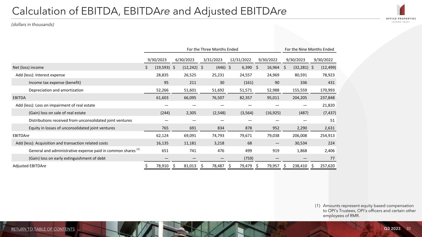 Q3 2023 30RETURN TO TABLE OF CONTENTS For the Three Months Ended For the Nine Months Ended 9/30/2023 6/30/2023 3/31/2023 12/31/2022 9/30/2022 9/30/2023 9/30/2022 Net (loss) income $ (19,593) $ (12,242) $ (446) $ 6,390 $ 16,964 $ (32,281) $ (12,499) Add (less): Interest expense 28,835 26,525 25,231 24,557 24,969 80,591 78,923 Income tax expense (benefit) 95 211 30 (161) 90 336 431 Depreciation and amortization 52,266 51,601 51,692 51,571 52,988 155,559 170,993 EBITDA 61,603 66,095 76,507 82,357 95,011 204,205 237,848 Add (less): Loss on impairment of real estate — — — — — — 21,820 (Gain) loss on sale of real estate (244) 2,305 (2,548) (3,564) (16,925) (487) (7,437) Distributions received from unconsolidated joint ventures — — — — — — 51 Equity in losses of unconsolidated joint ventures 765 691 834 878 952 2,290 2,631 EBITDAre 62,124 69,091 74,793 79,671 79,038 206,008 254,913 Add (less): Acquisition and transaction related costs 16,135 11,181 3,218 68 — 30,534 224 General and administrative expense paid in common shares (1) 651 741 476 499 919 1,868 2,406 (Gain) loss on early extinguishment of debt — — — (759) — — 77 Adjusted EBITDAre $ 78,910 $ 81,013 $ 78,487 $ 79,479 $ 79,957 $ 238,410 $ 257,620 Calculation of EBITDA, EBITDAre and Adjusted EBITDAre (dollars in thousands) (1) Amounts represent equity based compensation to OPI's Trustees, OPI's officers and certain other employees of RMR.