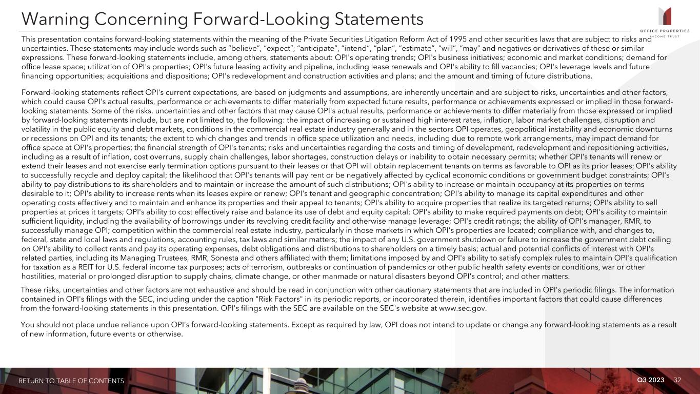 Q3 2023 31RETURN TO TABLE OF CONTENTS For the Three Months Ended For the Nine Months Ended 9/30/2023 6/30/2023 3/31/2023 12/31/2022 9/30/2022 9/30/2023 9/30/2022 Net (loss) income $ (19,593) $ (12,242) $ (446) $ 6,390 $ 16,964 $ (32,281) $ (12,499) Add (less): Depreciation and amortization: Consolidated properties 52,266 51,601 51,692 51,571 52,988 155,559 170,993 Unconsolidated joint venture properties 840 868 830 789 775 2,538 2,269 Loss on impairment of real estate — — — — — — 21,820 (Gain) loss on sale of real estate (244) 2,305 (2,548) (3,564) (16,925) (487) (7,437) FFO 33,269 42,532 49,528 55,186 53,802 125,329 175,146 Add (less): Acquisition and transaction related costs 16,135 11,181 3,218 68 — 30,534 224 (Gain) loss on early extinguishment of debt — — — (759) — — 77 Normalized FFO 49,404 53,713 52,746 54,495 53,802 155,863 175,447 Add (less): Non-cash expenses (1) (1,312) (2,157) (1,902) (1,464) (640) (5,371) (1,297) Distributions from unconsolidated joint ventures — — — — — — 51 Depreciation and amortization - unconsolidated joint ventures (840) (868) (830) (789) (775) (2,538) (2,269) Equity in net losses of investees 765 691 834 878 952 2,290 2,631 Non-cash straight line rent adjustments included in rental income (8,691) (4,256) (4,173) (3,604) (1,765) (17,120) (7,226) Lease value amortization included in rental income (56) (61) (79) 195 204 (196) 780 Net amortization of debt premiums, discounts and issuance costs 2,276 2,327 2,205 2,188 2,176 6,808 6,946 Recurring capital expenditures (24,193) (33,607) (17,623) (42,099) (25,882) (75,423) (58,162) CAD $ 17,353 $ 15,782 $ 31,178 $ 9,800 $ 28,072 $ 64,313 $ 116,901 Weighted average common shares outstanding (basic and diluted) 48,403 48,354 48,336 48,334 48,286 48,365 48,260 Per common share amounts (basic and diluted): Net (loss) income $ (0.41) $ (0.25) $ (0.01) $ 0.13 $ 0.35 $ (0.67) $ (0.27) FFO $ 0.69 $ 0.88 $ 1.02 $ 1.14 $ 1.11 $ 2.59 $ 3.63 Normalized FFO $ 1.02 $ 1.11 $ 1.09 $ 1.13 $ 1.11 $ 3.22 $ 3.64 CAD $ 0.36 $ 0.33 $ 0.65 $ 0.20 $ 0.58 $ 1.33 $ 2.42 (1) Non-cash expenses include equity based compensation, adjustments recorded to capitalize interest expense and amortization of the liability for the amount by which the estimated fair value for accounting purposes exceeded the price OPI paid for its former investment in RMR Inc. common stock in June 2015. This liability is being amortized on a straight line basis through December 31, 2035 as an allocated reduction to business management fee expense and property management fee expense, which are included in general and administrative and other operating expenses, respectively. Calculation of FFO, Normalized FFO and CAD (amounts in thousands, except per share data)