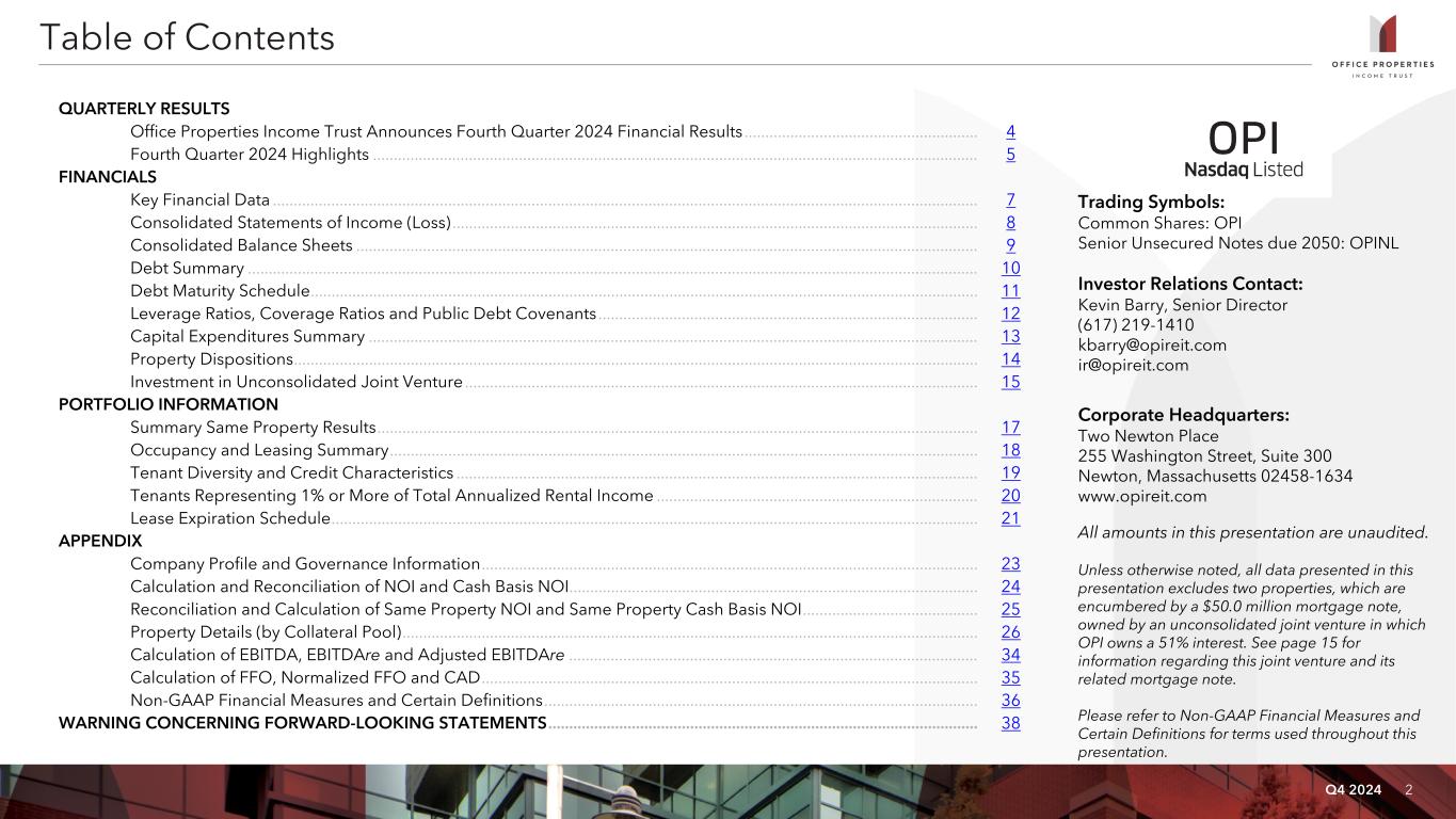 Q4 2024 2 Table of Contents QUARTERLY RESULTS Office Properties Income Trust Announces Fourth Quarter 2024 Financial Results ........................................................ 4 Fourth Quarter 2024 Highlights ................................................................................................................................................. 5 FINANCIALS Key Financial Data ......................................................................................................................................................................... 7 Consolidated Statements of Income (Loss) .............................................................................................................................. 8 Consolidated Balance Sheets ..................................................................................................................................................... 9 Debt Summary ............................................................................................................................................................................... 10 Debt Maturity Schedule ................................................................................................................................................................ 11 Leverage Ratios, Coverage Ratios and Public Debt Covenants ........................................................................................... 12 Capital Expenditures Summary .................................................................................................................................................. 13 Property Dispositions .................................................................................................................................................................... 14 Investment in Unconsolidated Joint Venture ........................................................................................................................... 15 PORTFOLIO INFORMATION Summary Same Property Results ................................................................................................................................................ 17 Occupancy and Leasing Summary ............................................................................................................................................. 18 Tenant Diversity and Credit Characteristics ............................................................................................................................. 19 Tenants Representing 1% or More of Total Annualized Rental Income ............................................................................. 20 Lease Expiration Schedule ........................................................................................................................................................... 21 APPENDIX Company Profile and Governance Information ....................................................................................................................... 23 Calculation and Reconciliation of NOI and Cash Basis NOI .................................................................................................. 24 Reconciliation and Calculation of Same Property NOI and Same Property Cash Basis NOI .......................................... 25 Property Details (by Collateral Pool) .......................................................................................................................................... 26 Calculation of EBITDA, EBITDAre and Adjusted EBITDAre .................................................................................................. 34 Calculation of FFO, Normalized FFO and CAD ....................................................................................................................... 35 Non-GAAP Financial Measures and Certain Definitions ........................................................................................................ 36 WARNING CONCERNING FORWARD-LOOKING STATEMENTS ....................................................................................................... 38 Trading Symbols: Common Shares: OPI Senior Unsecured Notes due 2050: OPINL Investor Relations Contact: Kevin Barry, Senior Director (617) 219-1410 kbarry@opireit.com ir@opireit.com Corporate Headquarters: Two Newton Place 255 Washington Street, Suite 300 Newton, Massachusetts 02458-1634 www.opireit.com All amounts in this presentation are unaudited. Unless otherwise noted, all data presented in this presentation excludes two properties, which are encumbered by a $50.0 million mortgage note, owned by an unconsolidated joint venture in which OPI owns a 51% interest. See page 15 for information regarding this joint venture and its related mortgage note. Please refer to Non-GAAP Financial Measures and Certain Definitions for terms used throughout this presentation.