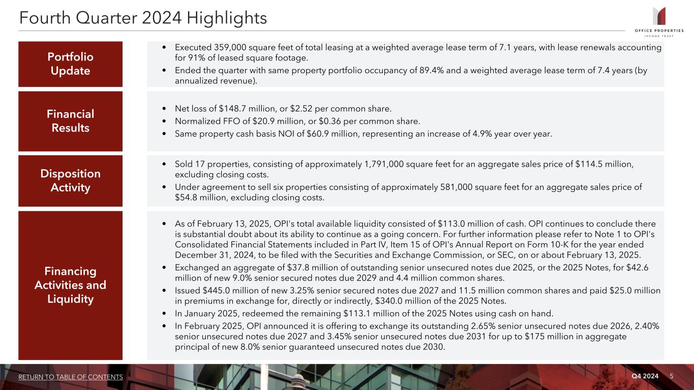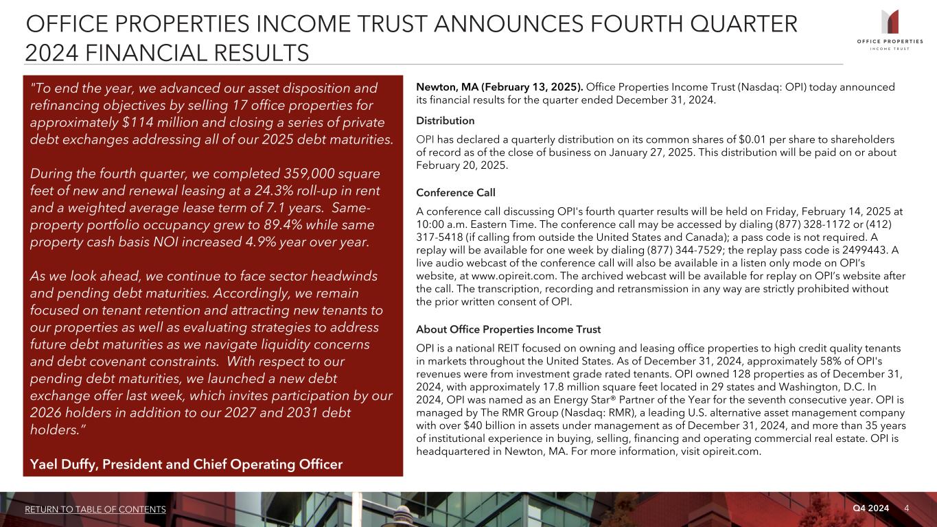 Q4 2024 4RETURN TO TABLE OF CONTENTS OFFICE PROPERTIES INCOME TRUST ANNOUNCES FOURTH QUARTER 2024 FINANCIAL RESULTS "To end the year, we advanced our asset disposition and refinancing objectives by selling 17 office properties for approximately $114 million and closing a series of private debt exchanges addressing all of our 2025 debt maturities. During the fourth quarter, we completed 359,000 square feet of new and renewal leasing at a 24.3% roll-up in rent and a weighted average lease term of 7.1 years. Same- property portfolio occupancy grew to 89.4% while same property cash basis NOI increased 4.9% year over year. As we look ahead, we continue to face sector headwinds and pending debt maturities. Accordingly, we remain focused on tenant retention and attracting new tenants to our properties as well as evaluating strategies to address future debt maturities as we navigate liquidity concerns and debt covenant constraints. With respect to our pending debt maturities, we launched a new debt exchange offer last week, which invites participation by our 2026 holders in addition to our 2027 and 2031 debt holders.” Yael Duffy, President and Chief Operating Officer Newton, MA (February 13, 2025). Office Properties Income Trust (Nasdaq: OPI) today announced its financial results for the quarter ended December 31, 2024. Distribution OPI has declared a quarterly distribution on its common shares of $0.01 per share to shareholders of record as of the close of business on January 27, 2025. This distribution will be paid on or about February 20, 2025. Conference Call A conference call discussing OPI's fourth quarter results will be held on Friday, February 14, 2025 at 10:00 a.m. Eastern Time. The conference call may be accessed by dialing (877) 328-1172 or (412) 317-5418 (if calling from outside the United States and Canada); a pass code is not required. A replay will be available for one week by dialing (877) 344-7529; the replay pass code is 2499443. A live audio webcast of the conference call will also be available in a listen only mode on OPI’s website, at www.opireit.com. The archived webcast will be available for replay on OPI’s website after the call. The transcription, recording and retransmission in any way are strictly prohibited without the prior written consent of OPI. About Office Properties Income Trust OPI is a national REIT focused on owning and leasing office properties to high credit quality tenants in markets throughout the United States. As of December 31, 2024, approximately 58% of OPI's revenues were from investment grade rated tenants. OPI owned 128 properties as of December 31, 2024, with approximately 17.8 million square feet located in 29 states and Washington, D.C. In 2024, OPI was named as an Energy Star® Partner of the Year for the seventh consecutive year. OPI is managed by The RMR Group (Nasdaq: RMR), a leading U.S. alternative asset management company with over $40 billion in assets under management as of December 31, 2024, and more than 35 years of institutional experience in buying, selling, financing and operating commercial real estate. OPI is headquartered in Newton, MA. For more information, visit opireit.com.