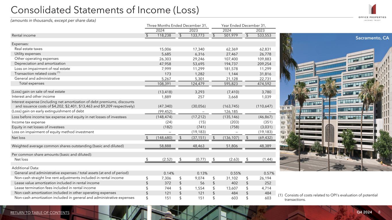 Q4 2024 7RETURN TO TABLE OF CONTENTS As of and for the Three Months Ended As of 12/31/2024 9/30/2024 6/30/2024 3/31/2024 12/31/2023 12/31/2024 Selected Income Statement Data: Capitalization: Rental income $ 118,238 $ 120,620 $ 123,686 $ 139,435 $ 133,773 Total common shares (at end of period) 69,824,743 Net (loss) income $ (148,680) $ (58,414) $ 76,171 $ (5,184) $ (37,151) Closing price (at end of period) $ 1.00 NOI $ 71,244 $ 69,205 $ 76,046 $ 88,248 $ 80,871 Equity market capitalization (at end of period) $ 69,825 Adjusted EBITDAre $ 68,152 $ 65,001 $ 71,469 $ 73,799 $ 76,216 Debt (principal balance) 2,626,524 FFO $ (78,679) $ 21,640 $ 258,969 $ 48,183 $ 44,590 Total market capitalization $ 2,696,349 Normalized FFO $ 20,946 $ 22,114 $ 33,171 $ 38,317 $ 45,872 CAD $ (16,296) $ (19,066) $ (1,079) $ 22,340 $ 8,560 Liquidity: Rolling four quarter CAD $ (14,101) $ 10,755 $ 47,174 $ 64,035 $ 72,873 Cash and cash equivalents $ 261,318 Availability under $325,000 secured revolving credit facility (2) — Per Common Share Data (basic and diluted): Total liquidity $ 261,318 Net (loss) income $ (2.52) $ (1.14) $ 1.56 $ (0.11) $ (0.77) FFO $ (1.34) $ 0.42 $ 5.32 $ 0.99 $ 0.92 Normalized FFO $ 0.36 $ 0.43 $ 0.68 $ 0.79 $ 0.95 CAD $ (0.28) $ (0.37) $ (0.02) $ 0.46 $ 0.18 Rolling four quarter CAD $ (0.27) $ 0.21 $ 0.97 $ 1.32 $ 1.51 Dividends: Annualized dividends paid per common share during the period $ 0.04 $ 0.04 $ 0.04 $ 0.04 $ 1.00 Annualized dividend yield (at end of period) 4.0% 1.8% 2.0% 2.0% 13.7% Annualized normalized FFO payout ratio 2.8% 2.3% 1.5% 1.3% 26.3% Rolling four quarter CAD payout ratio (1) (14.8%) 19.0% 4.1% 3.0% 65.8% Selected Balance Sheet Data: Total gross assets $ 4,440,936 $ 4,345,425 $ 4,410,554 $ 4,637,482 $ 4,639,848 Total assets $ 3,822,286 $ 3,725,951 $ 3,799,856 $ 3,957,930 $ 3,989,669 Total liabilities $ 2,669,482 $ 2,447,365 $ 2,470,157 $ 2,707,566 $ 2,733,990 Total shareholders’ equity $ 1,152,804 $ 1,278,586 $ 1,329,699 $ 1,250,364 $ 1,255,679 (dollars in thousands, except per share data) Key Financial Data (1) Reflects the annualized dividends paid per common share during the period as a percentage of rolling four quarter CAD per common share. (2) Availability under OPI's secured revolving credit facility is subject to ongoing minimum performance and market values of the collateral properties and meeting required financial covenants. As of December 31, 2024, OPI was fully drawn on its revolving credit facility.