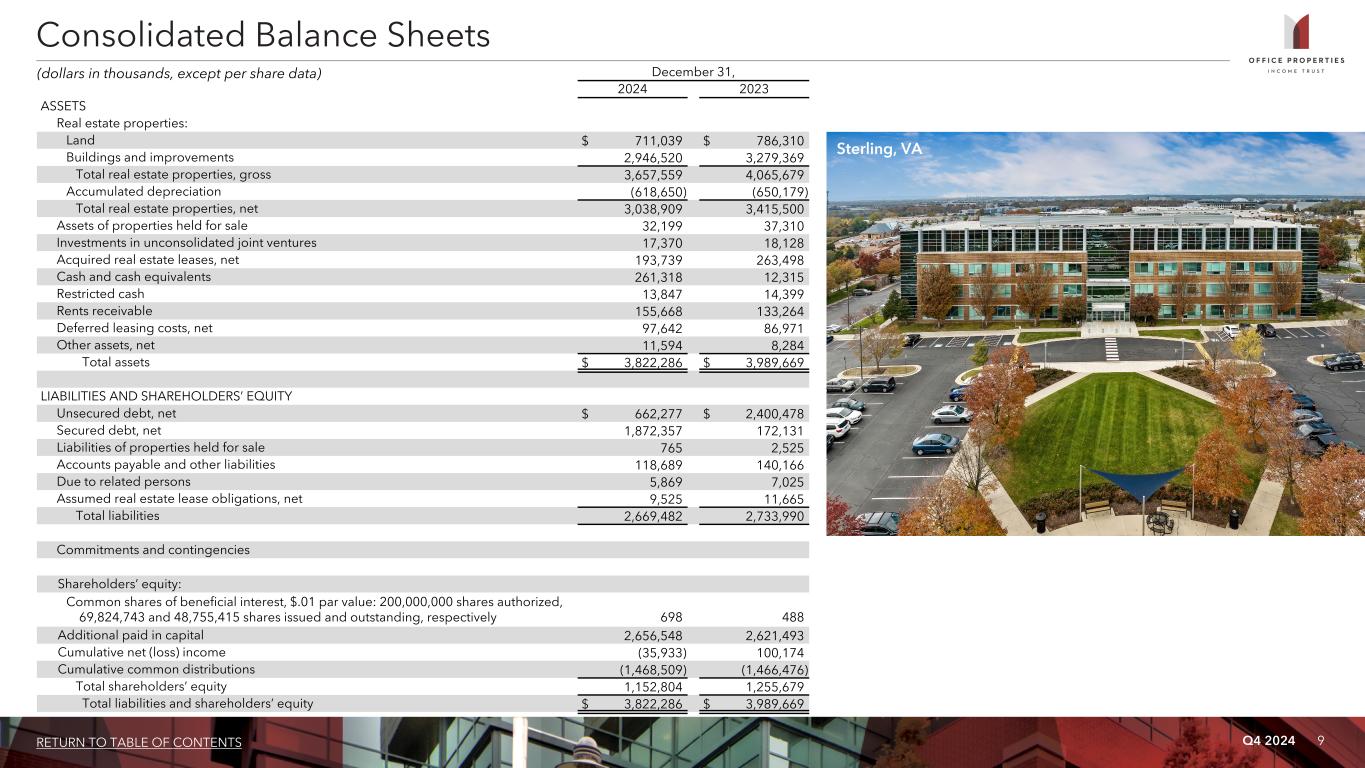 Q4 2024 8RETURN TO TABLE OF CONTENTS Three Months Ended December 31, Year Ended December 31, 2024 2023 2024 2023 Rental income $ 118,238 $ 133,773 $ 501,979 $ 533,553 Expenses:   Real estate taxes 15,006 17,340 62,369 62,831 Utility expenses 5,685 6,316 27,467 26,778 Other operating expenses 26,303 29,246 107,400 109,883 Depreciation and amortization 47,958 53,695 194,737 209,254 Loss on impairment of real estate 7,999 11,299 181,578 11,299 Transaction related costs (1) 173 1,282 1,144 31,816 General and administrative 5,267 5,301 21,128 22,731 Total expenses 108,391 124,479 595,823 474,592 (Loss) gain on sale of real estate (13,418) 3,293 (7,410) 3,780 Interest and other income 1,889 257 3,668 1,039 Interest expense (including net amortization of debt premiums, discounts and issuance costs of $4,202, $2,401, $13,463 and $9,209 respectively) (47,340) (30,056) (163,745) (110,647) (Loss) gain on early extinguishment of debt (99,452) — 126,185 — Loss before income tax expense and equity in net losses of investees (148,474) (17,212) (135,146) (46,867) Income tax expense (24) (15) (203) (351) Equity in net losses of investees (182) (741) (758) (3,031) Loss on impairment of equity method investment — (19,183) — (19,183) Net loss $ (148,680) $ (37,151) $ (136,107) $ (69,432) Weighted average common shares outstanding (basic and diluted) 58,888 48,463 51,806 48,389 Per common share amounts (basic and diluted):         Net loss $ (2.52) $ (0.77) $ (2.63) $ (1.44) Additional Data: General and administrative expenses / total assets (at end of period) 0.14% 0.13% 0.55% 0.57% Non-cash straight line rent adjustments included in rental income $ 7,306 $ 9,074 $ 31,102 $ 26,194 Lease value amortization included in rental income $ 372 $ 56 $ 402 $ 252 Lease termination fees included in rental income $ 744 $ 1,554 $ 13,607 $ 4,714 Non-cash amortization included in other operating expenses $ 121 $ 121 $ 484 $ 484 Non-cash amortization included in general and administrative expenses $ 151 $ 151 $ 603 $ 603 (amounts in thousands, except per share data) (1) Consists of costs related to OPI's evaluation of potential transactions. Consolidated Statements of Income (Loss) Sacramento, CA
