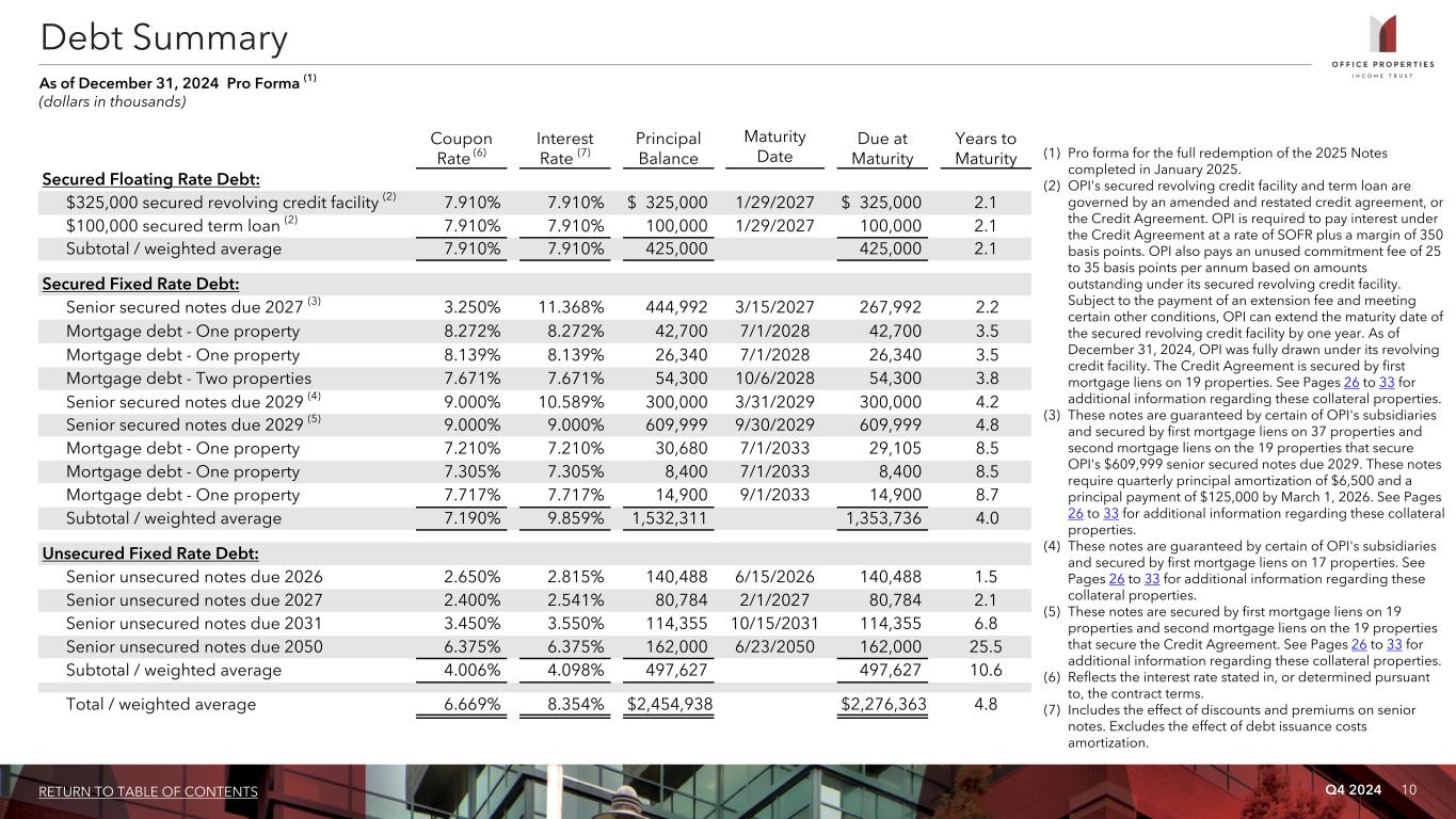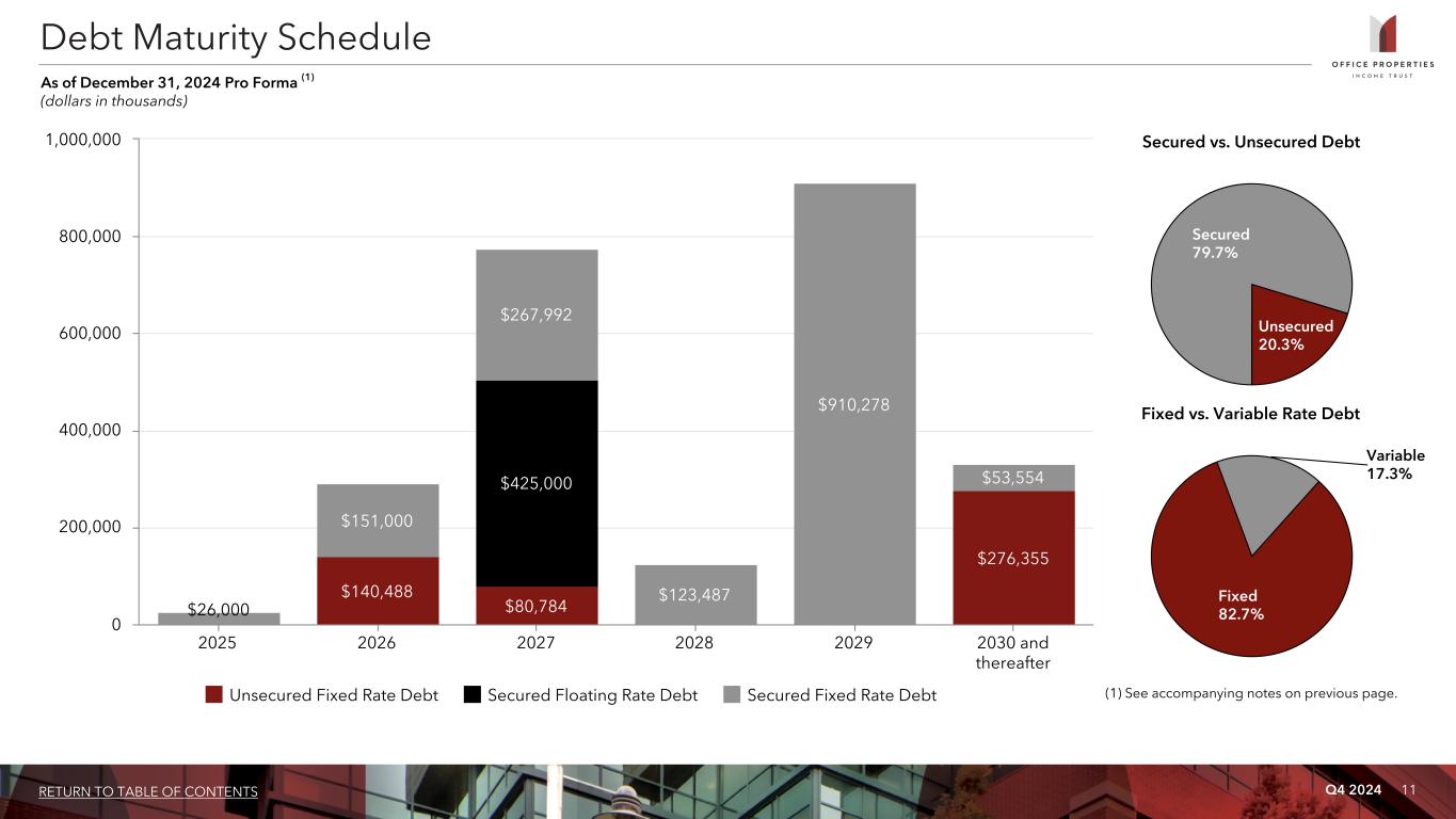 Q4 2024 10RETURN TO TABLE OF CONTENTS Coupon Rate (6) Interest Rate (7) Principal Balance Maturity Date Due at Maturity Years to Maturity Secured Floating Rate Debt: $325,000 secured revolving credit facility (2) 7.910% 7.910% $ 325,000 1/29/2027 $ 325,000 2.1 $100,000 secured term loan (2) 7.910% 7.910% 100,000 1/29/2027 100,000 2.1 Subtotal / weighted average 7.910% 7.910% 425,000 425,000 2.1 Secured Fixed Rate Debt: Senior secured notes due 2027 (3) 3.250% 11.368% 444,992 3/15/2027 267,992 2.2 Mortgage debt - One property 8.272% 8.272% 42,700 7/1/2028 42,700 3.5 Mortgage debt - One property 8.139% 8.139% 26,340 7/1/2028 26,340 3.5 Mortgage debt - Two properties 7.671% 7.671% 54,300 10/6/2028 54,300 3.8 Senior secured notes due 2029 (4) 9.000% 10.589% 300,000 3/31/2029 300,000 4.2 Senior secured notes due 2029 (5) 9.000% 9.000% 609,999 9/30/2029 609,999 4.8 Mortgage debt - One property 7.210% 7.210% 30,680 7/1/2033 29,105 8.5 Mortgage debt - One property 7.305% 7.305% 8,400 7/1/2033 8,400 8.5 Mortgage debt - One property 7.717% 7.717% 14,900 9/1/2033 14,900 8.7 Subtotal / weighted average 7.190% 9.859% 1,532,311 1,353,736 4.0 Unsecured Fixed Rate Debt: Senior unsecured notes due 2026 2.650% 2.815% 140,488 6/15/2026 140,488 1.5 Senior unsecured notes due 2027 2.400% 2.541% 80,784 2/1/2027 80,784 2.1 Senior unsecured notes due 2031 3.450% 3.550% 114,355 10/15/2031 114,355 6.8 Senior unsecured notes due 2050 6.375% 6.375% 162,000 6/23/2050 162,000 25.5 Subtotal / weighted average 4.006% 4.098% 497,627 497,627 10.6 Total / weighted average 6.669% 8.354% $ 2,454,938 $ 2,276,363 4.8 Debt Summary As of December 31, 2024 Pro Forma (1) (dollars in thousands) (1) Pro forma for the full redemption of the 2025 Notes completed in January 2025. (2) OPI's secured revolving credit facility and term loan are governed by an amended and restated credit agreement, or the Credit Agreement. OPI is required to pay interest under the Credit Agreement at a rate of SOFR plus a margin of 350 basis points. OPI also pays an unused commitment fee of 25 to 35 basis points per annum based on amounts outstanding under its secured revolving credit facility. Subject to the payment of an extension fee and meeting certain other conditions, OPI can extend the maturity date of the secured revolving credit facility by one year. As of December 31, 2024, OPI was fully drawn under its revolving credit facility. The Credit Agreement is secured by first mortgage liens on 19 properties. See Pages 26 to 33 for additional information regarding these collateral properties. (3) These notes are guaranteed by certain of OPI's subsidiaries and secured by first mortgage liens on 37 properties and second mortgage liens on the 19 properties that secure OPI's $609,999 senior secured notes due 2029. These notes require quarterly principal amortization of $6,500 and a principal payment of $125,000 by March 1, 2026. See Pages 26 to 33 for additional information regarding these collateral properties. (4) These notes are guaranteed by certain of OPI's subsidiaries and secured by first mortgage liens on 17 properties. See Pages 26 to 33 for additional information regarding these collateral properties. (5) These notes are secured by first mortgage liens on 19 properties and second mortgage liens on the 19 properties that secure the Credit Agreement. See Pages 26 to 33 for additional information regarding these collateral properties. (6) Reflects the interest rate stated in, or determined pursuant to, the contract terms. (7) Includes the effect of discounts and premiums on senior notes. Excludes the effect of debt issuance costs amortization.