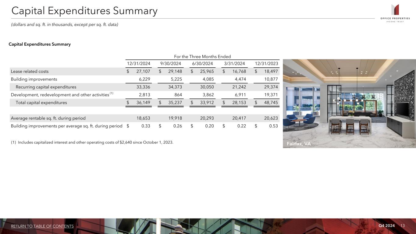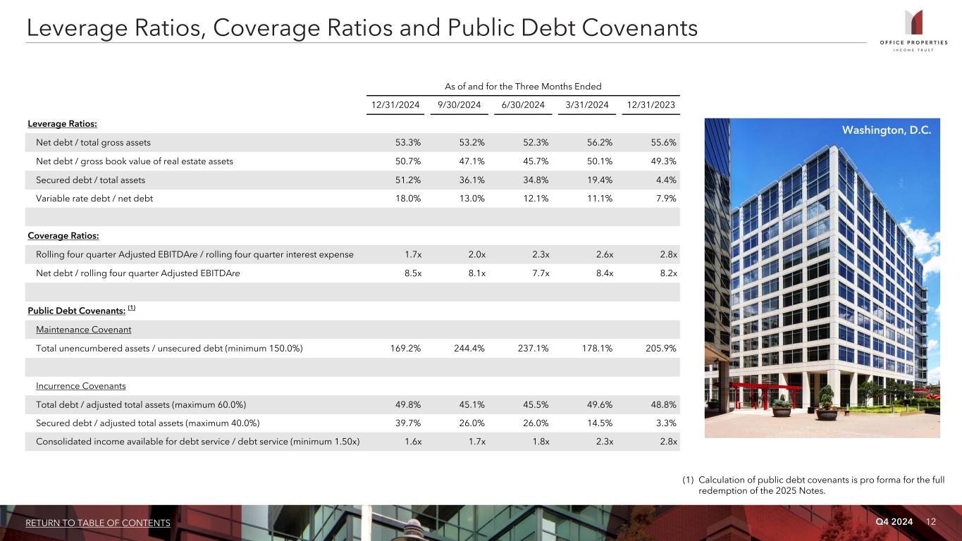Q4 2024 12RETURN TO TABLE OF CONTENTS Leverage Ratios, Coverage Ratios and Public Debt Covenants As of and for the Three Months Ended 12/31/2024 9/30/2024 6/30/2024 3/31/2024 12/31/2023 Leverage Ratios: Net debt / total gross assets 53.3% 53.2% 52.3% 56.2% 55.6% Net debt / gross book value of real estate assets 50.7% 47.1% 45.7% 50.1% 49.3% Secured debt / total assets 51.2% 36.1% 34.8% 19.4% 4.4% Variable rate debt / net debt 18.0% 13.0% 12.1% 11.1% 7.9% Coverage Ratios: Rolling four quarter Adjusted EBITDAre / rolling four quarter interest expense 1.7x 2.0x 2.3x 2.6x 2.8x Net debt / rolling four quarter Adjusted EBITDAre 8.5x 8.1x 7.7x 8.4x 8.2x Public Debt Covenants: (1) Maintenance Covenant Total unencumbered assets / unsecured debt (minimum 150.0%) 169.2% 244.4% 237.1% 178.1% 205.9% Incurrence Covenants Total debt / adjusted total assets (maximum 60.0%) 49.8% 45.1% 45.5% 49.6% 48.8% Secured debt / adjusted total assets (maximum 40.0%) 39.7% 26.0% 26.0% 14.5% 3.3% Consolidated income available for debt service / debt service (minimum 1.50x) 1.6x 1.7x 1.8x 2.3x 2.8x Washington, D.C. (1) Calculation of public debt covenants is pro forma for the full redemption of the 2025 Notes.