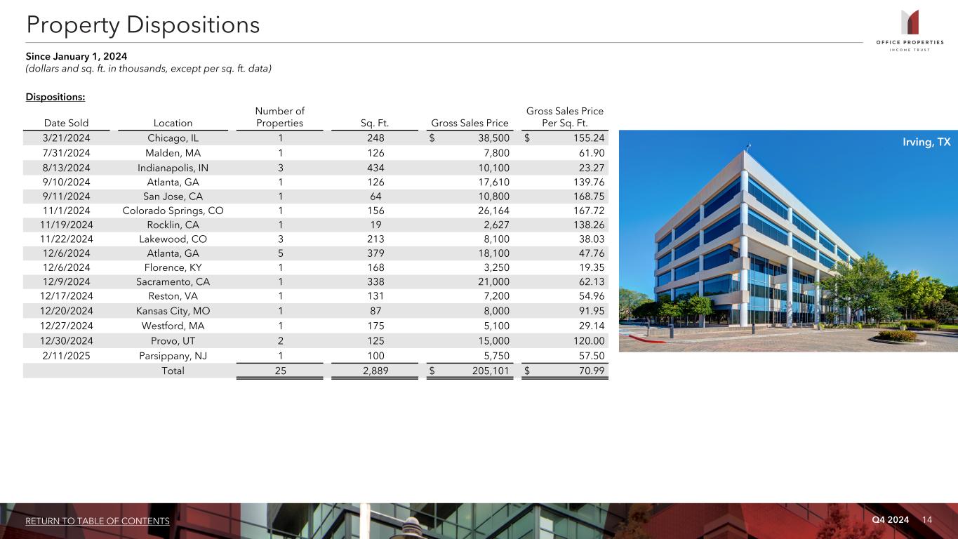 Q4 2024 13RETURN TO TABLE OF CONTENTS For the Three Months Ended 12/31/2024 9/30/2024 6/30/2024 3/31/2024 12/31/2023 Lease related costs $ 27,107 $ 29,148 $ 25,965 $ 16,768 $ 18,497 Building improvements 6,229 5,225 4,085 4,474 10,877 Recurring capital expenditures 33,336 34,373 30,050 21,242 29,374 Development, redevelopment and other activities (1) 2,813 864 3,862 6,911 19,371 Total capital expenditures $ 36,149 $ 35,237 $ 33,912 $ 28,153 $ 48,745 Average rentable sq. ft. during period 18,653 19,918 20,293 20,417 20,623 Building improvements per average sq. ft. during period $ 0.33 $ 0.26 $ 0.20 $ 0.22 $ 0.53 Capital Expenditures Summary (dollars and sq. ft. in thousands, except per sq. ft. data) (1) Includes capitalized interest and other operating costs of $2,640 since October 1, 2023. Capital Expenditures Summary Fairfax, VA