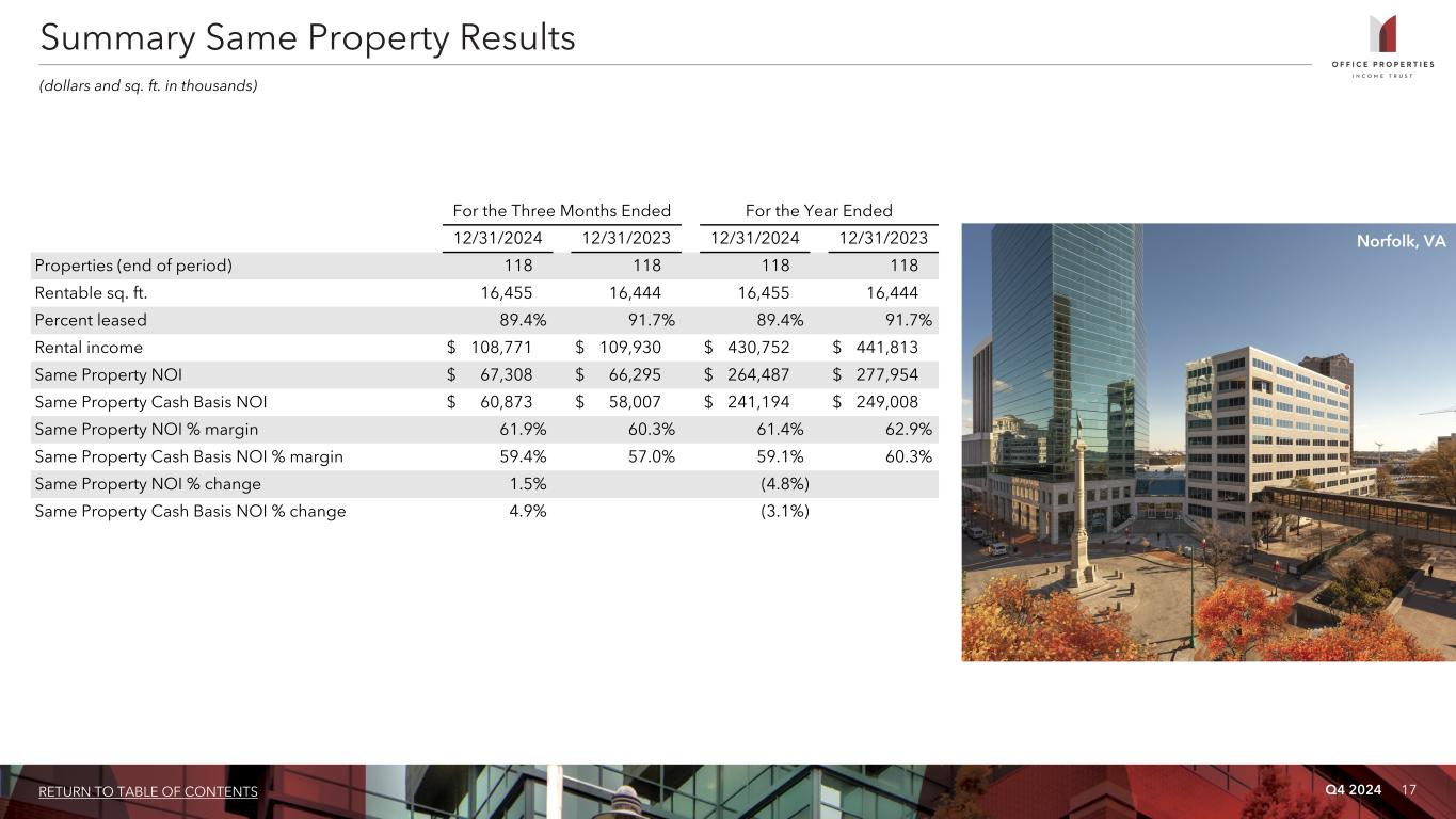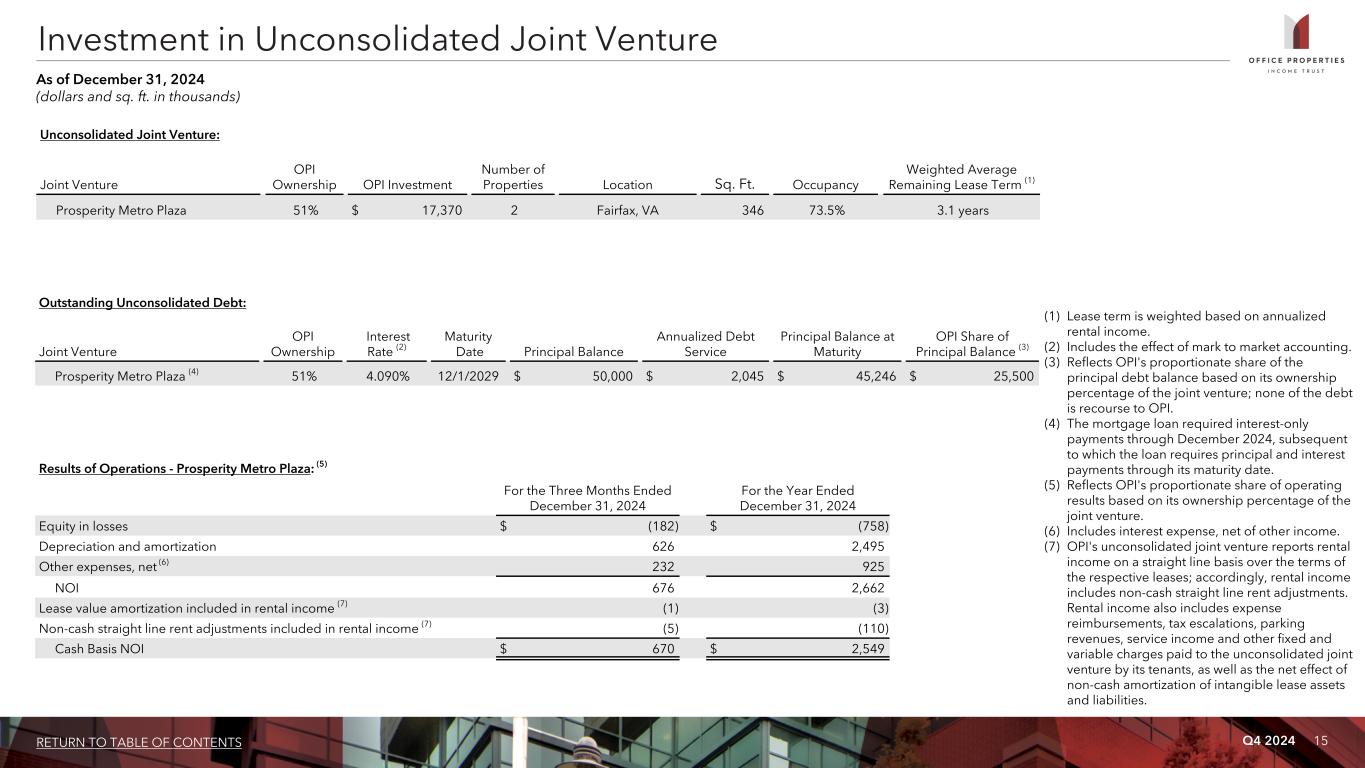 Q4 2024 15RETURN TO TABLE OF CONTENTS Unconsolidated Joint Venture: Joint Venture OPI Ownership OPI Investment Number of Properties Location Sq. Ft. Occupancy Weighted Average Remaining Lease Term (1) Prosperity Metro Plaza 51% $ 17,370 2 Fairfax, VA 346 73.5% 3.1 years (1) Lease term is weighted based on annualized rental income. (2) Includes the effect of mark to market accounting. (3) Reflects OPI's proportionate share of the principal debt balance based on its ownership percentage of the joint venture; none of the debt is recourse to OPI. (4) The mortgage loan required interest-only payments through December 2024, subsequent to which the loan requires principal and interest payments through its maturity date. (5) Reflects OPI's proportionate share of operating results based on its ownership percentage of the joint venture. (6) Includes interest expense, net of other income. (7) OPI's unconsolidated joint venture reports rental income on a straight line basis over the terms of the respective leases; accordingly, rental income includes non-cash straight line rent adjustments. Rental income also includes expense reimbursements, tax escalations, parking revenues, service income and other fixed and variable charges paid to the unconsolidated joint venture by its tenants, as well as the net effect of non-cash amortization of intangible lease assets and liabilities. Investment in Unconsolidated Joint Venture As of December 31, 2024 (dollars and sq. ft. in thousands) Results of Operations - Prosperity Metro Plaza: (5) For the Three Months Ended December 31, 2024 For the Year Ended December 31, 2024 Equity in losses $ (182) $ (758) Depreciation and amortization 626 2,495 Other expenses, net (6) 232 925 NOI 676 2,662 Lease value amortization included in rental income (7) (1) (3) Non-cash straight line rent adjustments included in rental income (7) (5) (110) Cash Basis NOI $ 670 $ 2,549 Outstanding Unconsolidated Debt: Joint Venture OPI Ownership Interest Rate (2) Maturity Date Principal Balance Annualized Debt Service Principal Balance at Maturity OPI Share of Principal Balance (3) Prosperity Metro Plaza (4) 51% 4.090% 12/1/2029 $ 50,000 $ 2,045 $ 45,246 $ 25,500