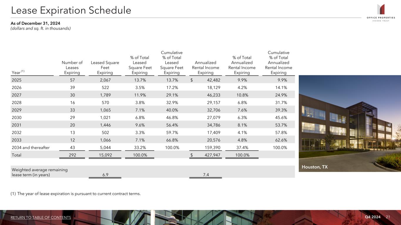 Q4 2024 20RETURN TO TABLE OF CONTENTS Tenant Credit Rating Sq. Ft. % of Leased Sq. Ft. Annualized Rental Income % of Total Annualized Rental Income 1 U.S. Government Investment Grade 2,508 16.6% $ 72,587 17.0% 2 Alphabet Inc. (Google) Investment Grade 386 2.6% 23,004 5.4% 3 Shook, Hardy & Bacon L.L.P. Not Rated 596 3.9% 19,604 4.6% 4 IG Investments Holdings LLC Not Rated 339 2.2% 18,303 4.3% 5 Bank of America Corporation Investment Grade 577 3.8% 17,290 4.0% 6 Sonesta International Hotels Corporation (1) Not Rated 240 1.6% 10,828 2.5% 7 Northrop Grumman Corporation Investment Grade 337 2.2% 10,781 2.5% 8 State of California Investment Grade 365 2.4% 10,570 2.5% 9 State of Georgia Investment Grade 308 2.0% 7,713 1.8% 10 Sonoma Biotherapeutics, Inc. Not Rated 84 0.6% 7,189 1.7% 11 Automatic Data Processing, Inc. Investment Grade 289 1.9% 6,346 1.5% 12 Allstate Insurance Corporation Investment Grade 458 3.0% 6,270 1.5% 13 Compass Group plc Investment Grade 267 1.8% 6,076 1.4% 14 Church & Dwight Co., Inc. Investment Grade 250 1.7% 6,048 1.4% 15 Leidos Holdings Inc. Investment Grade 159 1.1% 5,962 1.4% 16 Primerica, Inc. Investment Grade 344 2.3% 5,734 1.3% 17 Science Applications International Corp. Non Investment Grade 159 1.1% 5,254 1.2% 18 AT&T Inc. Investment Grade 425 2.8% 5,251 1.2% 19 Berkshire Hathaway Inc. Investment Grade 134 0.9% 4,674 1.1% 20 Rocky Mountain University of Health Professions, Inc. Not Rated 170 1.1% 4,606 1.1% 21 CommScope Holding Company Inc. Non Investment Grade 96 0.6% 4,546 1.1% 22 Day Pitney LLP Not Rated 100 0.7% 4,522 1.1% 23 Hartford Financial Services Group Inc. Investment Grade 143 0.9% 4,518 1.1% 24 BAE Systems plc Investment Grade 165 1.1% 4,442 1.0% 25 Greeneden U.S. Holdings I, LLC Not Rated 275 1.8% 4,380 1.0% 9,174 60.7% $ 276,498 64.7% Tenants Representing 1% or More of Total Annualized Rental Income As of December 31, 2024 (dollars and sq. ft. in thousands) (1) Effective January 1, 2025, the existing lease with this tenant was terminated and replaced with a hotel management agreement. For further information please refer to Note 7 to OPI's Consolidated Financial Statements included in Part IV, Item 15 of OPI's Annual Report on Form 10-K for the year ended December 31, 2024, to be filed with the SEC on or about February 13, 2025.