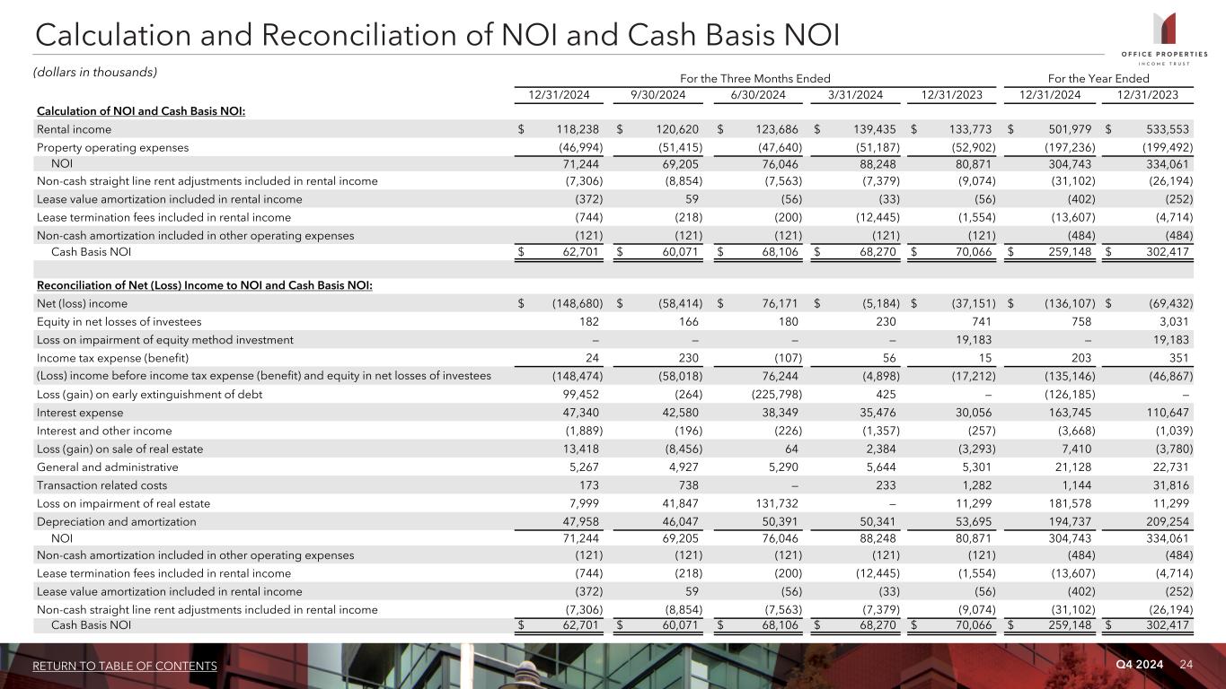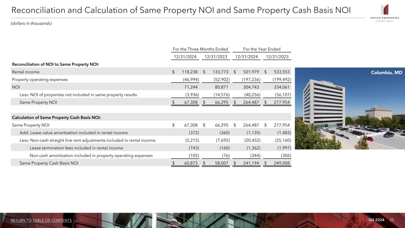 Q4 2024 24RETURN TO TABLE OF CONTENTS For the Three Months Ended For the Year Ended 12/31/2024 9/30/2024 6/30/2024 3/31/2024 12/31/2023 12/31/2024 12/31/2023 Calculation of NOI and Cash Basis NOI: Rental income $ 118,238 $ 120,620 $ 123,686 $ 139,435 $ 133,773 $ 501,979 $ 533,553 Property operating expenses (46,994) (51,415) (47,640) (51,187) (52,902) (197,236) (199,492) NOI 71,244 69,205 76,046 88,248 80,871 304,743 334,061 Non-cash straight line rent adjustments included in rental income (7,306) (8,854) (7,563) (7,379) (9,074) (31,102) (26,194) Lease value amortization included in rental income (372) 59 (56) (33) (56) (402) (252) Lease termination fees included in rental income (744) (218) (200) (12,445) (1,554) (13,607) (4,714) Non-cash amortization included in other operating expenses (121) (121) (121) (121) (121) (484) (484) Cash Basis NOI $ 62,701 $ 60,071 $ 68,106 $ 68,270 $ 70,066 $ 259,148 $ 302,417 Reconciliation of Net (Loss) Income to NOI and Cash Basis NOI: Net (loss) income $ (148,680) $ (58,414) $ 76,171 $ (5,184) $ (37,151) $ (136,107) $ (69,432) Equity in net losses of investees 182 166 180 230 741 758 3,031 Loss on impairment of equity method investment — — — — 19,183 — 19,183 Income tax expense (benefit) 24 230 (107) 56 15 203 351 (Loss) income before income tax expense (benefit) and equity in net losses of investees (148,474) (58,018) 76,244 (4,898) (17,212) (135,146) (46,867) Loss (gain) on early extinguishment of debt 99,452 (264) (225,798) 425 — (126,185) — Interest expense 47,340 42,580 38,349 35,476 30,056 163,745 110,647 Interest and other income (1,889) (196) (226) (1,357) (257) (3,668) (1,039) Loss (gain) on sale of real estate 13,418 (8,456) 64 2,384 (3,293) 7,410 (3,780) General and administrative 5,267 4,927 5,290 5,644 5,301 21,128 22,731 Transaction related costs 173 738 — 233 1,282 1,144 31,816 Loss on impairment of real estate 7,999 41,847 131,732 — 11,299 181,578 11,299 Depreciation and amortization 47,958 46,047 50,391 50,341 53,695 194,737 209,254 NOI 71,244 69,205 76,046 88,248 80,871 304,743 334,061 Non-cash amortization included in other operating expenses (121) (121) (121) (121) (121) (484) (484) Lease termination fees included in rental income (744) (218) (200) (12,445) (1,554) (13,607) (4,714) Lease value amortization included in rental income (372) 59 (56) (33) (56) (402) (252) Non-cash straight line rent adjustments included in rental income (7,306) (8,854) (7,563) (7,379) (9,074) (31,102) (26,194) Cash Basis NOI $ 62,701 $ 60,071 $ 68,106 $ 68,270 $ 70,066 $ 259,148 $ 302,417 Calculation and Reconciliation of NOI and Cash Basis NOI (dollars in thousands)