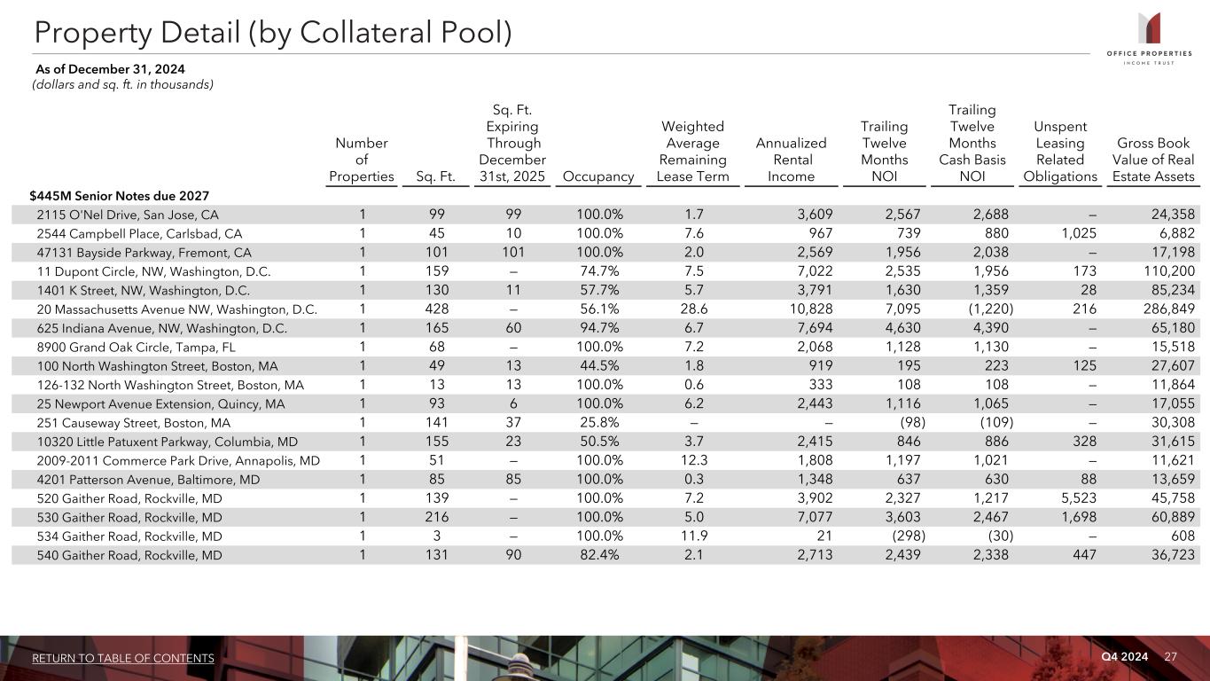 Q4 2024 26RETURN TO TABLE OF CONTENTS Property Detail (by Collateral Pool) As of December 31, 2024 (dollars and sq. ft. in thousands) Number of Properties Sq. Ft. Sq. Ft. Expiring Through December 31st, 2025 Occupancy Weighted Average Remaining Lease Term Annualized Rental Income Trailing Twelve Months NOI Trailing Twelve Months Cash Basis NOI Unspent Leasing Related Obligations Gross Book Value of Real Estate Assets Encumbered Properties (1) Credit Agreement 2235 Iron Point Road, Folsom, CA 1 96 — 100.0% 4.8 $ 3,036 $ 2,284 $ 2,364 $ — $ 14,138 4560 Viewridge Road, San Diego, CA 1 93 — 100.0% 6.4 3,561 2,355 2,412 — 27,977 440 First Street, NW, Washington, D.C. 1 142 40 91.4% 6.4 8,329 4,772 4,415 454 93,722 180 Ted Turner Drive SW, Atlanta, GA 1 91 — 100.0% 12.7 3,418 2,423 2,330 618 36,194 600 West Peachtree Street NW, Atlanta, GA 1 387 22 95.0% 4.5 9,502 5,748 5,940 1,650 70,945 1000 West Fulton Market, Chicago, IL 1 545 2 97.1% 4.5 31,054 16,469 15,488 — 363,932 2020 S. Arlington Heights, Arlington Heights, IL 1 58 — 100.0% 16.0 1,794 1,170 1,243 — 18,724 2555 Grand Boulevard, Kansas City, MO 1 596 183 100.0% 6.4 19,604 12,692 13,137 7,417 98,260 2300 Yorkmont Road, Charlotte, NC 1 151 17 100.0% 5.4 3,515 2,076 2,132 — 26,190 2400 Yorkmont Road, Charlotte, NC 1 133 — 100.0% 6.0 2,991 1,644 1,682 — 15,884 14668 Lee Road, Chantilly, VA 1 170 2 97.5% 14.3 5,986 4,041 3,627 94 58,130 14672 Lee Road, Chantilly, VA 1 159 — 100.0% 2.3 5,254 3,626 3,714 — 47,695 1751 Blue Hills Drive, Roanoke, VA 1 399 — 100.0% 8.8 2,160 1,781 1,767 — 15,431 45101 Warp Drive, Sterling, VA 1 161 — 100.0% 9.7 5,078 2,482 153 — 33,631 45201 Warp Drive, Sterling, VA 1 88 — 100.0% 9.7 2,857 1,344 64 — 18,748 45301 Warp Drive, Sterling, VA 1 88 — 100.0% 9.7 2,846 1,358 72 401 50,816 2420 Stevens Center Place, Richland, WA 1 93 — 100.0% 8.8 2,594 1,793 1,518 — 16,635 2430 Stevens Center Place, Richland, WA 1 47 — 100.0% 8.8 1,320 842 702 — 9,177 5353 Yellowstone Road, Cheyenne, WY 1 106 — 92.9% 15.8 2,667 1,771 1,210 940 14,660 Credit Agreement 19 3,603 266 98.4% 6.8 117,566 70,671 63,970 11,574 1,030,889 (1) See notes on Page 10 regarding our debt agreements and encumbrances.