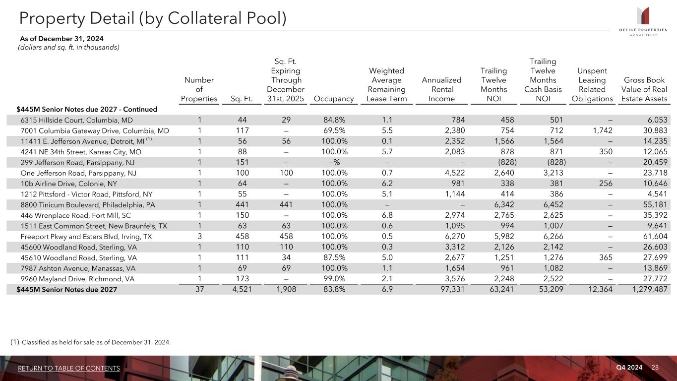Q4 2024 27RETURN TO TABLE OF CONTENTS Property Detail (by Collateral Pool) As of December 31, 2024 (dollars and sq. ft. in thousands) Number of Properties Sq. Ft. Sq. Ft. Expiring Through December 31st, 2025 Occupancy Weighted Average Remaining Lease Term Annualized Rental Income Trailing Twelve Months NOI Trailing Twelve Months Cash Basis NOI Unspent Leasing Related Obligations Gross Book Value of Real Estate Assets $445M Senior Notes due 2027 2115 O'Nel Drive, San Jose, CA 1 99 99 100.0% 1.7 3,609 2,567 2,688 — 24,358 2544 Campbell Place, Carlsbad, CA 1 45 10 100.0% 7.6 967 739 880 1,025 6,882 47131 Bayside Parkway, Fremont, CA 1 101 101 100.0% 2.0 2,569 1,956 2,038 — 17,198 11 Dupont Circle, NW, Washington, D.C. 1 159 — 74.7% 7.5 7,022 2,535 1,956 173 110,200 1401 K Street, NW, Washington, D.C. 1 130 11 57.7% 5.7 3,791 1,630 1,359 28 85,234 20 Massachusetts Avenue NW, Washington, D.C. 1 428 — 56.1% 28.6 10,828 7,095 (1,220) 216 286,849 625 Indiana Avenue, NW, Washington, D.C. 1 165 60 94.7% 6.7 7,694 4,630 4,390 — 65,180 8900 Grand Oak Circle, Tampa, FL 1 68 — 100.0% 7.2 2,068 1,128 1,130 — 15,518 100 North Washington Street, Boston, MA 1 49 13 44.5% 1.8 919 195 223 125 27,607 126-132 North Washington Street, Boston, MA 1 13 13 100.0% 0.6 333 108 108 — 11,864 25 Newport Avenue Extension, Quincy, MA 1 93 6 100.0% 6.2 2,443 1,116 1,065 — 17,055 251 Causeway Street, Boston, MA 1 141 37 25.8% — — (98) (109) — 30,308 10320 Little Patuxent Parkway, Columbia, MD 1 155 23 50.5% 3.7 2,415 846 886 328 31,615 2009-2011 Commerce Park Drive, Annapolis, MD 1 51 — 100.0% 12.3 1,808 1,197 1,021 — 11,621 4201 Patterson Avenue, Baltimore, MD 1 85 85 100.0% 0.3 1,348 637 630 88 13,659 520 Gaither Road, Rockville, MD 1 139 — 100.0% 7.2 3,902 2,327 1,217 5,523 45,758 530 Gaither Road, Rockville, MD 1 216 — 100.0% 5.0 7,077 3,603 2,467 1,698 60,889 534 Gaither Road, Rockville, MD 1 3 — 100.0% 11.9 21 (298) (30) — 608 540 Gaither Road, Rockville, MD 1 131 90 82.4% 2.1 2,713 2,439 2,338 447 36,723