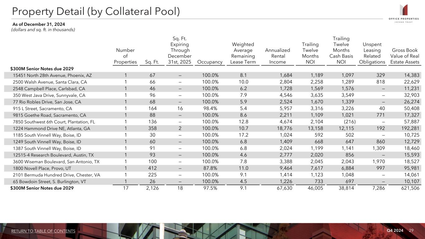 Q4 2024 28RETURN TO TABLE OF CONTENTS Property Detail (by Collateral Pool) As of December 31, 2024 (dollars and sq. ft. in thousands) Number of Properties Sq. Ft. Sq. Ft. Expiring Through December 31st, 2025 Occupancy Weighted Average Remaining Lease Term Annualized Rental Income Trailing Twelve Months NOI Trailing Twelve Months Cash Basis NOI Unspent Leasing Related Obligations Gross Book Value of Real Estate Assets $445M Senior Notes due 2027 - Continued 6315 Hillside Court, Columbia, MD 1 44 29 84.8% 1.1 784 458 501 — 6,053 7001 Columbia Gateway Drive, Columbia, MD 1 117 — 69.5% 5.5 2,380 754 712 1,742 30,883 11411 E. Jefferson Avenue, Detroit, MI (1) 1 56 56 100.0% 0.1 2,352 1,566 1,564 — 14,235 4241 NE 34th Street, Kansas City, MO 1 88 — 100.0% 5.7 2,083 878 871 350 12,065 299 Jefferson Road, Parsippany, NJ 1 151 — —% — — (828) (828) — 20,459 One Jefferson Road, Parsippany, NJ 1 100 100 100.0% 0.7 4,522 2,640 3,213 — 23,718 10b Airline Drive, Colonie, NY 1 64 — 100.0% 6.2 981 338 381 256 10,646 1212 Pittsford - Victor Road, Pittsford, NY 1 55 — 100.0% 5.1 1,144 414 386 — 4,541 8800 Tinicum Boulevard, Philadelphia, PA 1 441 441 100.0% — — 6,342 6,452 — 55,181 446 Wrenplace Road, Fort Mill, SC 1 150 — 100.0% 6.8 2,974 2,765 2,625 — 35,392 1511 East Common Street, New Braunfels, TX 1 63 63 100.0% 0.6 1,095 994 1,007 — 9,641 Freeport Pkwy and Esters Blvd, Irving, TX 3 458 458 100.0% 0.5 6,270 5,982 6,266 — 61,604 45600 Woodland Road, Sterling, VA 1 110 110 100.0% 0.3 3,312 2,126 2,142 — 26,603 45610 Woodland Road, Sterling, VA 1 111 34 87.5% 5.0 2,677 1,251 1,276 365 27,699 7987 Ashton Avenue, Manassas, VA 1 69 69 100.0% 1.1 1,654 961 1,082 — 13,869 9960 Mayland Drive, Richmond, VA 1 173 — 99.0% 2.1 3,576 2,248 2,522 — 27,772 $445M Senior Notes due 2027 37 4,521 1,908 83.8% 6.9 97,331 63,241 53,209 12,364 1,279,487 (1) Classified as held for sale as of December 31, 2024.