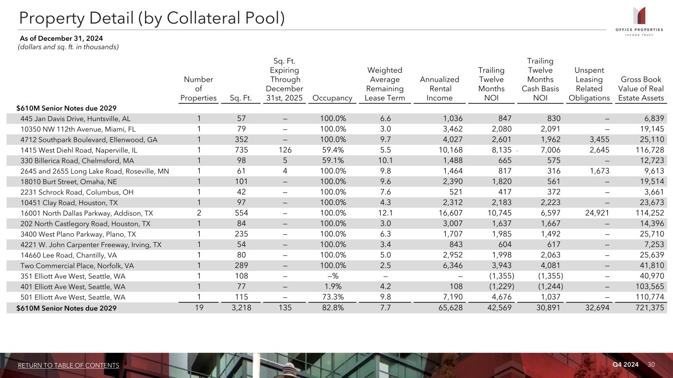 Q4 2024 29RETURN TO TABLE OF CONTENTS Property Detail (by Collateral Pool) As of December 31, 2024 (dollars and sq. ft. in thousands) Number of Properties Sq. Ft. Sq. Ft. Expiring Through December 31st, 2025 Occupancy Weighted Average Remaining Lease Term Annualized Rental Income Trailing Twelve Months NOI Trailing Twelve Months Cash Basis NOI Unspent Leasing Related Obligations Gross Book Value of Real Estate Assets $300M Senior Notes due 2029 15451 North 28th Avenue, Phoenix, AZ 1 67 — 100.0% 8.1 1,684 1,189 1,097 329 14,383 2500 Walsh Avenue, Santa Clara, CA 1 66 — 100.0% 10.0 2,804 2,258 1,289 818 22,629 2548 Campbell Place, Carlsbad, CA 1 46 — 100.0% 6.2 1,728 1,569 1,576 — 11,231 350 West Java Drive, Sunnyvale, CA 1 96 — 100.0% 7.9 4,546 3,635 3,549 — 32,903 77 Rio Robles Drive, San Jose, CA 1 68 — 100.0% 5.9 2,524 1,670 1,339 — 26,274 915 L Street, Sacramento, CA 1 164 16 98.4% 5.4 5,957 3,316 3,226 40 50,408 9815 Goethe Road, Sacramento, CA 1 88 — 100.0% 8.6 2,211 1,109 1,021 771 17,327 7850 Southwest 6th Court, Plantation, FL 1 136 — 100.0% 12.8 4,674 2,104 (216) — 57,887 1224 Hammond Drive NE, Atlanta, GA 1 358 2 100.0% 10.7 18,776 13,158 12,115 192 192,281 1185 South Vinnell Way, Boise, ID 1 30 — 100.0% 17.2 1,024 592 502 — 10,725 1249 South Vinnell Way, Boise, ID 1 60 — 100.0% 6.8 1,409 668 647 860 12,729 1387 South Vinnell Way, Boise, ID 1 91 — 100.0% 6.8 2,024 1,199 1,141 1,309 18,460 12515-4 Research Boulevard, Austin, TX 1 93 — 100.0% 4.6 2,777 2,020 856 — 15,593 3600 Wiseman Boulevard, San Antonio, TX 1 100 — 100.0% 7.8 3,388 2,045 2,043 1,970 18,527 1800 Novell Place, Provo, UT 1 412 — 87.8% 11.0 9,464 7,617 6,884 997 95,981 2101 Bermuda Hundred Drive, Chester, VA 1 225 — 100.0% 9.1 1,414 1,123 1,048 — 14,061 65 Bowdoin Street, S. Burlington, VT 1 26 — 100.0% 4.5 1,226 733 697 — 10,107 $300M Senior Notes due 2029 17 2,126 18 97.5% 9.1 67,630 46,005 38,814 7,286 621,506