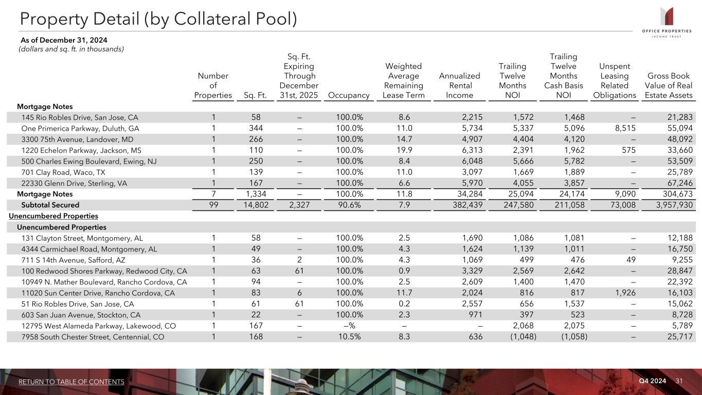 Q4 2024 30RETURN TO TABLE OF CONTENTS Property Detail (by Collateral Pool) As of December 31, 2024 (dollars and sq. ft. in thousands) Number of Properties Sq. Ft. Sq. Ft. Expiring Through December 31st, 2025 Occupancy Weighted Average Remaining Lease Term Annualized Rental Income Trailing Twelve Months NOI Trailing Twelve Months Cash Basis NOI Unspent Leasing Related Obligations Gross Book Value of Real Estate Assets $610M Senior Notes due 2029 445 Jan Davis Drive, Huntsville, AL 1 57 — 100.0% 6.6 1,036 847 830 — 6,839 10350 NW 112th Avenue, Miami, FL 1 79 — 100.0% 3.0 3,462 2,080 2,091 — 19,145 4712 Southpark Boulevard, Ellenwood, GA 1 352 — 100.0% 9.7 4,027 2,601 1,962 3,455 25,110 1415 West Diehl Road, Naperville, IL 1 735 126 59.4% 5.5 10,168 8,135 8,135 7,006 2,645 116,728 330 Billerica Road, Chelmsford, MA 1 98 5 59.1% 10.1 1,488 665 575 — 12,723 2645 and 2655 Long Lake Road, Roseville, MN 1 61 4 100.0% 9.8 1,464 817 316 1,673 9,613 18010 Burt Street, Omaha, NE 1 101 — 100.0% 9.6 2,390 1,820 561 — 19,514 2231 Schrock Road, Columbus, OH 1 42 — 100.0% 7.6 521 417 372 — 3,661 10451 Clay Road, Houston, TX 1 97 — 100.0% 4.3 2,312 2,183 2,223 — 23,673 16001 North Dallas Parkway, Addison, TX 2 554 — 100.0% 12.1 16,607 10,745 6,597 24,921 114,252 202 North Castlegory Road, Houston, TX 1 84 — 100.0% 3.0 3,007 1,637 1,667 — 14,396 3400 West Plano Parkway, Plano, TX 1 235 — 100.0% 6.3 1,707 1,985 1,492 — 25,710 4221 W. John Carpenter Freeway, Irving, TX 1 54 — 100.0% 3.4 843 604 617 — 7,253 14660 Lee Road, Chantilly, VA 1 80 — 100.0% 5.0 2,952 1,998 2,063 — 25,639 Two Commercial Place, Norfolk, VA 1 289 — 100.0% 2.5 6,346 3,943 4,081 — 41,810 351 Elliott Ave West, Seattle, WA 1 108 — —% — — (1,355) (1,355) — 40,970 401 Elliott Ave West, Seattle, WA 1 77 — 1.9% 4.2 108 (1,229) (1,244) — 103,565 501 Elliott Ave West, Seattle, WA 1 115 — 73.3% 9.8 7,190 4,676 1,037 — 110,774 $610M Senior Notes due 2029 19 3,218 135 82.8% 7.7 65,628 42,569 30,891 32,694 721,375