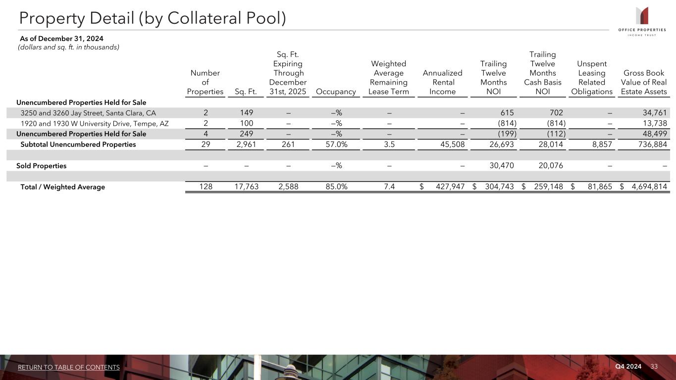 Q4 2024 32RETURN TO TABLE OF CONTENTS Property Detail (by Collateral Pool) As of December 31, 2024 (dollars and sq. ft. in thousands) Number of Properties Sq. Ft. Sq. Ft. Expiring Through December 31st, 2025 Occupancy Weighted Average Remaining Lease Term Annualized Rental Income Trailing Twelve Months NOI Trailing Twelve Months Cash Basis NOI Unspent Leasing Related Obligations Gross Book Value of Real Estate Assets Unencumbered Properties - Continued 1211 Connecticut Avenue, NW, Washington, D.C. 1 140 37 58.5% 6.0 3,285 1,732 1,563 240 69,712 840 First Street, NE, Washington, D.C. 1 253 73 44.3% 2.5 5,947 1,752 1,929 — 148,357 8305 NW 62nd Avenue, Johnston, IA 1 199 — 100.0% 2.0 3,283 2,671 3,109 — 26,861 7601 Interactive Way, Indianapolis, IN 1 120 — 100.0% 2.5 1,910 1,779 1,825 240 16,911 7635 Interactive Way, Indianapolis, IN 1 155 — 100.0% 2.5 2,470 2,297 2,356 304 19,823 2001-2003 Commerce Park Drive, Annapolis, MD 1 52 5 50.1% 5.4 537 64 10 64 9,334 6310 Hillside Court, Columbia, MD 1 43 7 100.0% 4.5 1,147 624 626 — 5,677 3550 Green Court, Ann Arbor, MI 1 82 — 100.0% 2.8 1,721 1,594 1,629 — 13,391 18020 Burt Street, Omaha, NE 1 101 — —% — — 1,418 1,532 — 14,394 9680 Old Bailes Road, Fort Mill, SC 1 60 — 100.0% 2.9 834 702 701 — 6,542 12515-3 Research Boulevard, Austin, TX 1 55 — —% — — (620) (620) — 8,672 2900 West Plano Parkway, Plano, TX 1 191 — 100.0% 6.3 3,544 1,977 1,407 5,832 21,015 1760 Business Center Drive, Reston, VA 1 275 — —% — — (726) (749) — 80,452 1775 Wiehle Avenue, Reston, VA 1 135 9 62.5% 3.4 2,972 1,435 1,543 202 42,676 9201 Forest Hill Avenue, Richmond, VA 1 50 — 100.0% 3.0 1,349 708 793 — 4,917 Vacant land parcels and other — — — —% — — (97) (102) — 38,820 Unencumbered Properties 25 2,712 261 62.2% 3.5 45,508 26,892 28,126 8,857 688,385