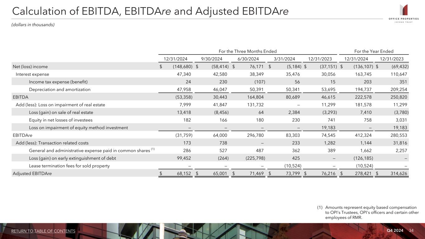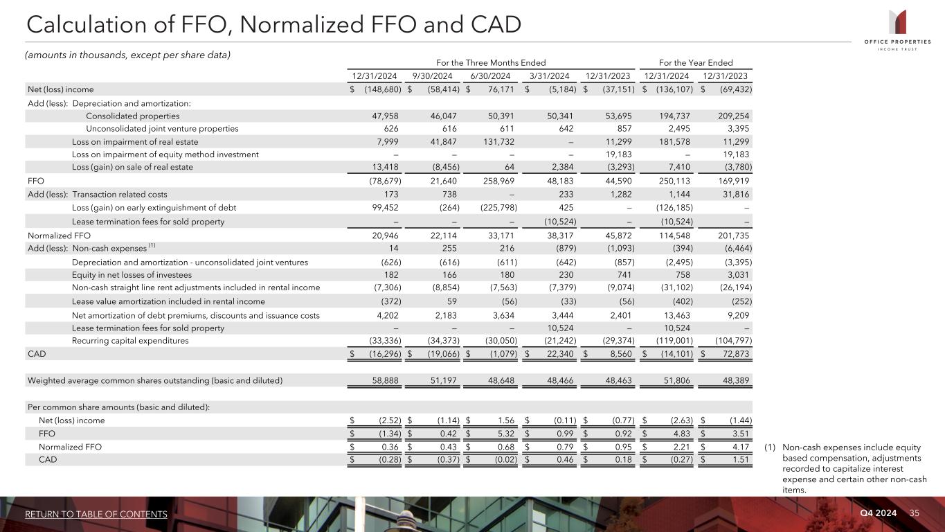 Q4 2024 34RETURN TO TABLE OF CONTENTS For the Three Months Ended For the Year Ended 12/31/2024 9/30/2024 6/30/2024 3/31/2024 12/31/2023 12/31/2024 12/31/2023 Net (loss) income $ (148,680) $ (58,414) $ 76,171 $ (5,184) $ (37,151) $ (136,107) $ (69,432) Interest expense 47,340 42,580 38,349 35,476 30,056 163,745 110,647 Income tax expense (benefit) 24 230 (107) 56 15 203 351 Depreciation and amortization 47,958 46,047 50,391 50,341 53,695 194,737 209,254 EBITDA (53,358) 30,443 164,804 80,689 46,615 222,578 250,820 Add (less): Loss on impairment of real estate 7,999 41,847 131,732 — 11,299 181,578 11,299 Loss (gain) on sale of real estate 13,418 (8,456) 64 2,384 (3,293) 7,410 (3,780) Equity in net losses of investees 182 166 180 230 741 758 3,031 Loss on impairment of equity method investment — — — — 19,183 — 19,183 EBITDAre (31,759) 64,000 296,780 83,303 74,545 412,324 280,553 Add (less): Transaction related costs 173 738 — 233 1,282 1,144 31,816 General and administrative expense paid in common shares (1) 286 527 487 362 389 1,662 2,257 Loss (gain) on early extinguishment of debt 99,452 (264) (225,798) 425 — (126,185) — Lease termination fees for sold property — — — (10,524) — (10,524) — Adjusted EBITDAre $ 68,152 $ 65,001 $ 71,469 $ 73,799 $ 76,216 $ 278,421 $ 314,626 Calculation of EBITDA, EBITDAre and Adjusted EBITDAre (dollars in thousands) (1) Amounts represent equity based compensation to OPI's Trustees, OPI's officers and certain other employees of RMR.