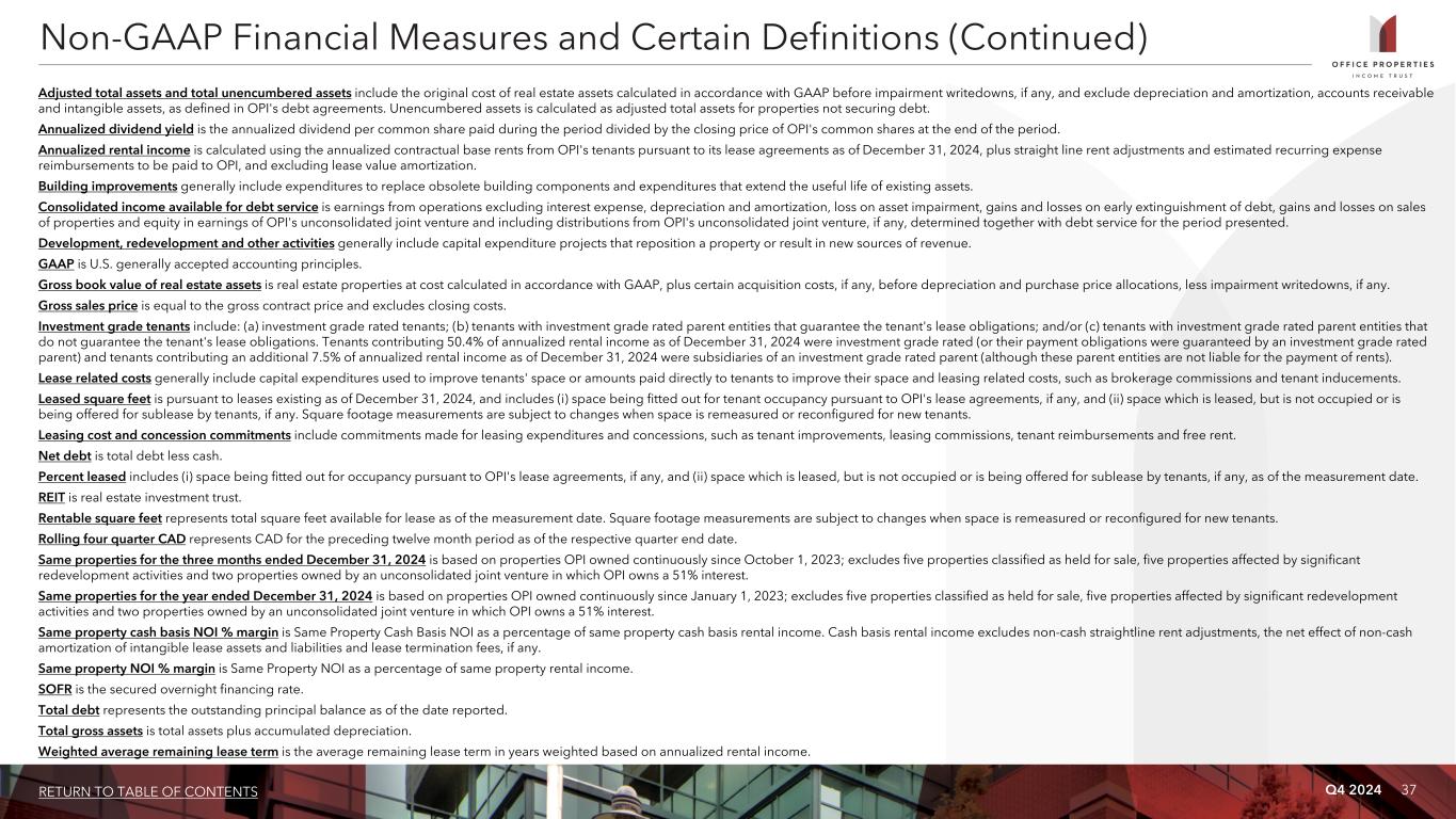 Q4 2024 36RETURN TO TABLE OF CONTENTS Non-GAAP Financial Measures OPI presents certain “non-GAAP financial measures” within the meaning of the applicable rules of the Securities and Exchange Commission, or the SEC, including NOI, Cash Basis NOI, Same Property NOI, Same Property Cash Basis NOI, EBITDA, EBITDAre, Adjusted EBITDAre, FFO, Normalized FFO and CAD. These measures do not represent cash generated by operating activities in accordance with GAAP and should not be considered alternatives to net income (loss) as indicators of OPI's operating performance or as measures of OPI's liquidity. These measures should be considered in conjunction with net income (loss) as presented in OPI's consolidated statements of income (loss). OPI considers these non-GAAP measures to be appropriate supplemental measures of operating performance for a REIT, along with net income (loss). OPI believes these measures provide useful information to investors because by excluding the effects of certain historical amounts, such as depreciation and amortization expense, they may facilitate a comparison of OPI's operating performance between periods and with other REITs and, in the case of NOI, Cash Basis NOI, Same Property NOI and Same Property Cash Basis NOI reflecting only those income and expense items that are generated and incurred at the property level may help both investors and management to understand the operations of OPI's properties. NOI and Cash Basis NOI The calculations of net operating income, or NOI, and Cash Basis NOI exclude certain components of net income (loss) in order to provide results that are more closely related to OPI's property level results of operations. OPI calculates NOI and Cash Basis NOI as shown on page 25 and Same Property NOI and Same Property Cash Basis NOI as shown on page 26. OPI defines NOI as income from OPI's rental of real estate less OPI's property operating expenses. NOI excludes amortization of capitalized tenant improvement costs and leasing commissions that OPI records as depreciation and amortization expense. OPI defines Cash Basis NOI as NOI excluding non-cash straight line rent adjustments, lease value amortization, lease termination fees, if any, and non-cash amortization included in other operating expenses. OPI calculates Same Property NOI and Same Property Cash Basis NOI in the same manner that OPI calculates the corresponding NOI and Cash Basis NOI amounts, except that OPI only includes same properties in calculating Same Property NOI and Same Property Cash Basis NOI. OPI uses NOI, Cash Basis NOI, Same Property NOI and Same Property Cash Basis NOI to evaluate individual and company-wide property level performance. Other real estate companies and REITs may calculate NOI, Cash Basis NOI, Same Property NOI and Same Property Cash Basis NOI differently than OPI does. EBITDA, EBITDAre and Adjusted EBITDAre OPI calculates earnings before interest, taxes, depreciation and amortization, or EBITDA, EBITDA for real estate, or EBITDAre, and Adjusted EBITDAre as shown on page 28. EBITDAre is calculated on the basis defined by The National Association of Real Estate Investment Trusts, or Nareit, which is EBITDA, excluding gains and losses on the sale of real estate, loss on impairment of real estate assets and adjustments to reflect OPI's share of EBITDAre of its unconsolidated joint venture. In calculating Adjusted EBITDAre, OPI adjusts for the items shown on page 28 and includes business management incentive fees, if any, only in the fourth quarter versus the quarter when they are recognized as expense in accordance with GAAP due to their quarterly volatility not necessarily being indicative of OPI's core operating performance and the uncertainty as to whether any such business management incentive fees will be payable when all contingencies for determining such fees are known at the end of the calendar year. Other real estate companies and REITs may calculate EBITDA, EBITDAre and Adjusted EBITDAre differently than OPI does. FFO and Normalized FFO OPI calculates funds from operations, or FFO, and Normalized FFO as shown on page 29. FFO is calculated on the basis defined by Nareit, which is net income (loss), calculated in accordance with GAAP, plus real estate depreciation and amortization of consolidated properties and OPI's proportionate share of the real estate depreciation and amortization of unconsolidated joint venture properties, but excluding impairment charges on real estate assets and any gain or loss on sale of real estate, as well as certain other adjustments currently not applicable to us. In calculating Normalized FFO, OPI adjusts for the other items shown on page 29 and includes business management incentive fees, if any, only in the fourth quarter versus the quarter when they are recognized as an expense in accordance with GAAP due to their quarterly volatility not necessarily being indicative of OPI's core operating performance and the uncertainty as to whether any such business management incentive fees will be payable when all contingencies for determining such fees are known at the end of the calendar year. FFO and Normalized FFO are among the factors considered by OPI's Board of Trustees when determining the amount of distributions to OPI's shareholders. Other factors include, but are not limited to, requirements to maintain OPI's qualification for taxation as a REIT, limitations in OPI's credit agreement and public debt covenants, the availability to OPI of debt and equity capital, OPI's expectation of its future capital requirements and operating performance and OPI's expected needs for and availability of cash to pay its obligations. Other real estate companies and REITs may calculate FFO and Normalized FFO differently than OPI does. Cash Available for Distribution OPI calculates cash available for distribution, or CAD, as shown on page 29. OPI defines CAD as Normalized FFO minus recurring real estate related capital expenditures and adjus