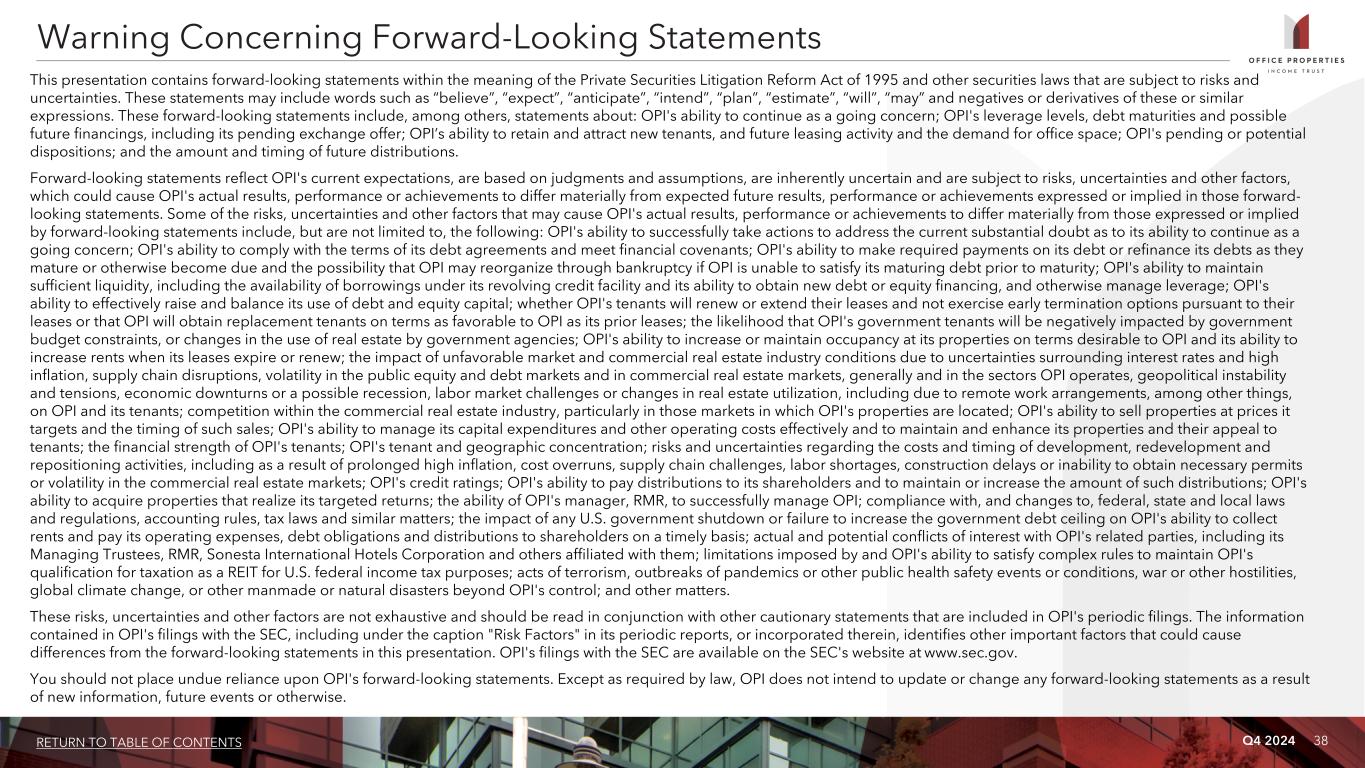 Q4 2024 37RETURN TO TABLE OF CONTENTS Adjusted total assets and total unencumbered assets include the original cost of real estate assets calculated in accordance with GAAP before impairment writedowns, if any, and exclude depreciation and amortization, accounts receivable and intangible assets, as defined in OPI's debt agreements. Unencumbered assets is calculated as adjusted total assets for properties not securing debt. Annualized dividend yield is the annualized dividend per common share paid during the period divided by the closing price of OPI's common shares at the end of the period. Annualized rental income is calculated using the annualized contractual base rents from OPI's tenants pursuant to its lease agreements as of December 31, 2024, plus straight line rent adjustments and estimated recurring expense reimbursements to be paid to OPI, and excluding lease value amortization. Building improvements generally include expenditures to replace obsolete building components and expenditures that extend the useful life of existing assets. Consolidated income available for debt service is earnings from operations excluding interest expense, depreciation and amortization, loss on asset impairment, gains and losses on early extinguishment of debt, gains and losses on sales of properties and equity in earnings of OPI's unconsolidated joint venture and including distributions from OPI's unconsolidated joint venture, if any, determined together with debt service for the period presented. Development, redevelopment and other activities generally include capital expenditure projects that reposition a property or result in new sources of revenue. GAAP is U.S. generally accepted accounting principles. Gross book value of real estate assets is real estate properties at cost calculated in accordance with GAAP, plus certain acquisition costs, if any, before depreciation and purchase price allocations, less impairment writedowns, if any. Gross sales price is equal to the gross contract price and excludes closing costs. Investment grade tenants include: (a) investment grade rated tenants; (b) tenants with investment grade rated parent entities that guarantee the tenant's lease obligations; and/or (c) tenants with investment grade rated parent entities that do not guarantee the tenant's lease obligations. Tenants contributing 50.4% of annualized rental income as of December 31, 2024 were investment grade rated (or their payment obligations were guaranteed by an investment grade rated parent) and tenants contributing an additional 7.5% of annualized rental income as of December 31, 2024 were subsidiaries of an investment grade rated parent (although these parent entities are not liable for the payment of rents). Lease related costs generally include capital expenditures used to improve tenants' space or amounts paid directly to tenants to improve their space and leasing related costs, such as brokerage commissions and tenant inducements. Leased square feet is pursuant to leases existing as of December 31, 2024, and includes (i) space being fitted out for tenant occupancy pursuant to OPI's lease agreements, if any, and (ii) space which is leased, but is not occupied or is being offered for sublease by tenants, if any. Square footage measurements are subject to changes when space is remeasured or reconfigured for new tenants. Leasing cost and concession commitments include commitments made for leasing expenditures and concessions, such as tenant improvements, leasing commissions, tenant reimbursements and free rent. Net debt is total debt less cash. Percent leased includes (i) space being fitted out for occupancy pursuant to OPI's lease agreements, if any, and (ii) space which is leased, but is not occupied or is being offered for sublease by tenants, if any, as of the measurement date. REIT is real estate investment trust. Rentable square feet represents total square feet available for lease as of the measurement date. Square footage measurements are subject to changes when space is remeasured or reconfigured for new tenants. Rolling four quarter CAD represents CAD for the preceding twelve month period as of the respective quarter end date. Same properties for the three months ended December 31, 2024 is based on properties OPI owned continuously since October 1, 2023; excludes five properties classified as held for sale, five properties affected by significant redevelopment activities and two properties owned by an unconsolidated joint venture in which OPI owns a 51% interest. Same properties for the year ended December 31, 2024 is based on properties OPI owned continuously since January 1, 2023; excludes five properties classified as held for sale, five properties affected by significant redevelopment activities and two properties owned by an unconsolidated joint venture in which OPI owns a 51% interest. Same property cash basis NOI % margin is Same Property Cash Basis NOI as a percentage of same property cash basis rental income. Cash basis rental income excludes non-cash straightline rent adjustments, the net effect of non-cash amortization of intangible lease assets and liabilities and lease termination fees, if any. Same property NOI % margin is Same Property NOI as a percentage of same property rental income. SOFR is the secured overnight financing rate. Total debt represents the outstanding principal balance as of the date reported. Total gross assets is total assets plus accumulated depreciation. Weighted average remaining lease term is the average remaining lease term in years weighted based on annualized rental income. Non-GAAP Financial Measures and Certain Definitions (Continued)