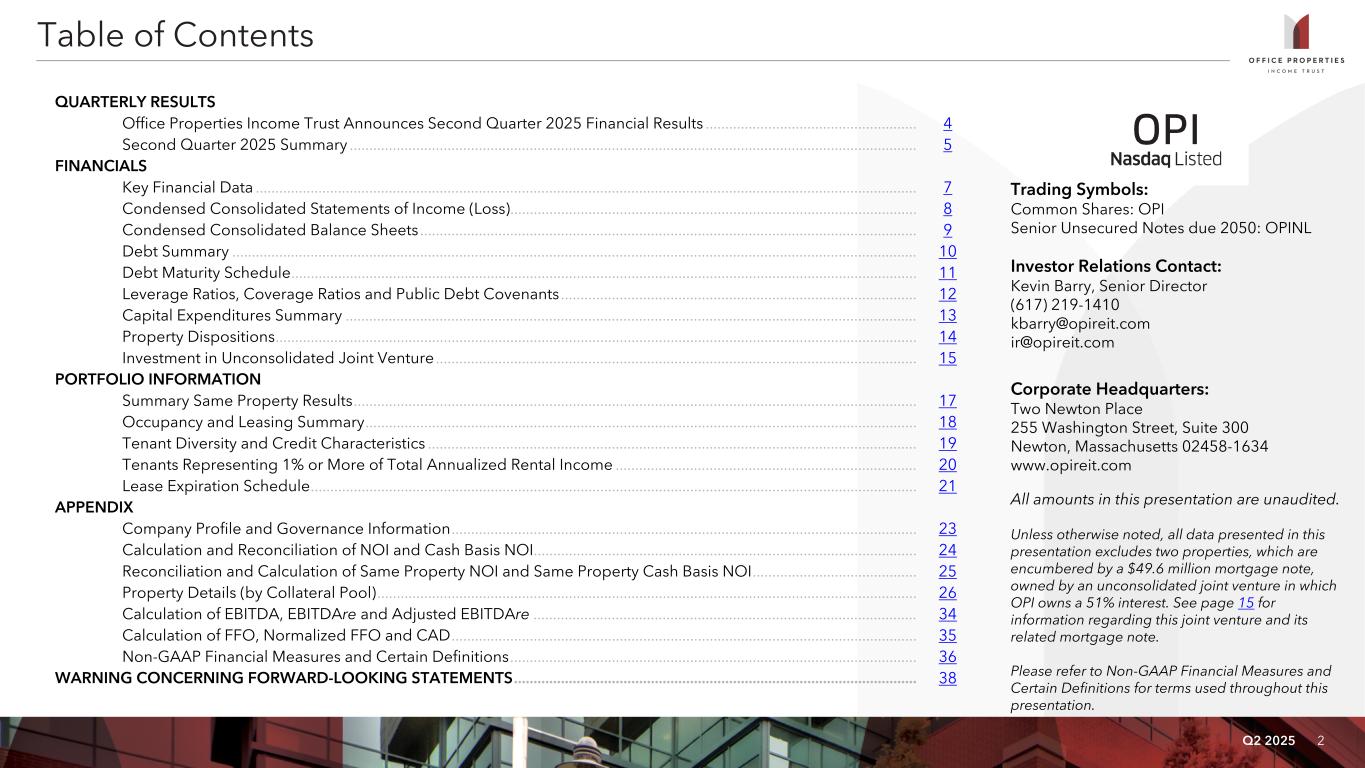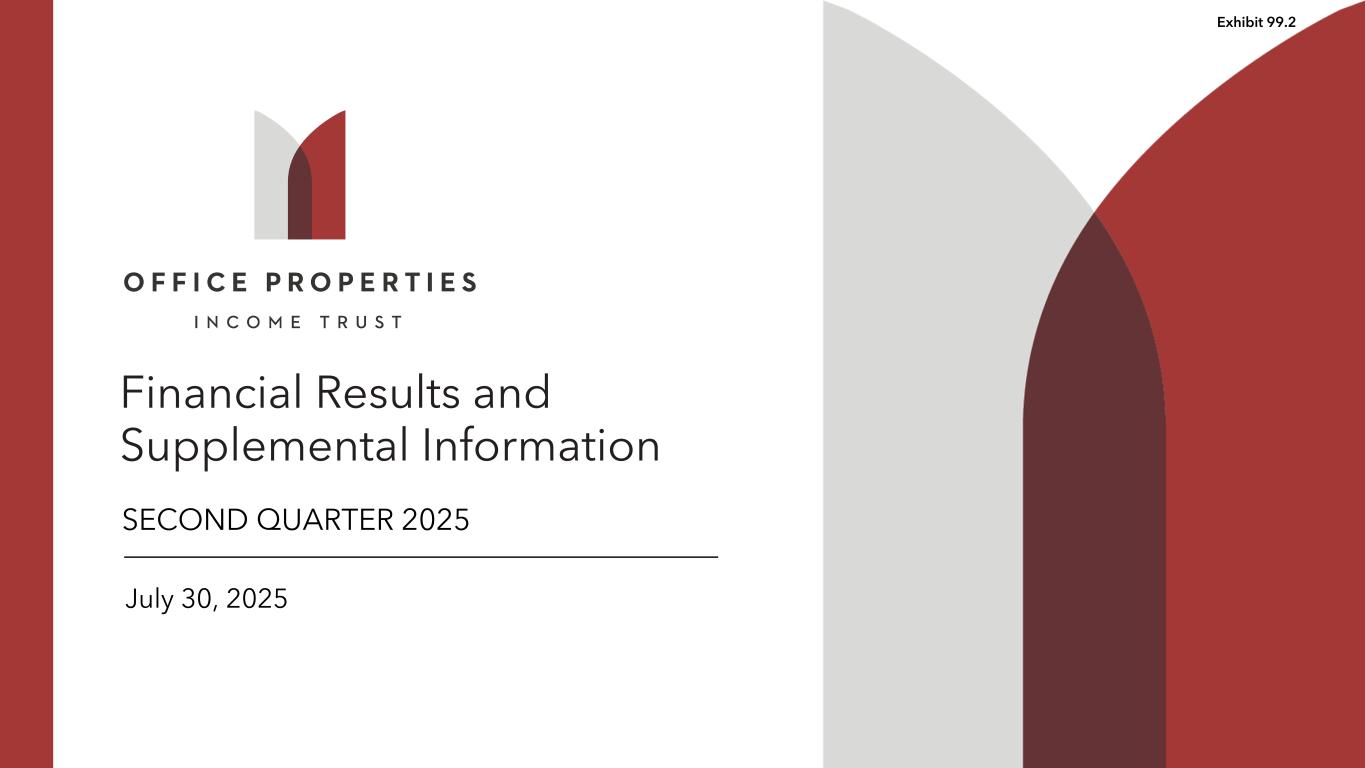 2Q2 2025 Table of Contents QUARTERLY RESULTS Office Properties Income Trust Announces Second Quarter 2025 Financial Results ...................................................... 4 Second Quarter 2025 Summary ................................................................................................................................................. 5 FINANCIALS Key Financial Data ......................................................................................................................................................................... 7 Condensed Consolidated Statements of Income (Loss) ........................................................................................................ 8 Condensed Consolidated Balance Sheets ............................................................................................................................... 9 Debt Summary ............................................................................................................................................................................... 10 Debt Maturity Schedule ................................................................................................................................................................ 11 Leverage Ratios, Coverage Ratios and Public Debt Covenants ........................................................................................... 12 Capital Expenditures Summary .................................................................................................................................................. 13 Property Dispositions .................................................................................................................................................................... 14 Investment in Unconsolidated Joint Venture ........................................................................................................................... 15 PORTFOLIO INFORMATION Summary Same Property Results ................................................................................................................................................ 17 Occupancy and Leasing Summary ............................................................................................................................................. 18 Tenant Diversity and Credit Characteristics ............................................................................................................................. 19 Tenants Representing 1% or More of Total Annualized Rental Income ............................................................................. 20 Lease Expiration Schedule ........................................................................................................................................................... 21 APPENDIX Company Profile and Governance Information ....................................................................................................................... 23 Calculation and Reconciliation of NOI and Cash Basis NOI .................................................................................................. 24 Reconciliation and Calculation of Same Property NOI and Same Property Cash Basis NOI .......................................... 25 Property Details (by Collateral Pool) .......................................................................................................................................... 26 Calculation of EBITDA, EBITDAre and Adjusted EBITDAre .................................................................................................. 34 Calculation of FFO, Normalized FFO and CAD ....................................................................................................................... 35 Non-GAAP Financial Measures and Certain Definitions ........................................................................................................ 36 WARNING CONCERNING FORWARD-LOOKING STATEMENTS ....................................................................................................... 38 Trading Symbols: Common Shares: OPI Senior Unsecured Notes due 2050: OPINL Investor Relations Contact: Kevin Barry, Senior Director (617) 219-1410 kbarry@opireit.com ir@opireit.com Corporate Headquarters: Two Newton Place 255 Washington Street, Suite 300 Newton, Massachusetts 02458-1634 www.opireit.com All amounts in this presentation are unaudited. Unless otherwise noted, all data presented in this presentation excludes two properties, which are encumbered by a $49.6 million mortgage note, owned by an unconsolidated joint venture in which OPI owns a 51% interest. See page 15 for information regarding this joint venture and its related mortgage note. Please refer to Non-GAAP Financial Measures and Certain Definitions for terms used throughout this presentation.
