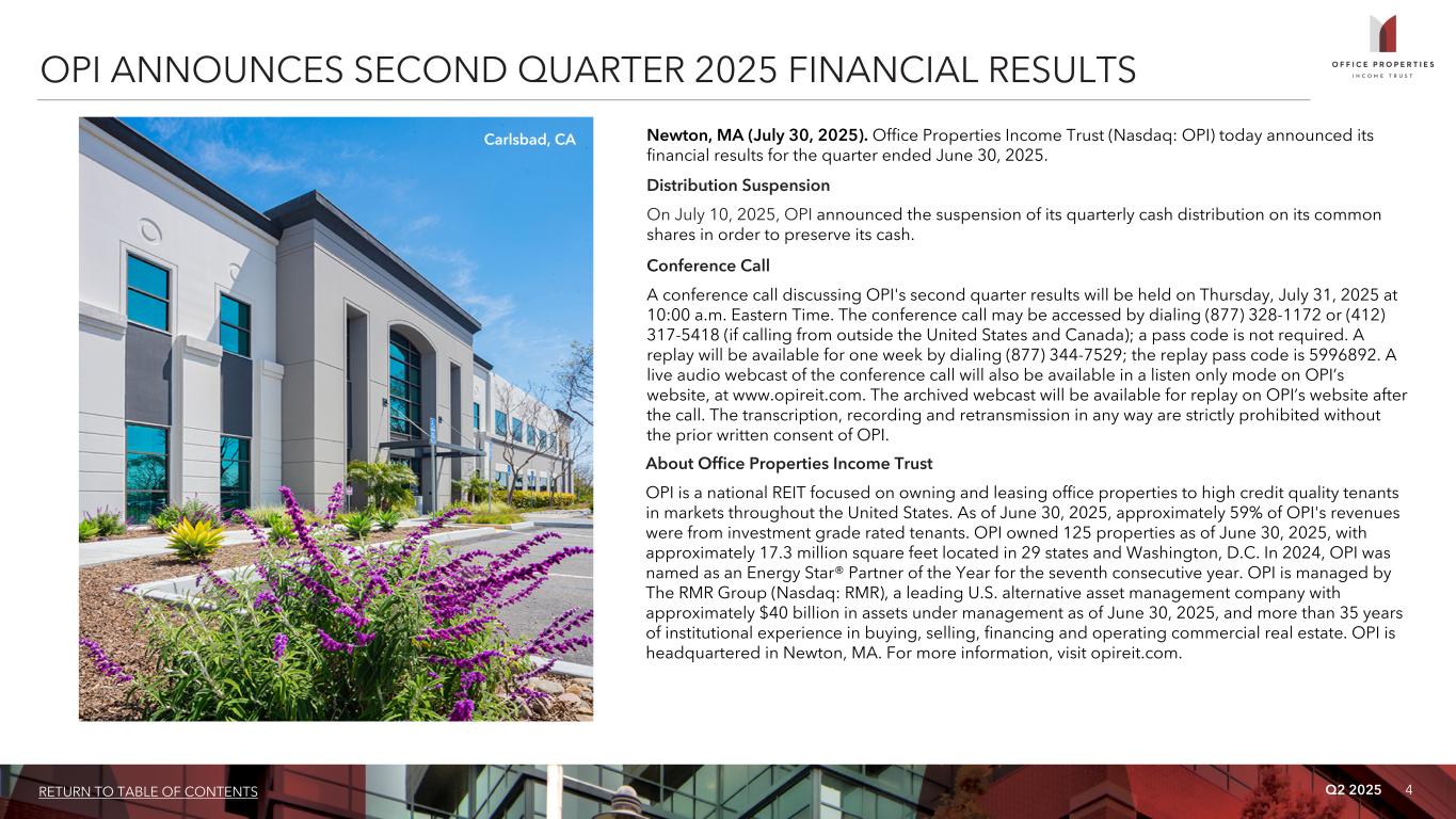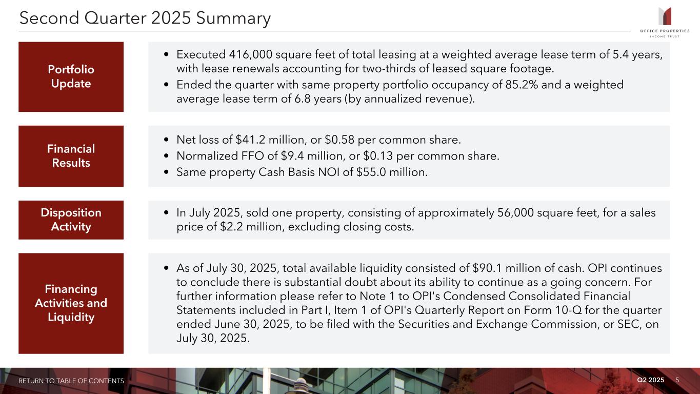 4RETURN TO TABLE OF CONTENTS Q2 2025 OPI ANNOUNCES SECOND QUARTER 2025 FINANCIAL RESULTS Newton, MA (July 30, 2025). Office Properties Income Trust (Nasdaq: OPI) today announced its financial results for the quarter ended June 30, 2025. Distribution Suspension On July 10, 2025, OPI announced the suspension of its quarterly cash distribution on its common shares in order to preserve its cash. Conference Call A conference call discussing OPI's second quarter results will be held on Thursday, July 31, 2025 at 10:00 a.m. Eastern Time. The conference call may be accessed by dialing (877) 328-1172 or (412) 317-5418 (if calling from outside the United States and Canada); a pass code is not required. A replay will be available for one week by dialing (877) 344-7529; the replay pass code is 5996892. A live audio webcast of the conference call will also be available in a listen only mode on OPI’s website, at www.opireit.com. The archived webcast will be available for replay on OPI’s website after the call. The transcription, recording and retransmission in any way are strictly prohibited without the prior written consent of OPI. About Office Properties Income Trust OPI is a national REIT focused on owning and leasing office properties to high credit quality tenants in markets throughout the United States. As of June 30, 2025, approximately 59% of OPI's revenues were from investment grade rated tenants. OPI owned 125 properties as of June 30, 2025, with approximately 17.3 million square feet located in 29 states and Washington, D.C. In 2024, OPI was named as an Energy Star® Partner of the Year for the seventh consecutive year. OPI is managed by The RMR Group (Nasdaq: RMR), a leading U.S. alternative asset management company with approximately $40 billion in assets under management as of June 30, 2025, and more than 35 years of institutional experience in buying, selling, financing and operating commercial real estate. OPI is headquartered in Newton, MA. For more information, visit opireit.com. Carlsbad, CA