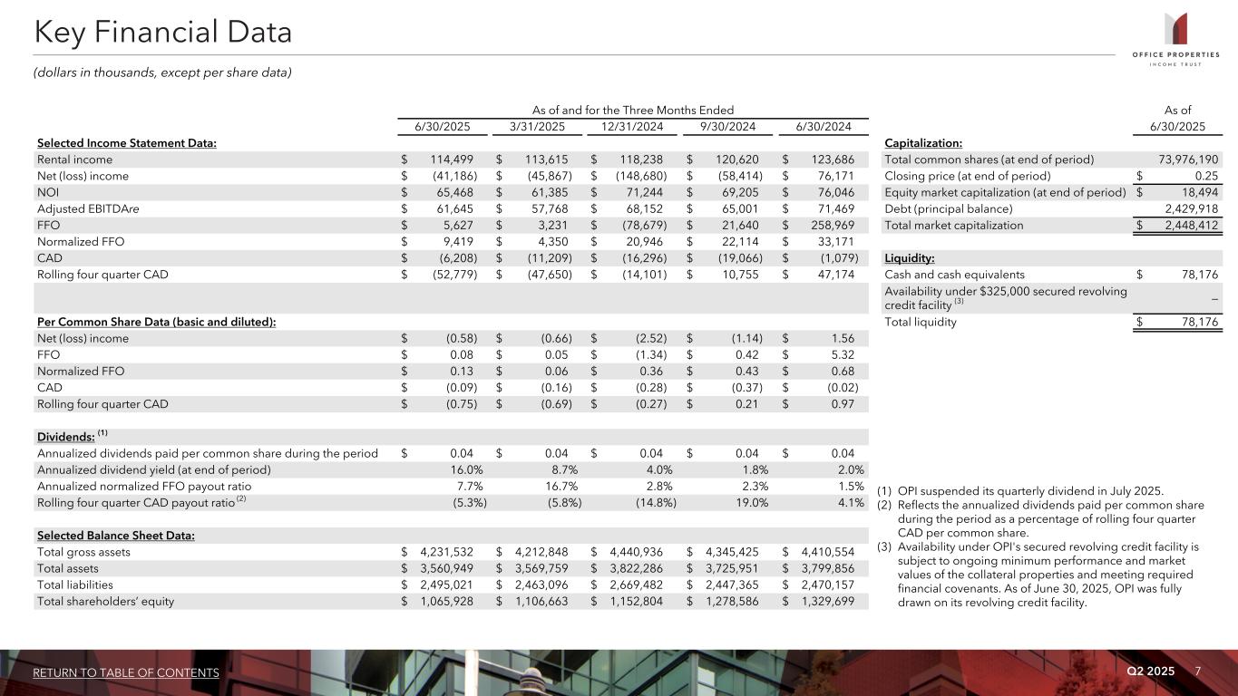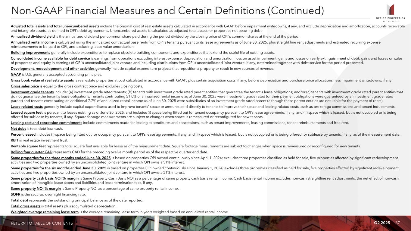 36RETURN TO TABLE OF CONTENTS Q2 2025 Non-GAAP Financial Measures OPI presents certain “non-GAAP financial measures” within the meaning of the applicable rules of the Securities and Exchange Commission, or the SEC, including NOI, Cash Basis NOI, Same Property NOI, Same Property Cash Basis NOI, EBITDA, EBITDAre, Adjusted EBITDAre, FFO, Normalized FFO and CAD. These measures do not represent cash generated by operating activities in accordance with GAAP and should not be considered alternatives to net income (loss) as indicators of OPI's operating performance or as measures of OPI's liquidity. These measures should be considered in conjunction with net income (loss) as presented in OPI's consolidated statements of income (loss). OPI considers these non-GAAP measures to be appropriate supplemental measures of operating performance for a REIT, along with net income (loss). OPI believes these measures provide useful information to investors because by excluding the effects of certain historical amounts, such as depreciation and amortization expense, they may facilitate a comparison of OPI's operating performance between periods and with other REITs and, in the case of NOI, Cash Basis NOI, Same Property NOI and Same Property Cash Basis NOI reflecting only those income and expense items that are generated and incurred at the property level may help both investors and management to understand the operations of OPI's properties. NOI and Cash Basis NOI The calculations of net operating income, or NOI, and Cash Basis NOI exclude certain components of net income (loss) in order to provide results that are more closely related to OPI's property level results of operations. OPI calculates NOI and Cash Basis NOI as shown on page 24 and Same Property NOI and Same Property Cash Basis NOI as shown on page 25. OPI defines NOI as income from OPI's real estate less OPI's property operating expenses. NOI excludes amortization of capitalized tenant improvement costs and leasing commissions that OPI records as depreciation and amortization expense. OPI defines Cash Basis NOI as NOI excluding non-cash straight line rent adjustments, lease value amortization, lease termination fees, if any, and non-cash amortization included in other operating expenses. OPI calculates Same Property NOI and Same Property Cash Basis NOI in the same manner that OPI calculates the corresponding NOI and Cash Basis NOI amounts, except that OPI only includes same properties in calculating Same Property NOI and Same Property Cash Basis NOI. OPI uses NOI, Cash Basis NOI, Same Property NOI and Same Property Cash Basis NOI to evaluate individual and company-wide property level performance. Other real estate companies and REITs may calculate NOI, Cash Basis NOI, Same Property NOI and Same Property Cash Basis NOI differently than OPI does. EBITDA, EBITDAre and Adjusted EBITDAre OPI calculates earnings before interest, taxes, depreciation and amortization, or EBITDA, EBITDA for real estate, or EBITDAre, and Adjusted EBITDAre as shown on page 34. EBITDAre is calculated on the basis defined by The National Association of Real Estate Investment Trusts, or Nareit, which is EBITDA, excluding gains and losses on the sale of real estate, loss on impairment of real estate assets and adjustments to reflect OPI's share of EBITDAre of its unconsolidated joint venture. In calculating Adjusted EBITDAre, OPI adjusts for the items shown on page 34 and includes business management incentive fees, if any, only in the fourth quarter versus the quarter when they are recognized as expense in accordance with GAAP due to their quarterly volatility not necessarily being indicative of OPI's core operating performance and the uncertainty as to whether any such business management incentive fees will be payable when all contingencies for determining such fees are known at the end of the calendar year. Other real estate companies and REITs may calculate EBITDA, EBITDAre and Adjusted EBITDAre differently than OPI does. FFO and Normalized FFO OPI calculates funds from operations, or FFO, and Normalized FFO as shown on page 35. FFO is calculated on the basis defined by Nareit, which is net income (loss), calculated in accordance with GAAP, plus real estate depreciation and amortization of consolidated properties and OPI's proportionate share of the real estate depreciation and amortization of unconsolidated joint venture properties, but excluding impairment charges on real estate assets and any gain or loss on sale of real estate, as well as certain other adjustments currently not applicable to us. In calculating Normalized FFO, OPI adjusts for the other items shown on page 35 and includes business management incentive fees, if any, only in the fourth quarter versus the quarter when they are recognized as an expense in accordance with GAAP due to their quarterly volatility not necessarily being indicative of OPI's core operating performance and the uncertainty as to whether any such business management incentive fees will be payable when all contingencies for determining such fees are known at the end of the calendar year. FFO and Normalized FFO are among the factors considered by OPI's Board of Trustees when determining the amount of distributions to OPI's shareholders. Other factors include, but are not limited to, requirements to maintain OPI's qualification for taxation as a REIT, limitations in OPI's credit agreement and public debt covenants, the availability to OPI of debt and equity capital, OPI's expectation of its future capital requirements and operating performance and OPI's expected needs for and availability of cash to pay its obligations. Other real estate companies and REITs may calculate FFO and Normalized FFO differently than OPI does. Cash Available for Distribution OPI calculates cash available for distribution, or CAD, as shown on page 35. OPI defines CAD as Normalized FFO minus recurring real estate related capital expenditures and adjusted for ot