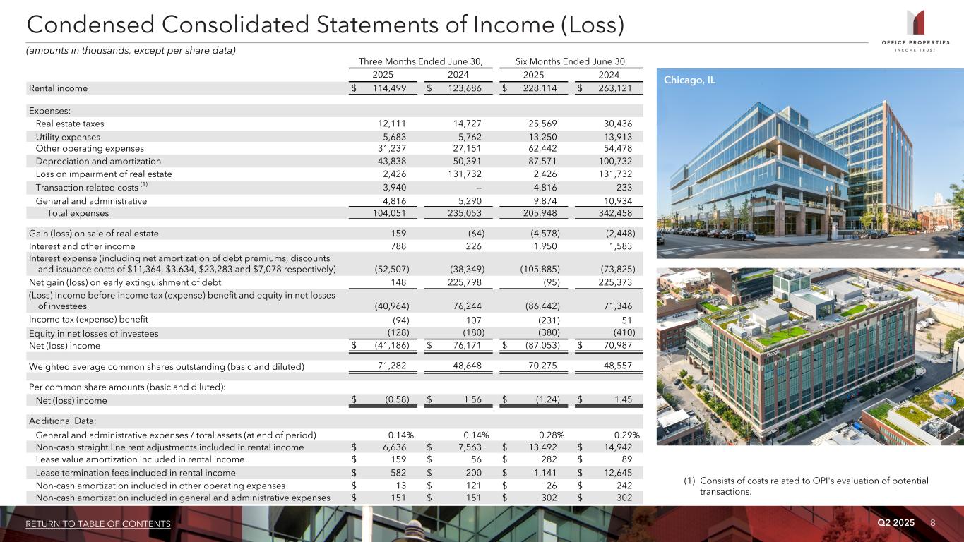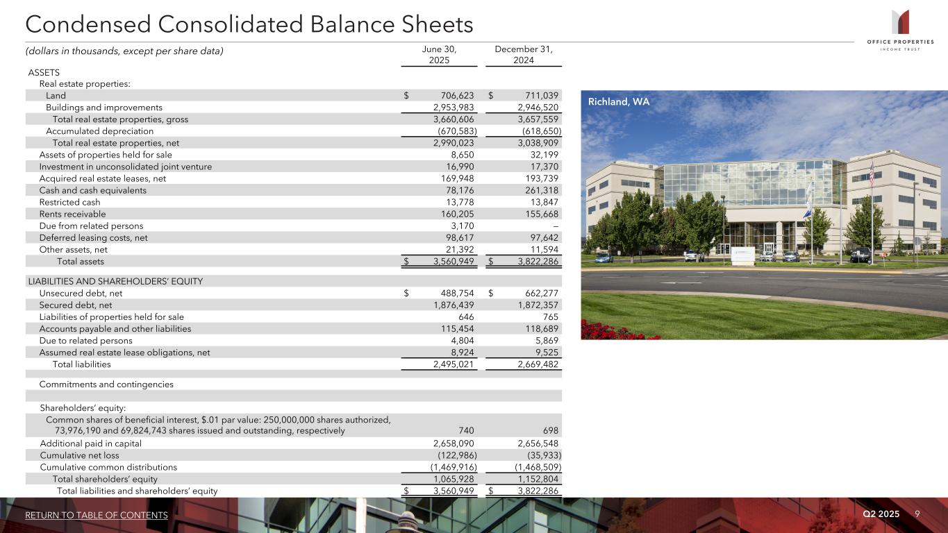 Q2 2025 8RETURN TO TABLE OF CONTENTS Chicago, IL Three Months Ended June 30, Six Months Ended June 30, 2025 2024 2025 2024 Rental income $ 114,499 $ 123,686 $ 228,114 $ 263,121 Expenses:   Real estate taxes 12,111 14,727 25,569 30,436 Utility expenses 5,683 5,762 13,250 13,913 Other operating expenses 31,237 27,151 62,442 54,478 Depreciation and amortization 43,838 50,391 87,571 100,732 Loss on impairment of real estate 2,426 131,732 2,426 131,732 Transaction related costs (1) 3,940 — 4,816 233 General and administrative 4,816 5,290 9,874 10,934 Total expenses 104,051 235,053 205,948 342,458 Gain (loss) on sale of real estate 159 (64) (4,578) (2,448) Interest and other income 788 226 1,950 1,583 Interest expense (including net amortization of debt premiums, discounts and issuance costs of $11,364, $3,634, $23,283 and $7,078 respectively) (52,507) (38,349) (105,885) (73,825) Net gain (loss) on early extinguishment of debt 148 225,798 (95) 225,373 (Loss) income before income tax (expense) benefit and equity in net losses of investees (40,964) 76,244 (86,442) 71,346 Income tax (expense) benefit (94) 107 (231) 51 Equity in net losses of investees (128) (180) (380) (410) Net (loss) income $ (41,186) $ 76,171 $ (87,053) $ 70,987 Weighted average common shares outstanding (basic and diluted) 71,282 48,648 70,275 48,557 Per common share amounts (basic and diluted):         Net (loss) income $ (0.58) $ 1.56 $ (1.24) $ 1.45 Additional Data: General and administrative expenses / total assets (at end of period) 0.14% 0.14% 0.28% 0.29% Non-cash straight line rent adjustments included in rental income $ 6,636 $ 7,563 $ 13,492 $ 14,942 Lease value amortization included in rental income $ 159 $ 56 $ 282 $ 89 Lease termination fees included in rental income $ 582 $ 200 $ 1,141 $ 12,645 Non-cash amortization included in other operating expenses $ 13 $ 121 $ 26 $ 242 Non-cash amortization included in general and administrative expenses $ 151 $ 151 $ 302 $ 302 (amounts in thousands, except per share data) (1) Consists of costs related to OPI's evaluation of potential transactions. Condensed Consolidated Statements of Income (Loss)