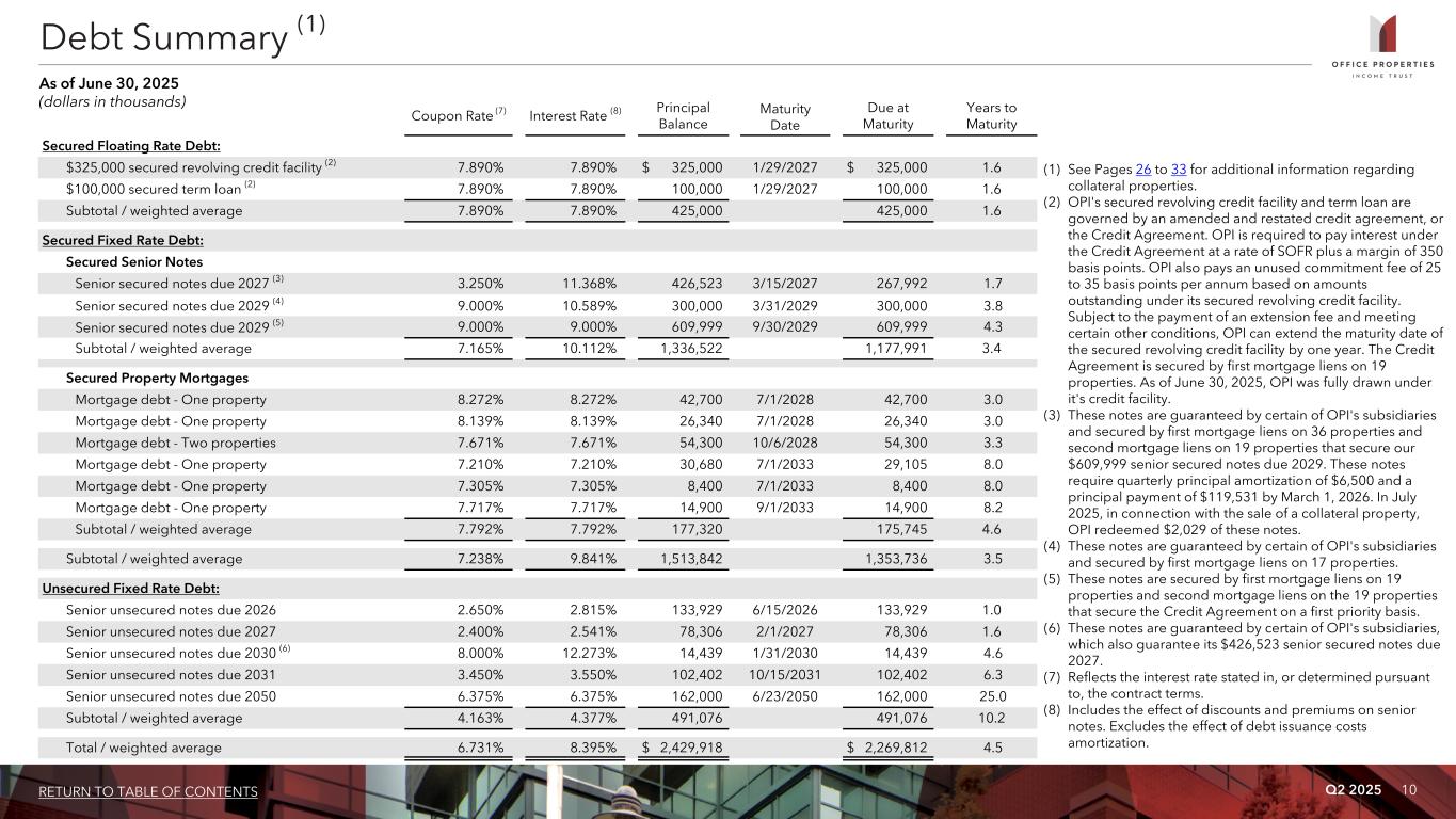 38RETURN TO TABLE OF CONTENTS Q2 2025 Warning Concerning Forward-Looking Statements This presentation contains forward-looking statements within the meaning of the Private Securities Litigation Reform Act of 1995 and other securities laws that are subject to risks and uncertainties. These statements may include words such as “believe”, “expect”, “anticipate”, “intend”, “plan”, “estimate”, “will”, “may” and negatives or derivatives of these or similar expressions. These forward- looking statements include, among others, statements about: OPI's ability to continue as a going concern; OPI's leverage levels and debt service costs, debt maturities, liquidity and covenant constraints and financing strategies; OPI’s ability to retain and attract new tenants, and future leasing activity and the demand for office space; OPI's pending or potential dispositions; and the amount and timing of future distributions. Forward-looking statements reflect OPI's current expectations, are based on judgments and assumptions, are inherently uncertain and are subject to risks, uncertainties and other factors, which could cause OPI's actual results, performance or achievements to differ materially from expected future results, performance or achievements expressed or implied in those forward- looking statements. Some of the risks, uncertainties and other factors that may cause OPI's actual results, performance or achievements to differ materially from those expressed or implied by forward- looking statements include, but are not limited to, the following: OPI's ability to successfully take actions to address the current substantial doubt as to its ability to continue as a going concern; OPI's ability to comply with the terms of its debt agreements and meet financial covenants; OPI's ability to make required payments on its debt or refinance its debts as they mature or otherwise become due and the possibility that OPI may reorganize through bankruptcy if OPI is unable to satisfy its maturing debt prior to maturity; OPI's ability to maintain sufficient liquidity, including the availability of borrowings under its revolving credit facility and its ability to obtain new debt or equity financing, and otherwise manage leverage; OPI's ability to effectively raise and balance its use of debt and equity capital; whether OPI's tenants will renew or extend their leases and not exercise early termination options pursuant to their leases or that OPI will obtain replacement tenants on terms as favorable to OPI as its prior leases; the likelihood that OPI's government tenants will be negatively impacted by government budget constraints, or changes in the use of real estate by government agencies; OPI's ability to increase or maintain occupancy at its properties on terms desirable to OPI and its ability to increase rents when its leases expire or renew; the impact of unfavorable market and commercial real estate industry conditions due to uncertainties surrounding interest rates and high inflation, impacts of tariffs on imports, supply chain disruptions, volatility in the public equity and debt markets and in commercial real estate markets, generally and in the sectors OPI operates, geopolitical instability and tensions, economic downturns or a possible recession, labor market challenges or changes in real estate utilization, including due to remote work arrangements, among other things, on OPI and its tenants; OPI's tenant and geographic concentration; competition within the commercial real estate industry, particularly in those markets in which OPI's properties are located; OPI's ability to sell properties at prices it targets and the timing of such sales; OPI's ability to manage its capital expenditures and other operating costs effectively and to maintain and enhance its properties and their appeal to tenants; the financial strength of OPI's tenants; risks and uncertainties regarding the costs and timing of development, redevelopment and repositioning activities, including as a result of prolonged high inflation, cost overruns, supply chain challenges, tariffs, labor shortages, construction delays or inability to obtain necessary permits or volatility in the commercial real estate markets; OPI's credit ratings; OPI's ability to pay distributions to its shareholders and to maintain or increase the amount of such distributions; the ability of OPI's manager, RMR, to successfully manage OPI; compliance with, and changes to, federal, state and local laws and regulations, accounting rules, tax laws and similar matters; the impact of any U.S. government shutdown, elimination or reduction of government agencies and programs or failure to increase the government debt ceiling on OPI's ability to collect rents and pay its operating expenses, debt obligations and distributions to shareholders on a timely basis; actual and potential conflicts of interest with OPI's related parties, including its Managing Trustees, RMR, Sonesta International Hotels Corporation and others affiliated with them; limitations imposed by and OPI's ability to satisfy complex rules to maintain OPI's qualification for taxation as a REIT for U.S. federal income tax purposes; acts of terrorism, outbreaks of pandemics or other public health safety events or conditions, war or other hostilities, global climate change, or other manmade or natural disasters beyond OPI's control; and other matters. These risks, uncertainties and other factors are not exhaustive and should be read in conjunction with other cautionary statements that are included in OPI's periodic filings. The information contained in OPI's filings with the SEC, including under the caption "Risk Factors" in its periodic reports, or incorporated therein, identifies other important factors that could cause differences from the forward-looking statements in this presentation. OPI's filings with the SEC are available on the SEC's website at www.sec.gov. You should not place un