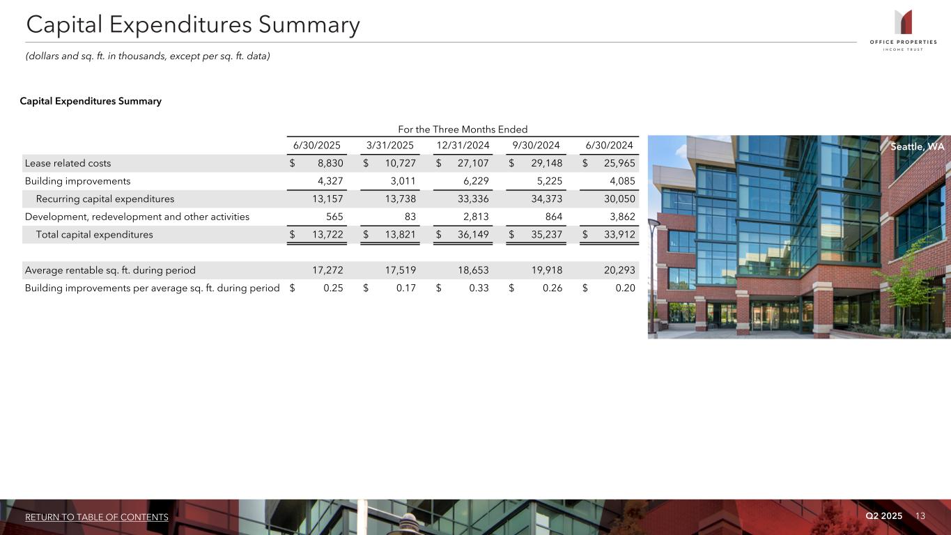 Q2 2025 13RETURN TO TABLE OF CONTENTS For the Three Months Ended 6/30/2025 3/31/2025 12/31/2024 9/30/2024 6/30/2024 Lease related costs $ 8,830 $ 10,727 $ 27,107 $ 29,148 $ 25,965 Building improvements 4,327 3,011 6,229 5,225 4,085 Recurring capital expenditures 13,157 13,738 33,336 34,373 30,050 Development, redevelopment and other activities 565 83 2,813 864 3,862 Total capital expenditures $ 13,722 $ 13,821 $ 36,149 $ 35,237 $ 33,912 Average rentable sq. ft. during period 17,272 17,519 18,653 19,918 20,293 Building improvements per average sq. ft. during period $ 0.25 $ 0.17 $ 0.33 $ 0.26 $ 0.20 Capital Expenditures Summary (dollars and sq. ft. in thousands, except per sq. ft. data) Capital Expenditures Summary Seattle, WA