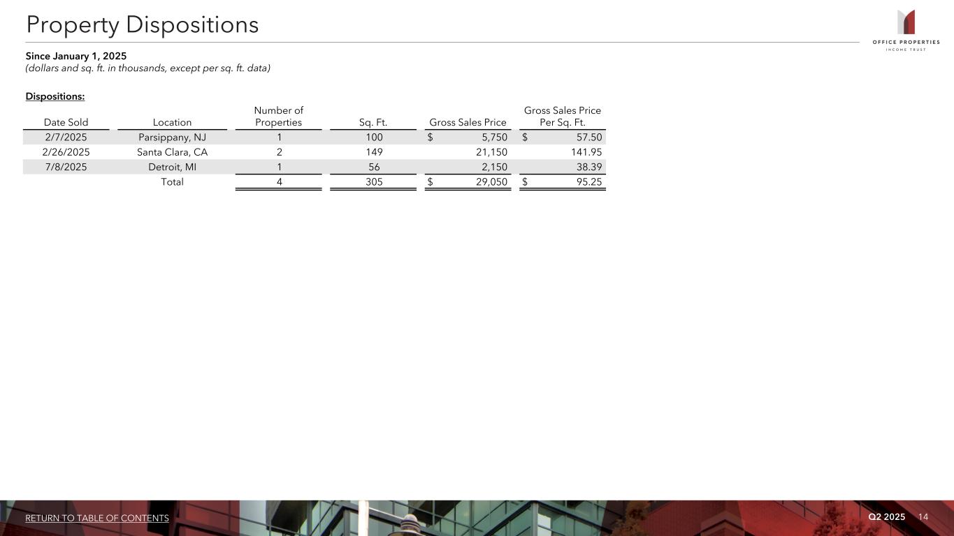 38RETURN TO TABLE OF CONTENTS Q2 2025 Warning Concerning Forward-Looking Statements This presentation contains forward-looking statements within the meaning of the Private Securities Litigation Reform Act of 1995 and other securities laws that are subject to risks and uncertainties. These statements may include words such as “believe”, “expect”, “anticipate”, “intend”, “plan”, “estimate”, “will”, “may” and negatives or derivatives of these or similar expressions. These forward- looking statements include, among others, statements about: OPI's ability to continue as a going concern; OPI's leverage levels and debt service costs, debt maturities, liquidity and covenant constraints and financing strategies; OPI’s ability to retain and attract new tenants, and future leasing activity and the demand for office space; OPI's pending or potential dispositions; and the amount and timing of future distributions. Forward-looking statements reflect OPI's current expectations, are based on judgments and assumptions, are inherently uncertain and are subject to risks, uncertainties and other factors, which could cause OPI's actual results, performance or achievements to differ materially from expected future results, performance or achievements expressed or implied in those forward- looking statements. Some of the risks, uncertainties and other factors that may cause OPI's actual results, performance or achievements to differ materially from those expressed or implied by forward- looking statements include, but are not limited to, the following: OPI's ability to successfully take actions to address the current substantial doubt as to its ability to continue as a going concern; OPI's ability to comply with the terms of its debt agreements and meet financial covenants; OPI's ability to make required payments on its debt or refinance its debts as they mature or otherwise become due and the possibility that OPI may reorganize through bankruptcy if OPI is unable to satisfy its maturing debt prior to maturity; OPI's ability to maintain sufficient liquidity, including the availability of borrowings under its revolving credit facility and its ability to obtain new debt or equity financing, and otherwise manage leverage; OPI's ability to effectively raise and balance its use of debt and equity capital; whether OPI's tenants will renew or extend their leases and not exercise early termination options pursuant to their leases or that OPI will obtain replacement tenants on terms as favorable to OPI as its prior leases; the likelihood that OPI's government tenants will be negatively impacted by government budget constraints, or changes in the use of real estate by government agencies; OPI's ability to increase or maintain occupancy at its properties on terms desirable to OPI and its ability to increase rents when its leases expire or renew; the impact of unfavorable market and commercial real estate industry conditions due to uncertainties surrounding interest rates and high inflation, impacts of tariffs on imports, supply chain disruptions, volatility in the public equity and debt markets and in commercial real estate markets, generally and in the sectors OPI operates, geopolitical instability and tensions, economic downturns or a possible recession, labor market challenges or changes in real estate utilization, including due to remote work arrangements, among other things, on OPI and its tenants; OPI's tenant and geographic concentration; competition within the commercial real estate industry, particularly in those markets in which OPI's properties are located; OPI's ability to sell properties at prices it targets and the timing of such sales; OPI's ability to manage its capital expenditures and other operating costs effectively and to maintain and enhance its properties and their appeal to tenants; the financial strength of OPI's tenants; risks and uncertainties regarding the costs and timing of development, redevelopment and repositioning activities, including as a result of prolonged high inflation, cost overruns, supply chain challenges, tariffs, labor shortages, construction delays or inability to obtain necessary permits or volatility in the commercial real estate markets; OPI's credit ratings; OPI's ability to pay distributions to its shareholders and to maintain or increase the amount of such distributions; the ability of OPI's manager, RMR, to successfully manage OPI; compliance with, and changes to, federal, state and local laws and regulations, accounting rules, tax laws and similar matters; the impact of any U.S. government shutdown, elimination or reduction of government agencies and programs or failure to increase the government debt ceiling on OPI's ability to collect rents and pay its operating expenses, debt obligations and distributions to shareholders on a timely basis; actual and potential conflicts of interest with OPI's related parties, including its Managing Trustees, RMR, Sonesta International Hotels Corporation and others affiliated with them; limitations imposed by and OPI's ability to satisfy complex rules to maintain OPI's qualification for taxation as a REIT for U.S. federal income tax purposes; acts of terrorism, outbreaks of pandemics or other public health safety events or conditions, war or other hostilities, global climate change, or other manmade or natural disasters beyond OPI's control; and other matters. These risks, uncertainties and other factors are not exhaustive and should be read in conjunction with other cautionary statements that are included in OPI's periodic filings. The information contained in OPI's filings with the SEC, including under the caption "Risk Factors" in its periodic reports, or incorporated therein, identifies other important factors that could cause differences from the forward-looking statements in this presentation. OPI's filings with the SEC are available on the SEC's website at www.sec.gov. You should not place un